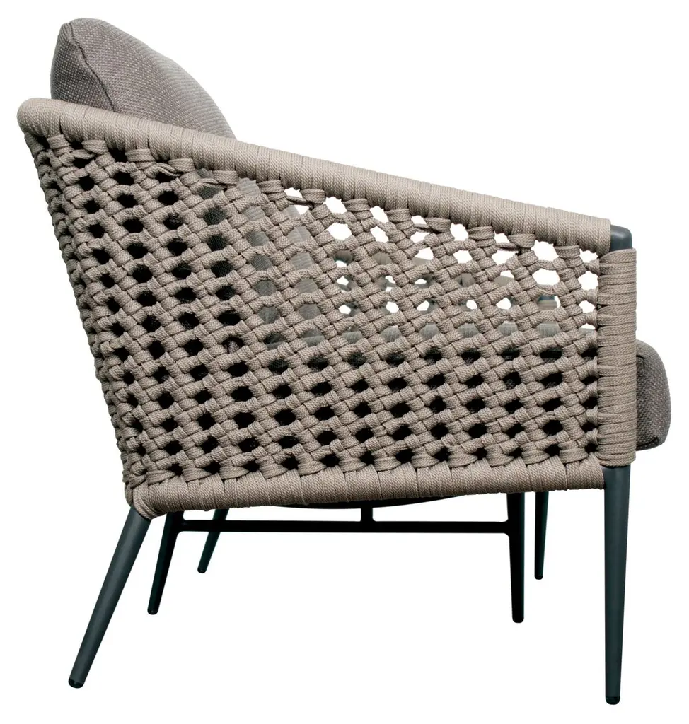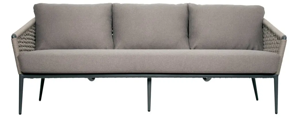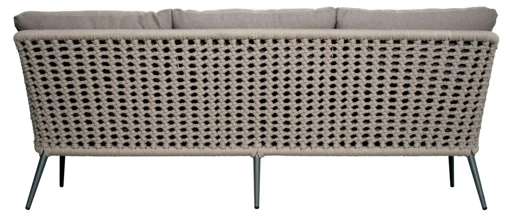 Suitable for indoor or outdoor use, this impressive sofa pairs a powder-coated aluminum frame with fast-drying regatta rope that uses UV-stabilized yarns. Amply padded cushions upholstered in neutral weather-resistant fabric complete the design.