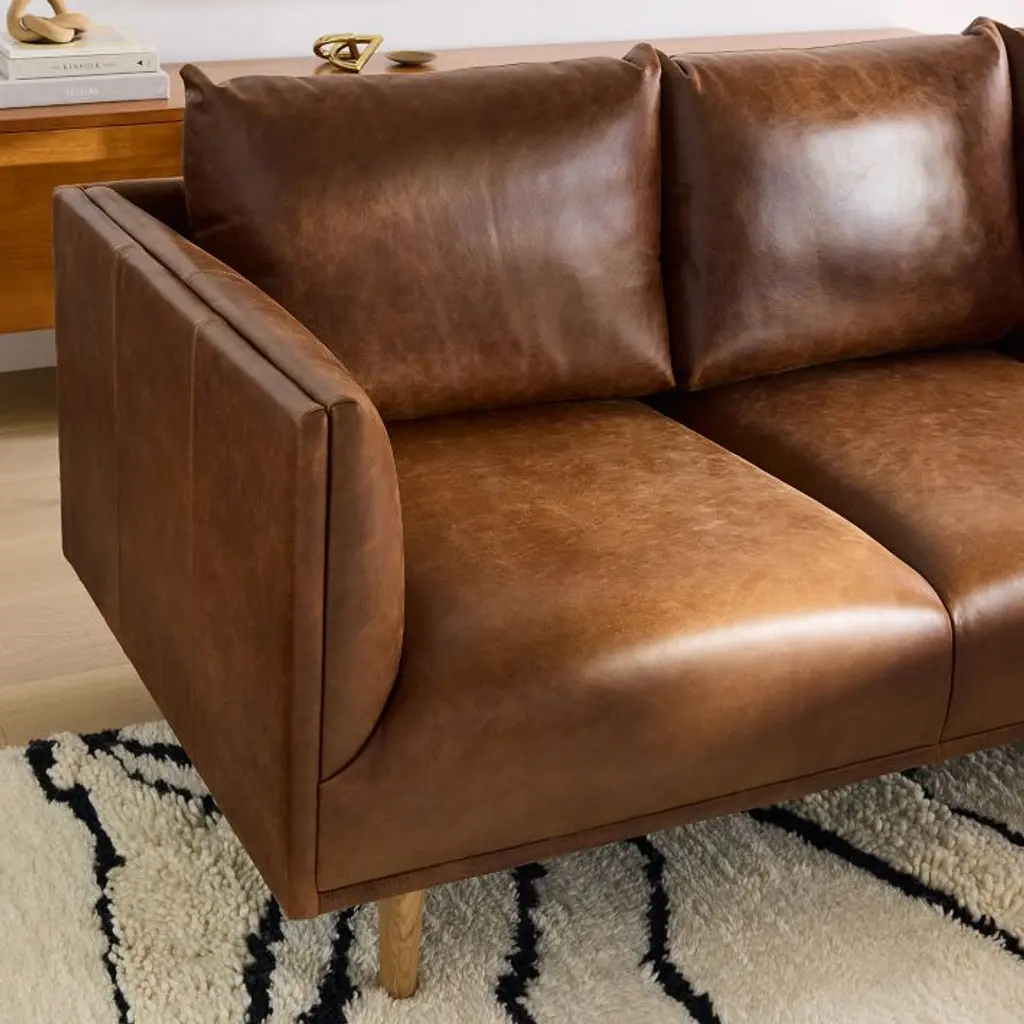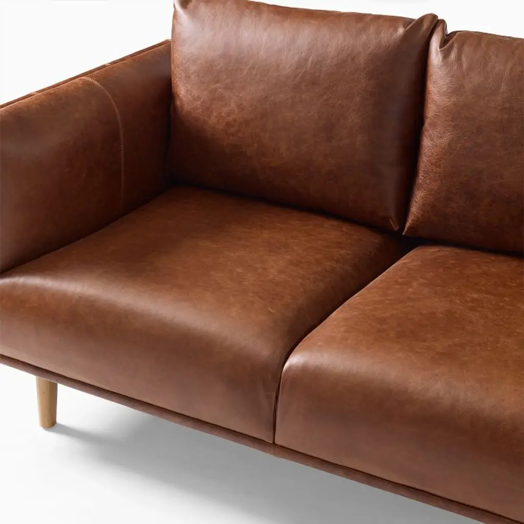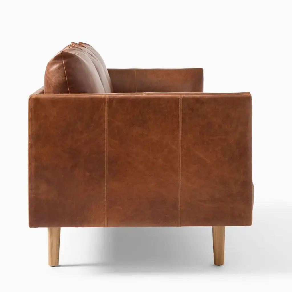 Retro-inspired silhouette lofted by timeless wood legs. Surrounded on all sides by plush, supportive cushioning. Covered in your choice of luxurious leather. Contract Grade, so you know it's built to last.