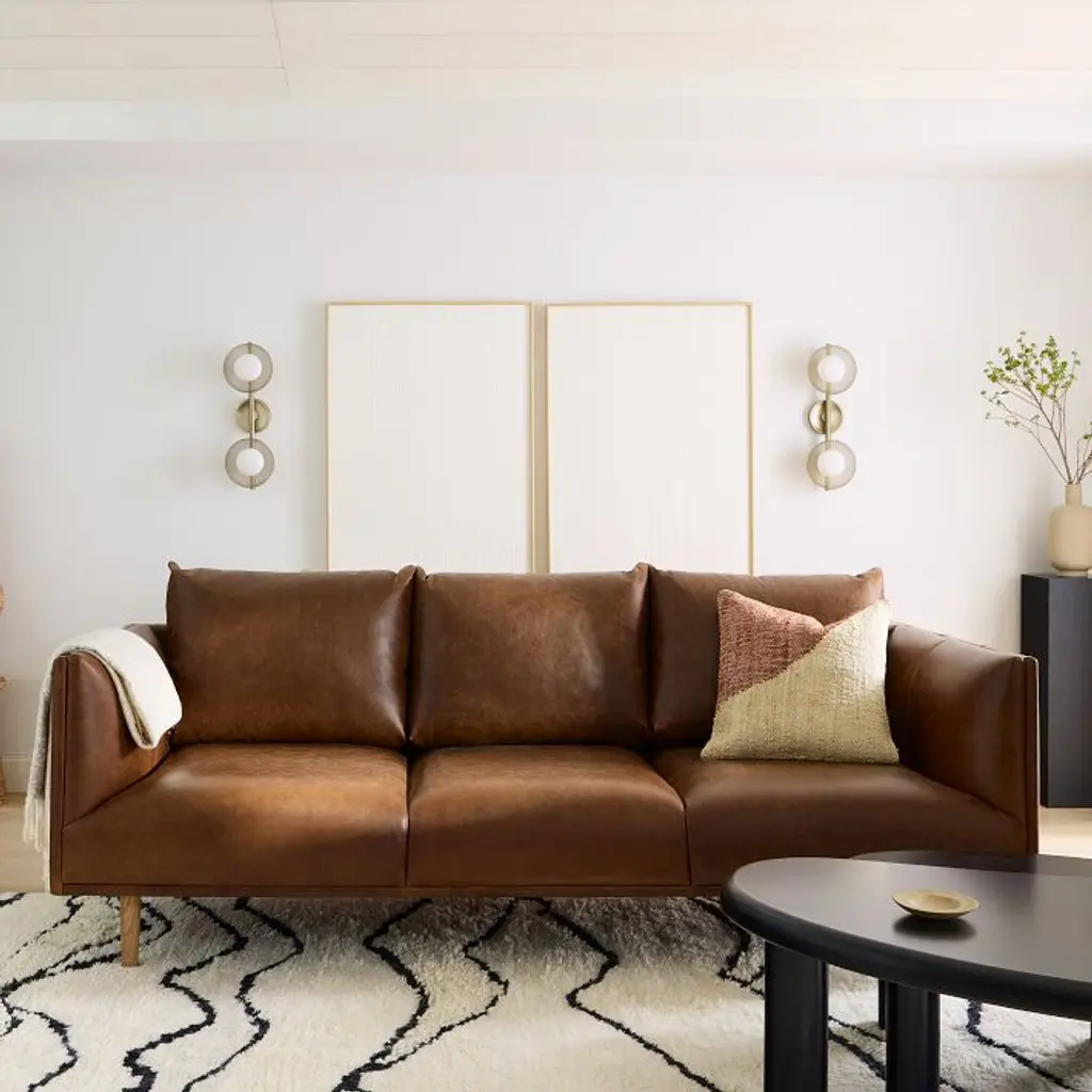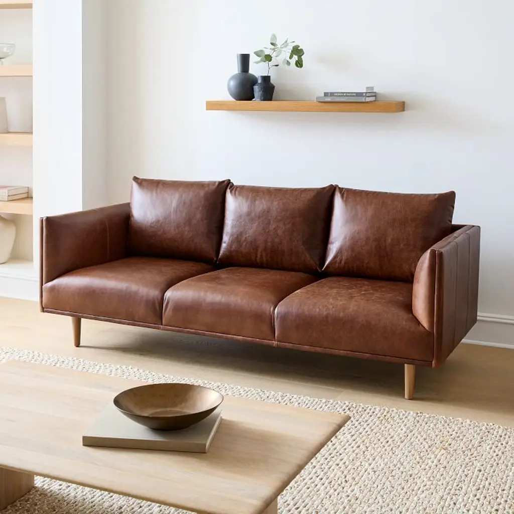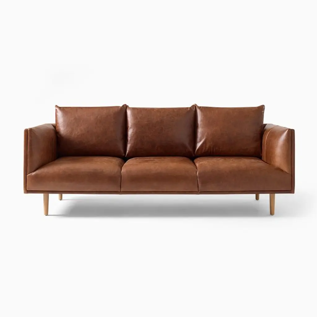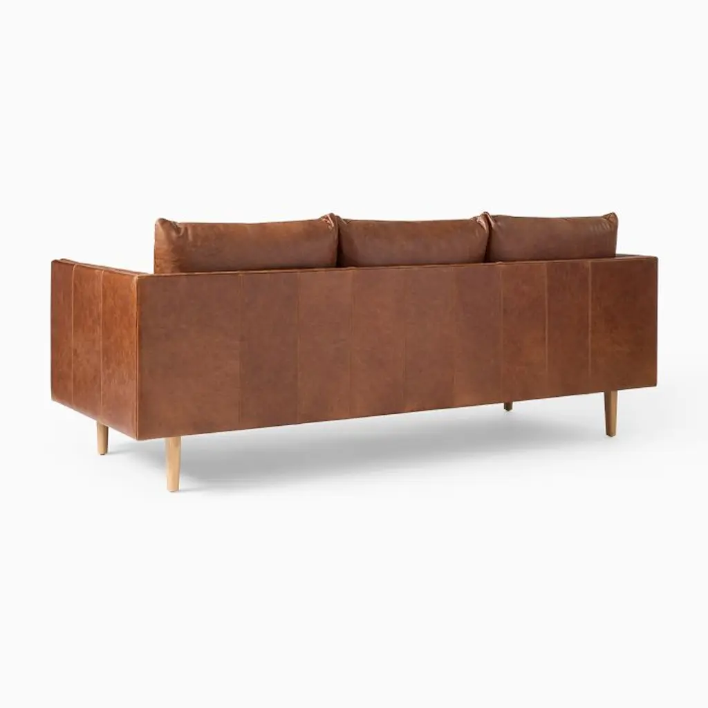 Retro-inspired silhouette lofted by timeless wood legs. Surrounded on all sides by plush, supportive cushioning. Covered in your choice of luxurious leather. Contract Grade, so you know it's built to last.