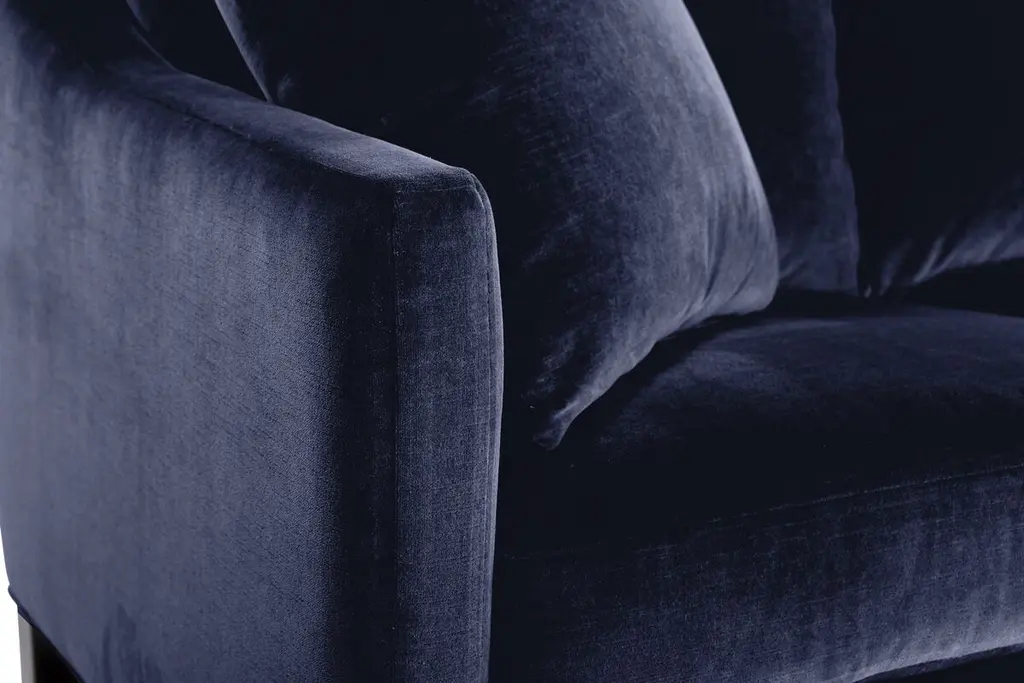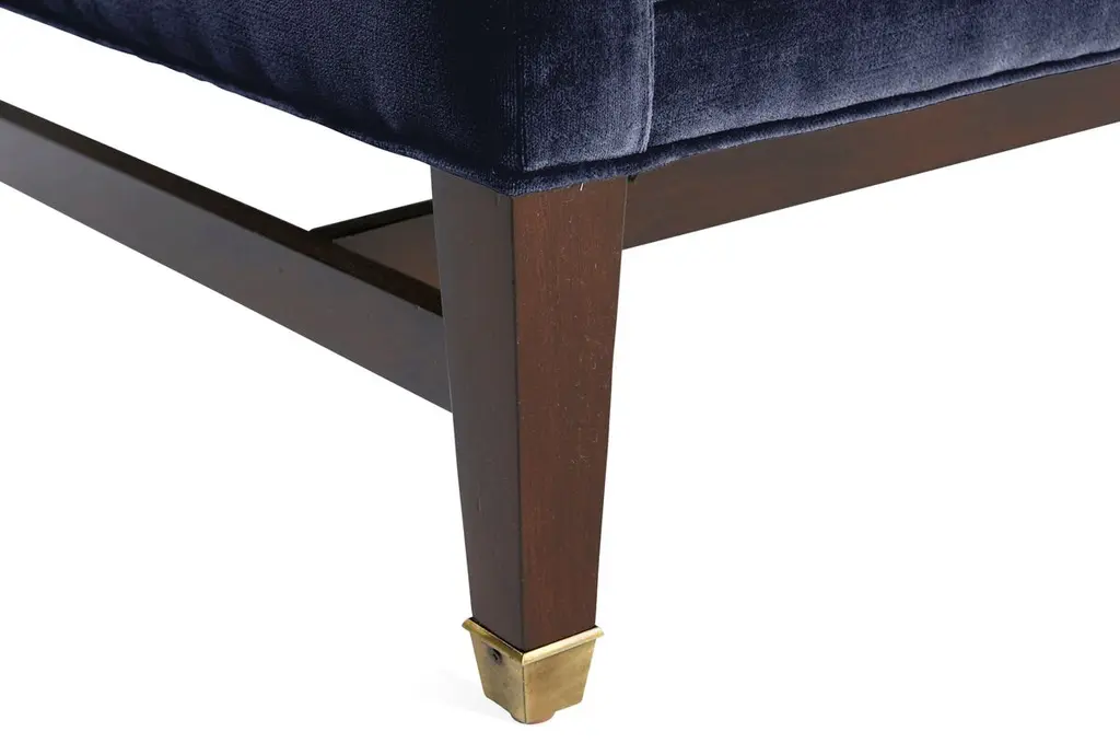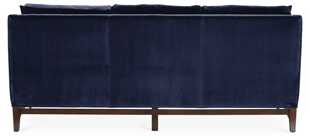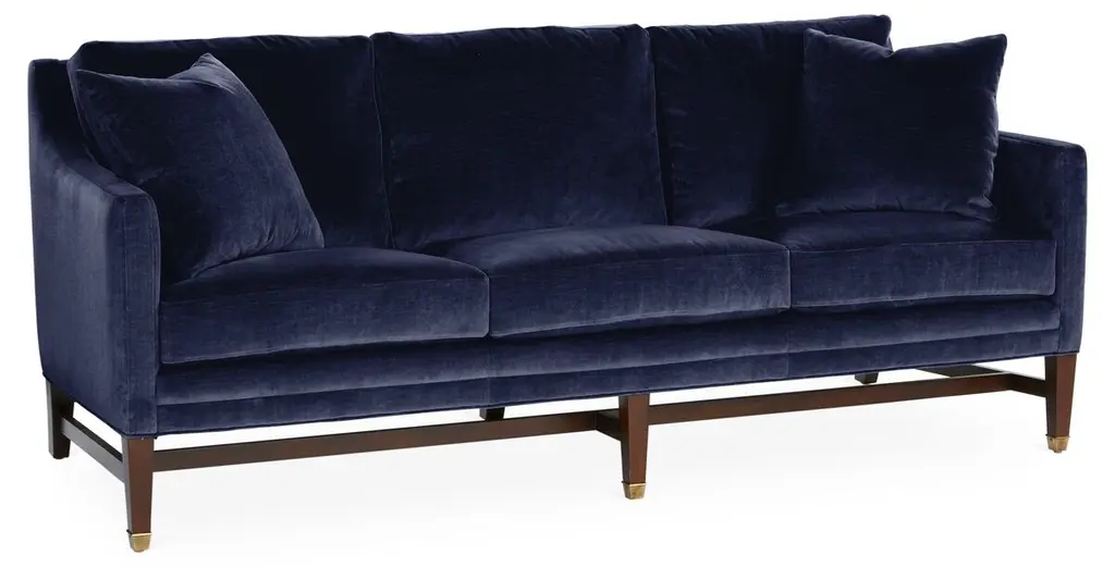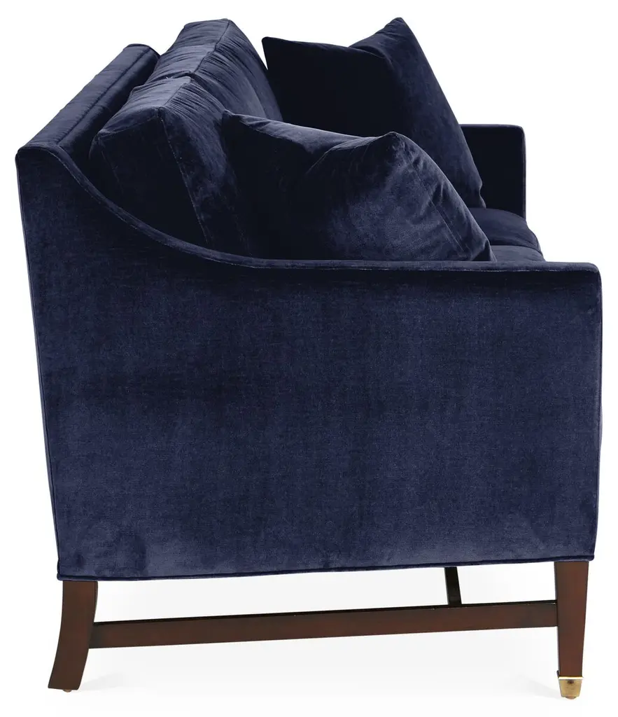 Exclusive to One Kings Lane: This sofa is elevated on a kiln-dried hardwood frame capped in brass ferrules for a look that feels at once structural and light. The swooping arms and loose-back seat cushions are amply filled with high-density foam and feathers and upholstered in luxe lapis-hued velvet, making it a stylish and practical addition to any space. Two matching throw pillows included. Handcrafted in the USA.