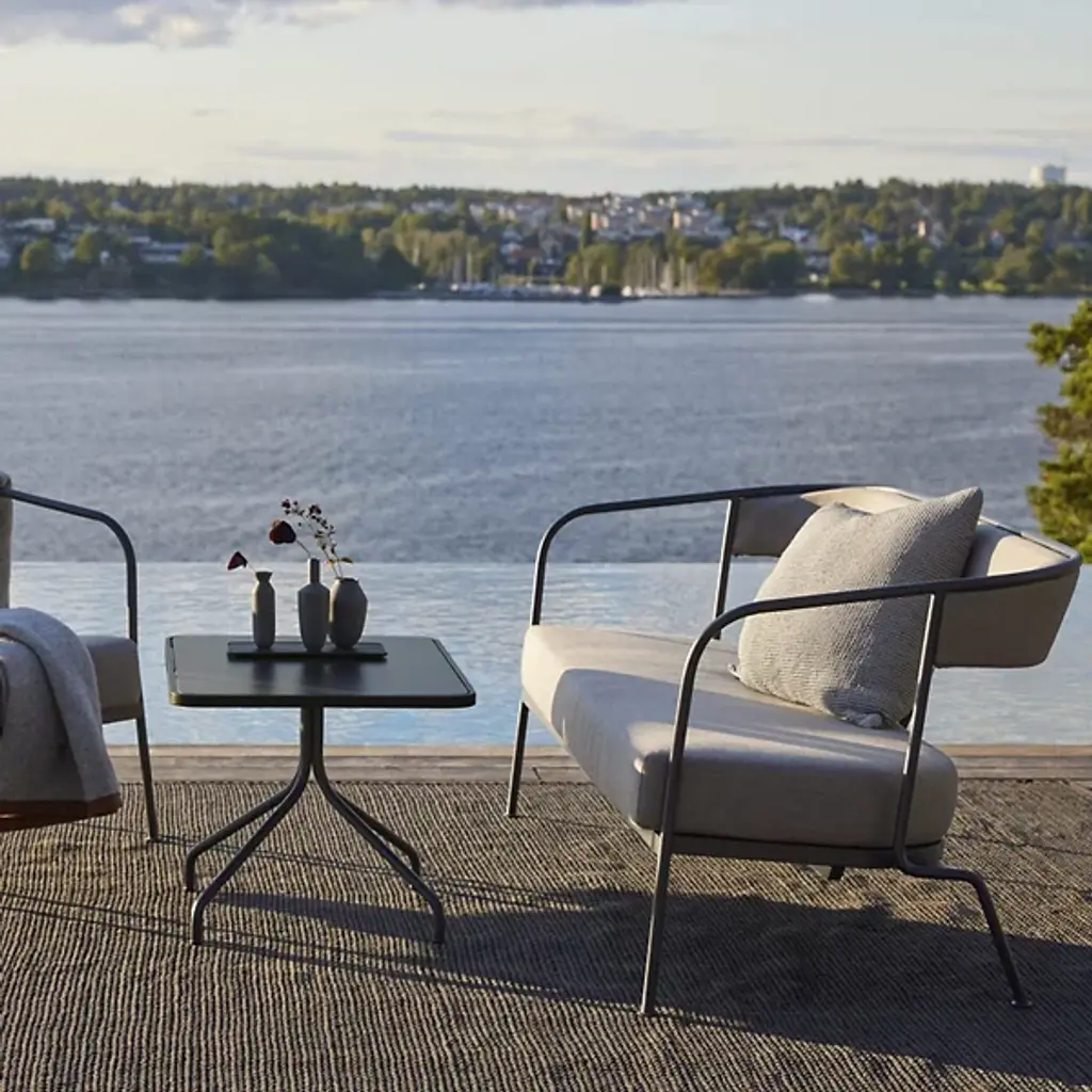 The Arholma Outdoor Sofa by Skargaarden is a minimalist masterpiece that transcends outdoor living. Its sleek dark gray aluminum frame harmonizes effortlessly with the complementary gray Agora Fossil cushions, crafting an aura of contemporary elegance. Experience the epitome of comfort and style as this sofa becomes your sanctuary for relaxation and entertaining. Elevate your outdoor living area to new heights with this piece, showcasing a perfect fusion of sophistication and practicality that will leave a lasting impression