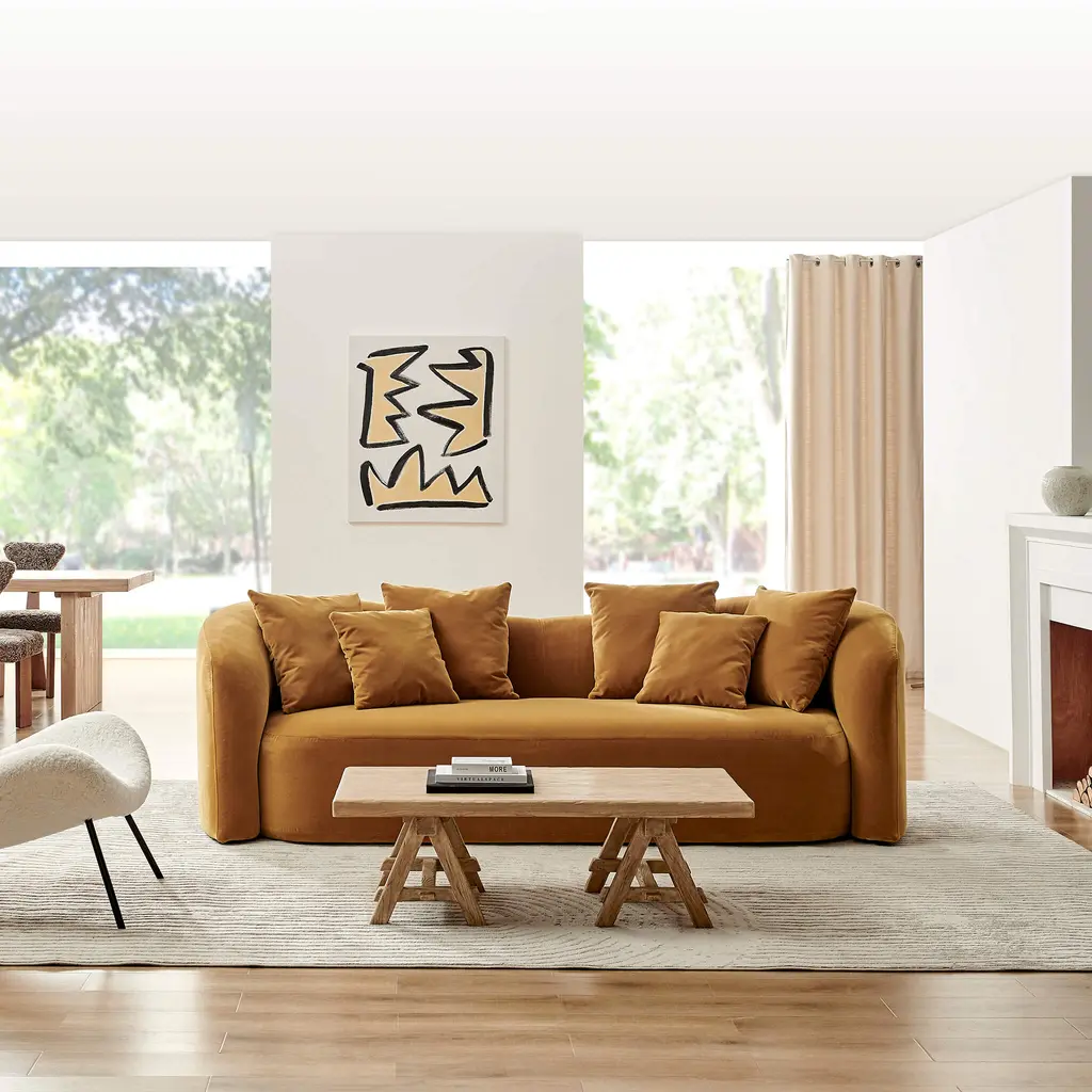Designed to evoke dreams of leisurely evenings and intimate conversations. Embrace the allure of the Aria Modern Curved Back Block Sofa's gracefully curved silhouette and plush upholstery, where captivating composition meets exquisite comfort. It silently beckons with its ethereal beauty, promising moments of serenity and enchantment in your living sanctuary.