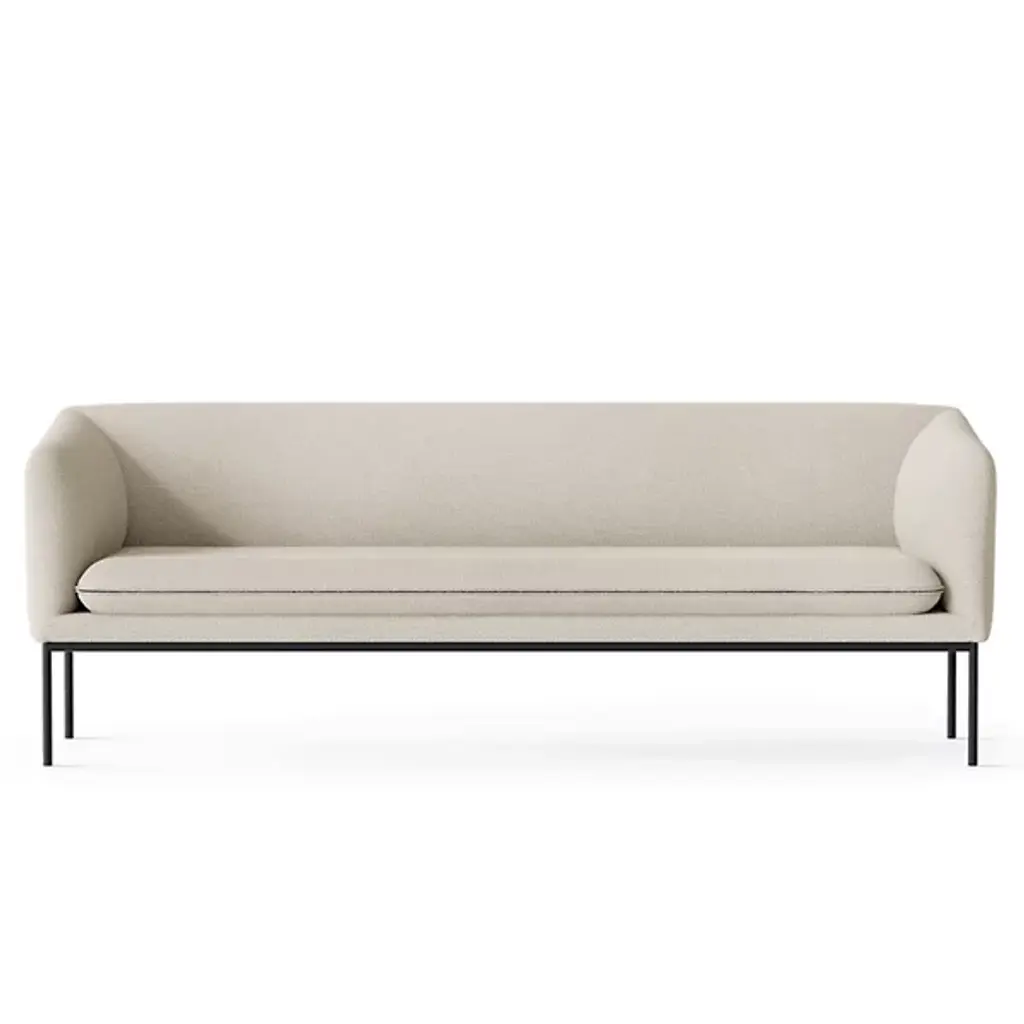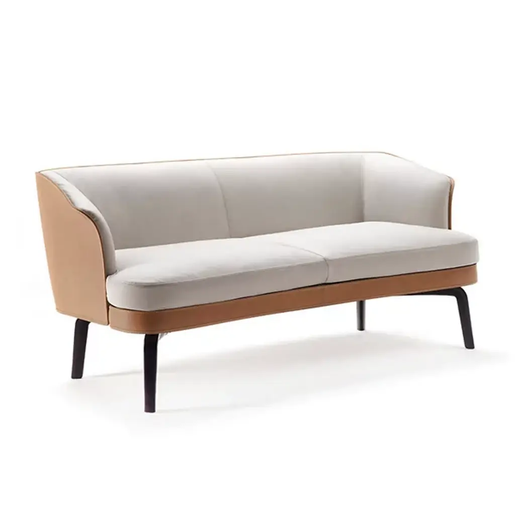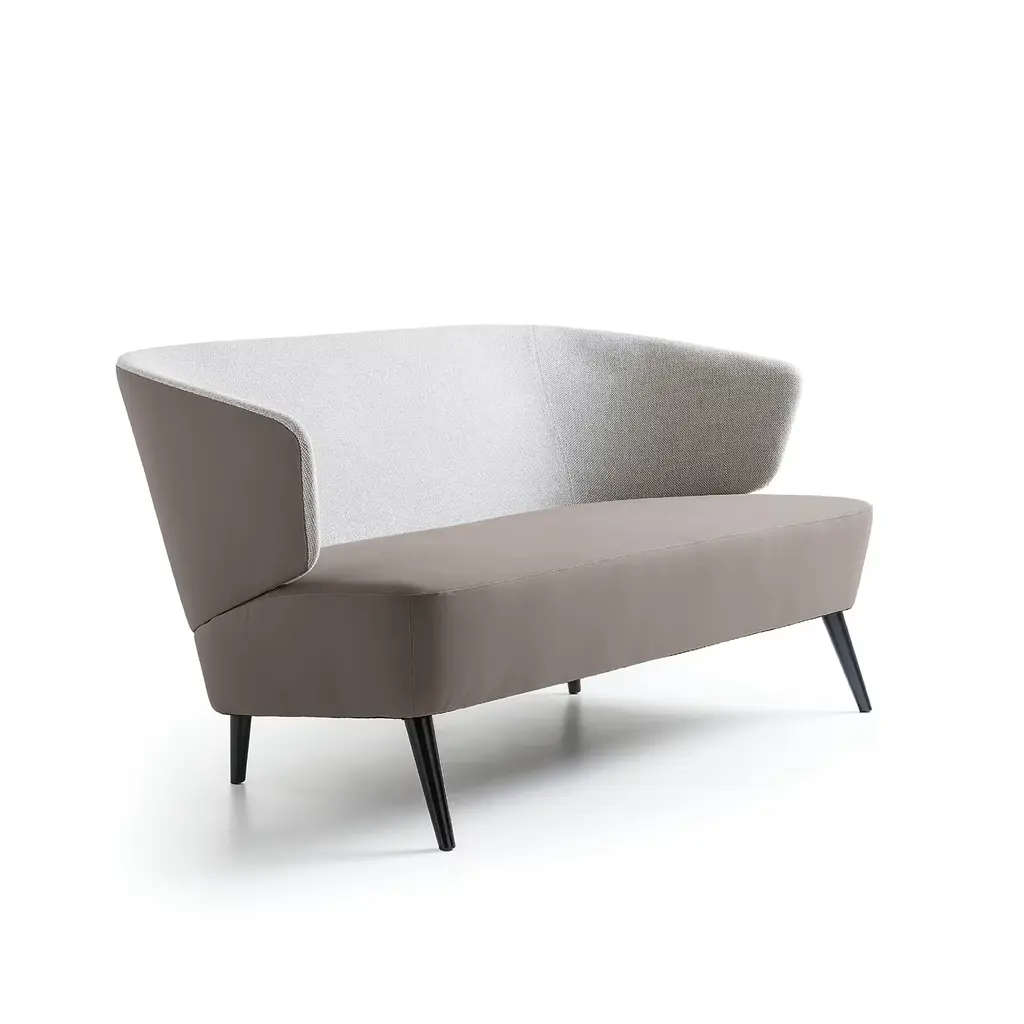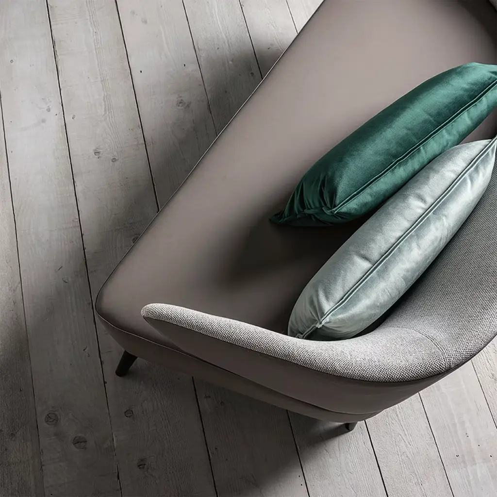 An essential sofa that combines modern forms with the contemporary taste of slow living, giving lightness and warmth to the environment. Upholstered with dove eco-leather and fabric, with a black wooden base.
