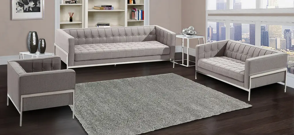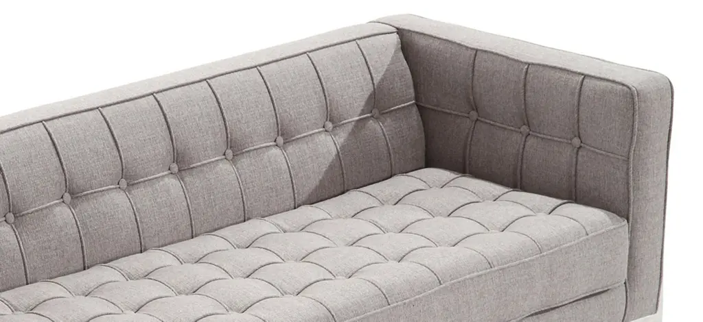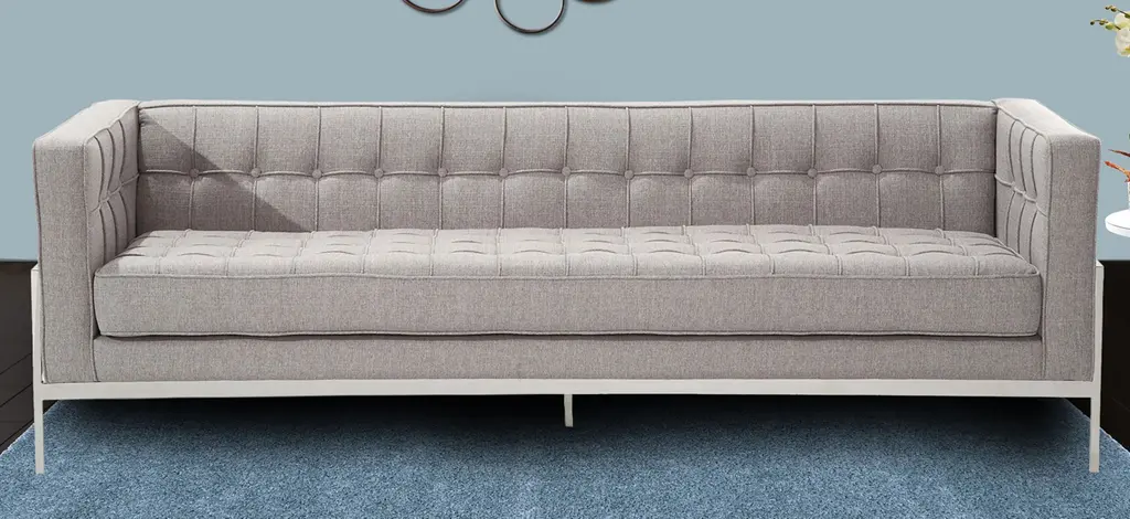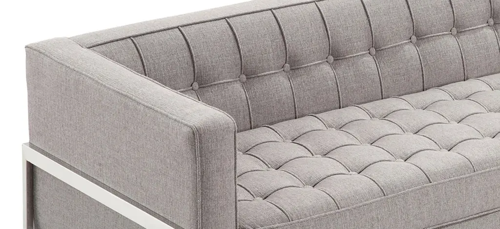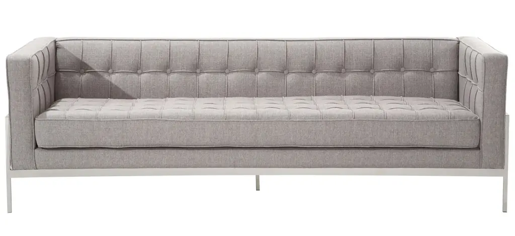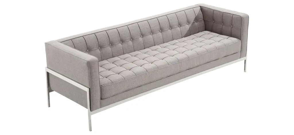 The Arsene sofa is a stunning example of contemporary beauty sure to make a statement in any modern living room or lounge area. The Arsene's stainless steel metal frame is both stylish and sturdy. The sofa's tweed upholstery is beautifully button tufted and plush, presenting an inviting aesthetic and an exceptional level of comfort. Pair the Arsene sofa with other mid-century pieces for added cohesion and harmony.The Arsene sofa is a stunning example of contemporary beauty sure to make a statement in any modern living room or lounge area. The Arsene's stainless steel metal frame is both stylish and sturdy. The sofa's tweed upholstery is beautifully button tufted and plush, presenting an inviting aesthetic and an exceptional level of comfort. Pair the Arsene sofa with other mid-century pieces for added cohesion and harmony.