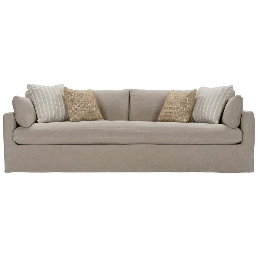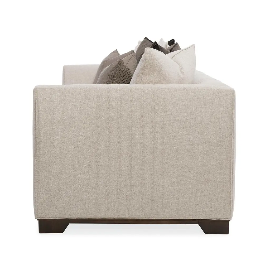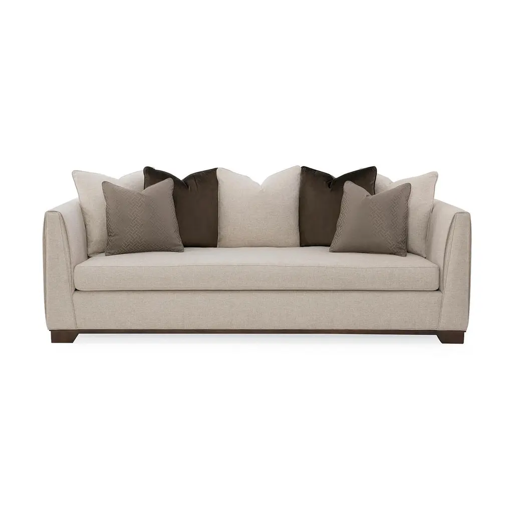 This sofa with squared corners is impeccably tailored. Fully encased in soft brushed neutral linen-look fabric, the back and arms have a vertical stitch detail and a slender blanket wrap feature that envelopes the tapered track arm design. The bench seat adds to its streamlined appeal. Three matching throw pillows are paired with two velvet pillows in a rich espresso and two contrasting pillows showcasing an enlarged herringbone pattern in a lighter espresso shade. Perched on low platform feet and finished in Bourbon Glaze, this is a bespoke piece for contemporary living.Dimensions: 88.75" W x 38.5" D x 29" HSeat - 18.75" HArm - 28.75" H.