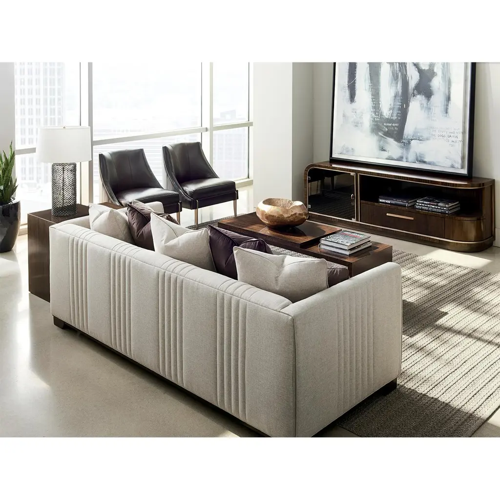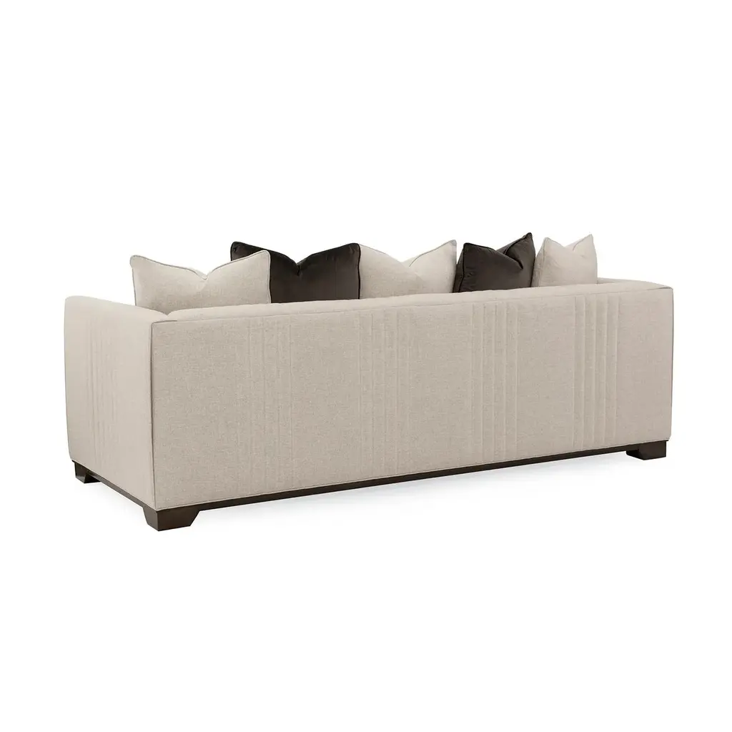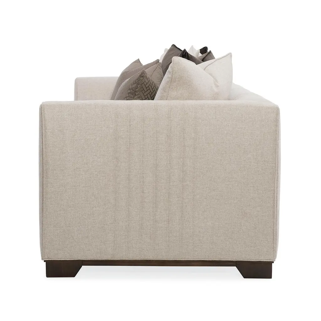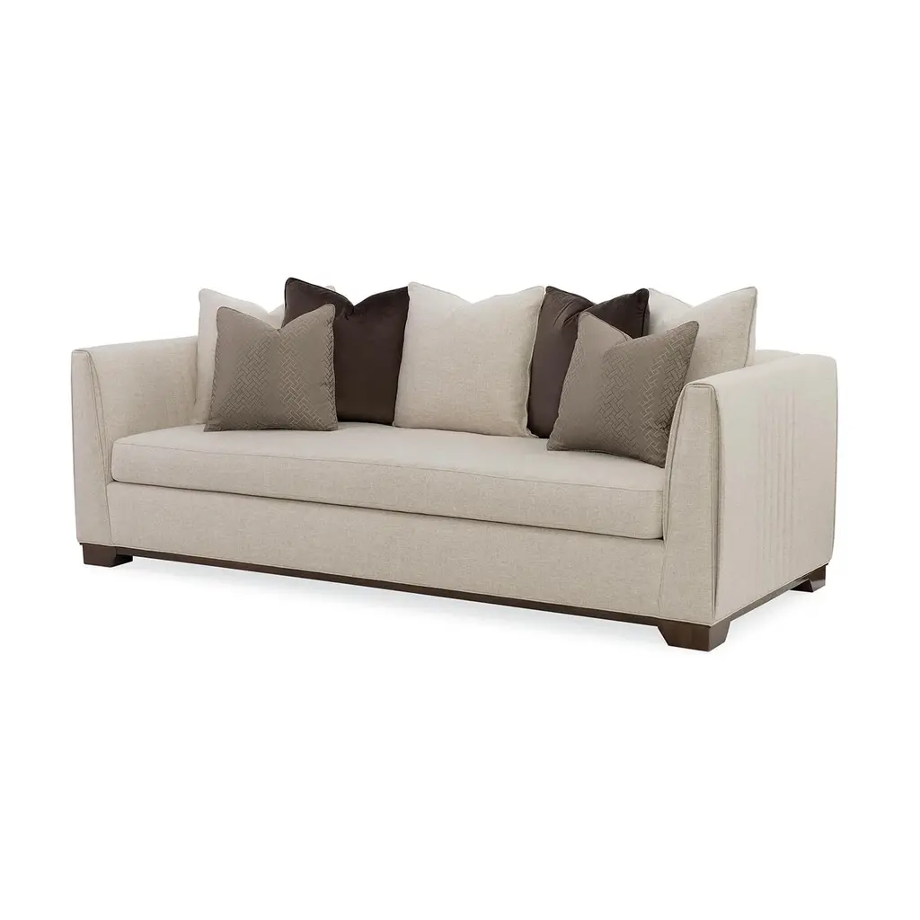 This sofa with squared corners is impeccably tailored. Fully encased in soft brushed neutral linen-look fabric, the back and arms have a vertical stitch detail and a slender blanket wrap feature that envelopes the tapered track arm design. The bench seat adds to its streamlined appeal. Three matching throw pillows are paired with two velvet pillows in a rich espresso and two contrasting pillows showcasing an enlarged herringbone pattern in a lighter espresso shade. Perched on low platform feet and finished in Bourbon Glaze, this is a bespoke piece for contemporary living. Dimensions: 88.75" W x 38.5" D x 29" H Seat - 18.75" H Arm - 28.75" H