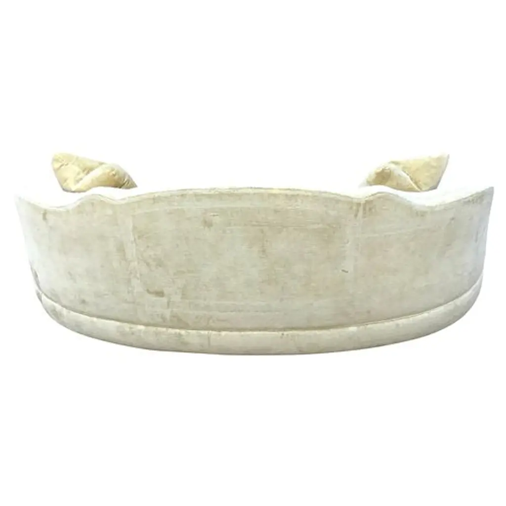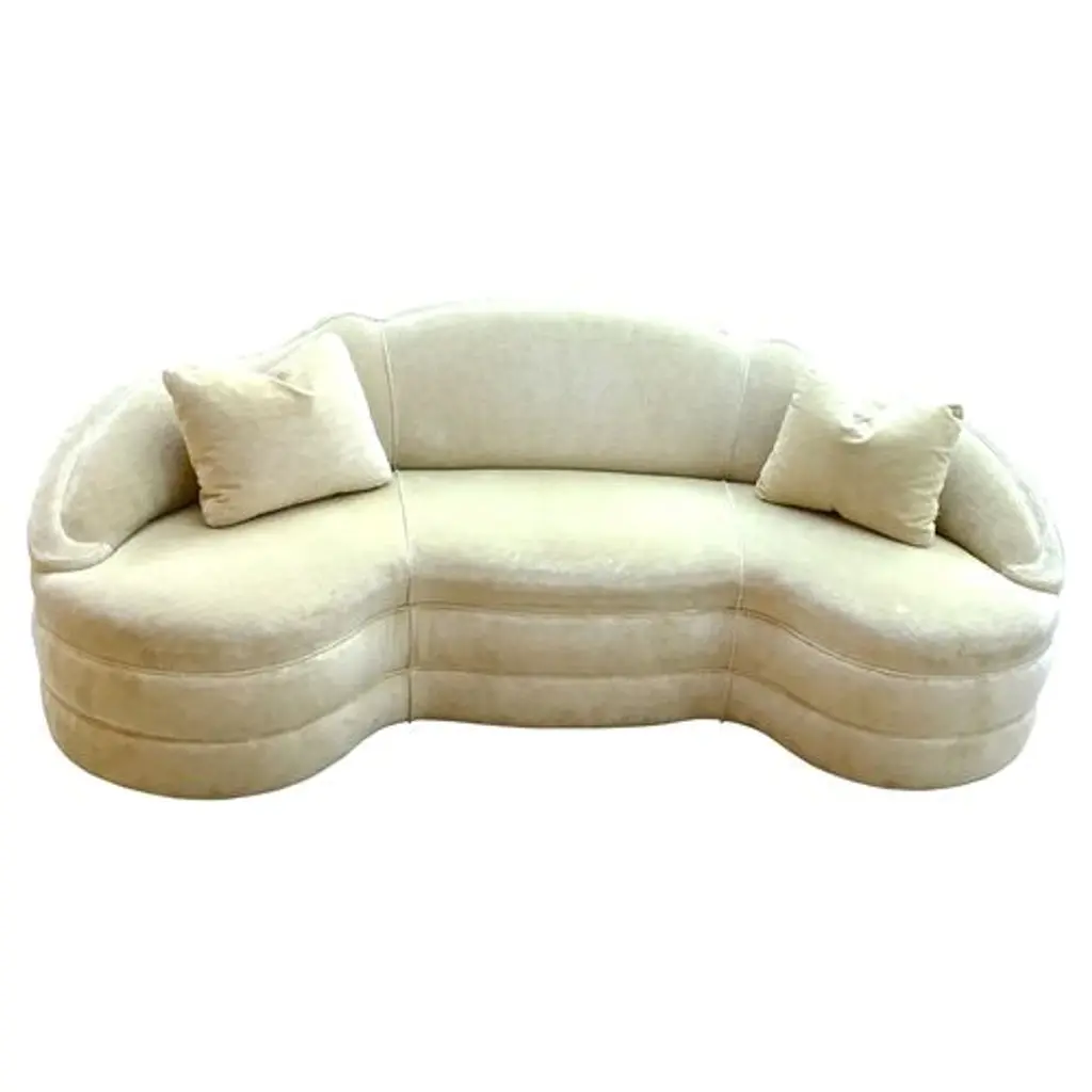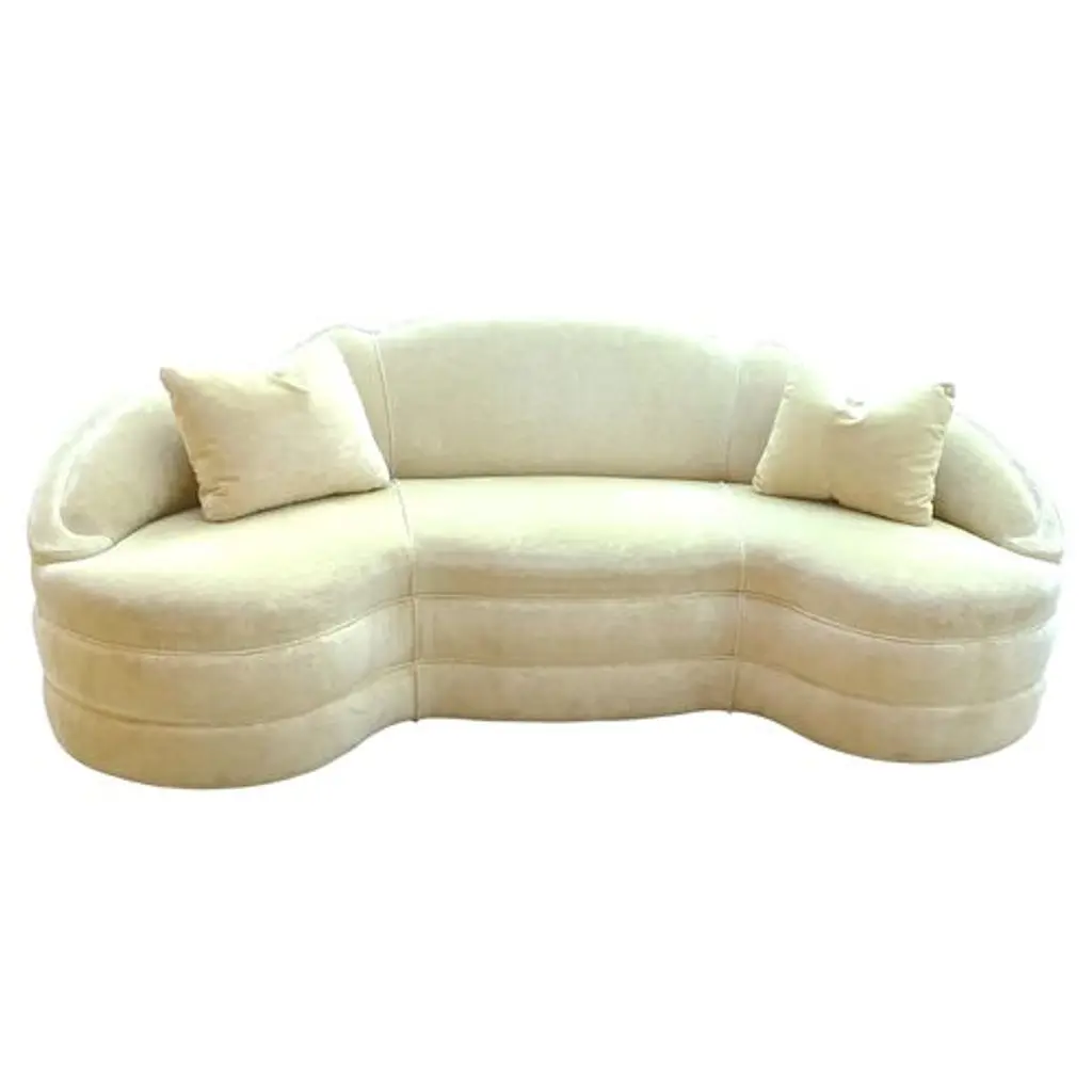 Vintage Art Deco sofa with a stylized curved scalloped cloud-like design upholstered in a neutral linen velvet. Seat: 19"H. Arms: 24"H. Pillows: 19"L x 6"W x 15"H.