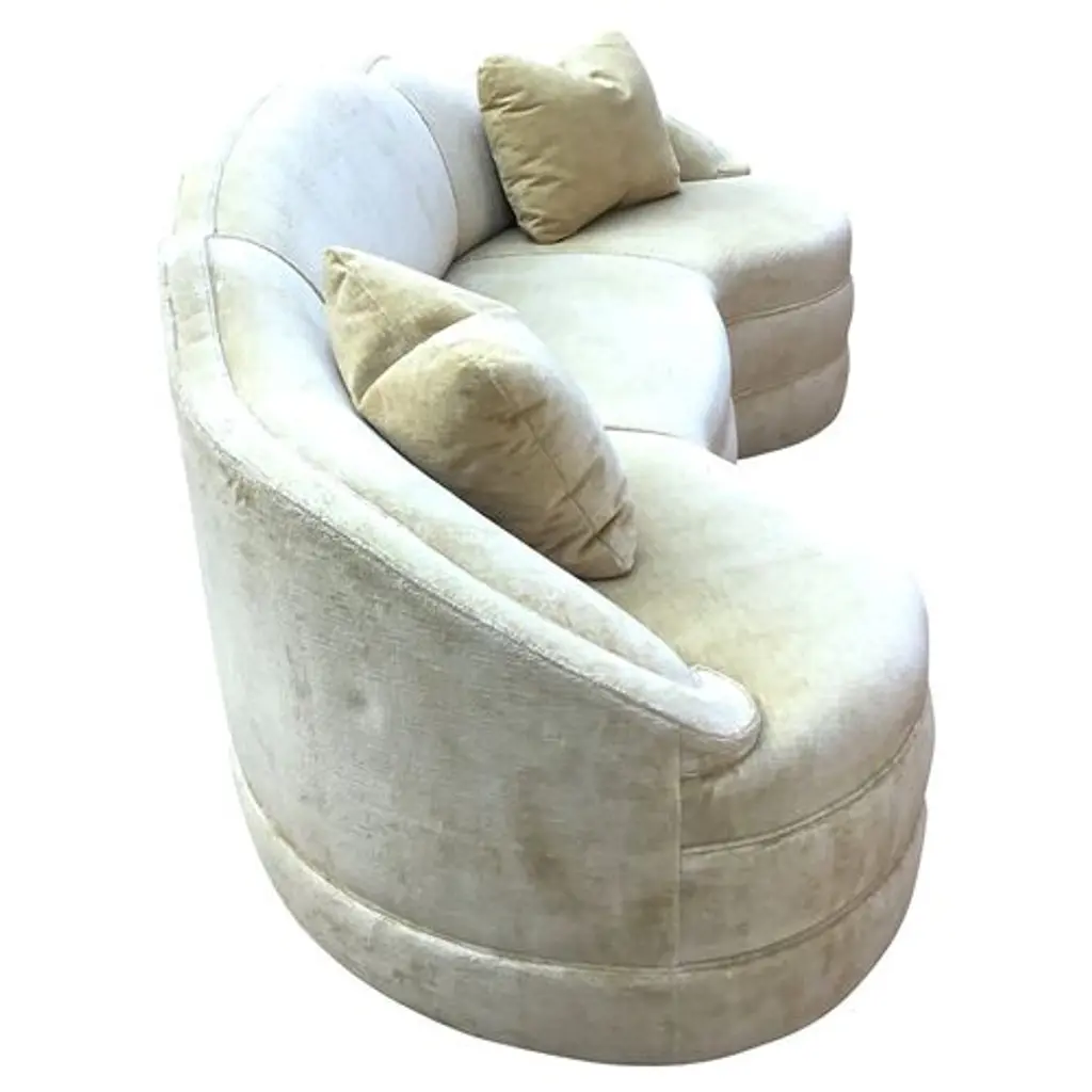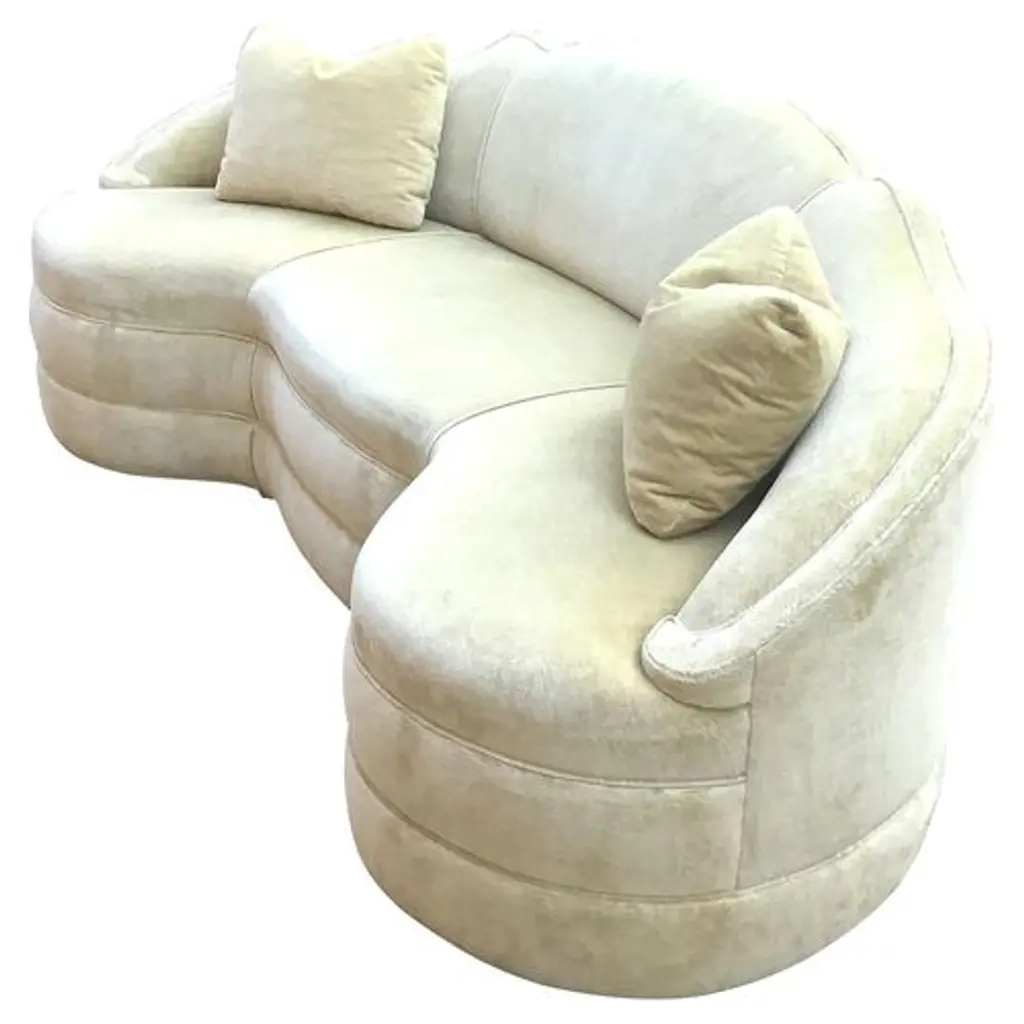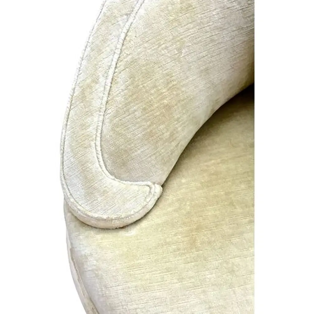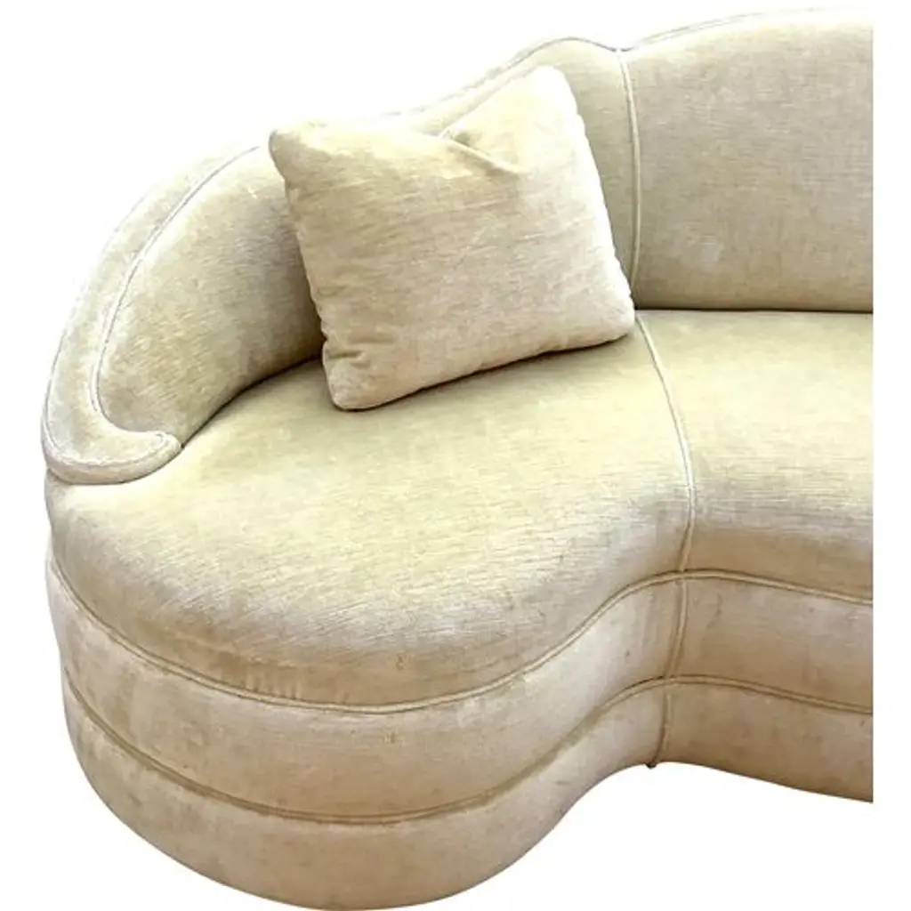 Vintage Art Deco sofa with a stylized curved scalloped cloud-like design upholstered in a neutral linen velvet. Seat: 19"H. Arms: 24"H. Pillows: 19"L x 6"W x 15"H.