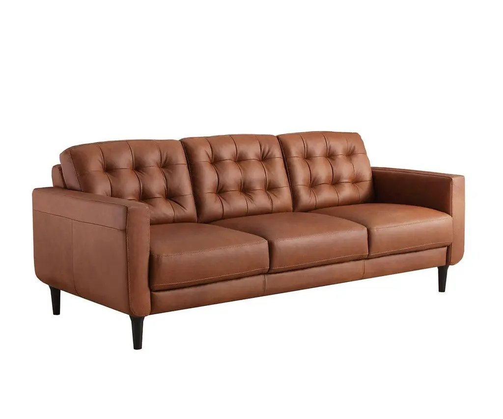 Made in Italy, the Arturo Leather Sofa features a classic mid-century design. The versatile style of this piece renders it easily paired with a wide variety of modern and rustic decor. Upholstered in top-grain leather, this sofa can be paired with the rest of the Arturo Collection, or it can stand solo in any living room or family room. Featuring an eye-catching tufted design, track arms and tapering legs, this stylish sofa is ready to become your new favorite destination for rest and relaxation.