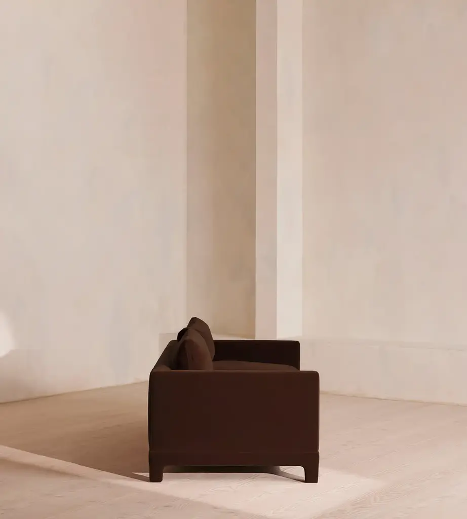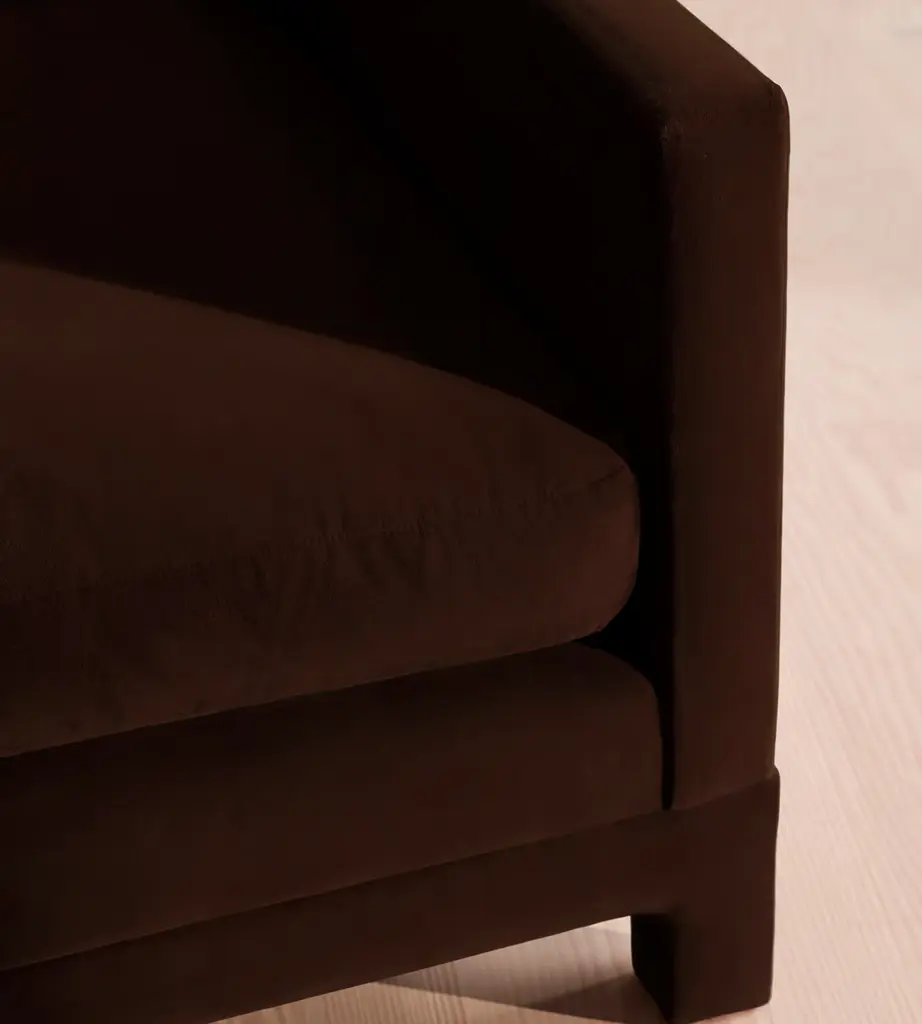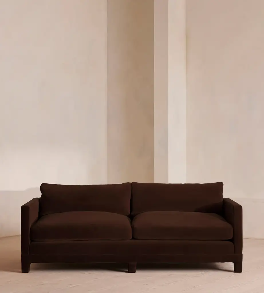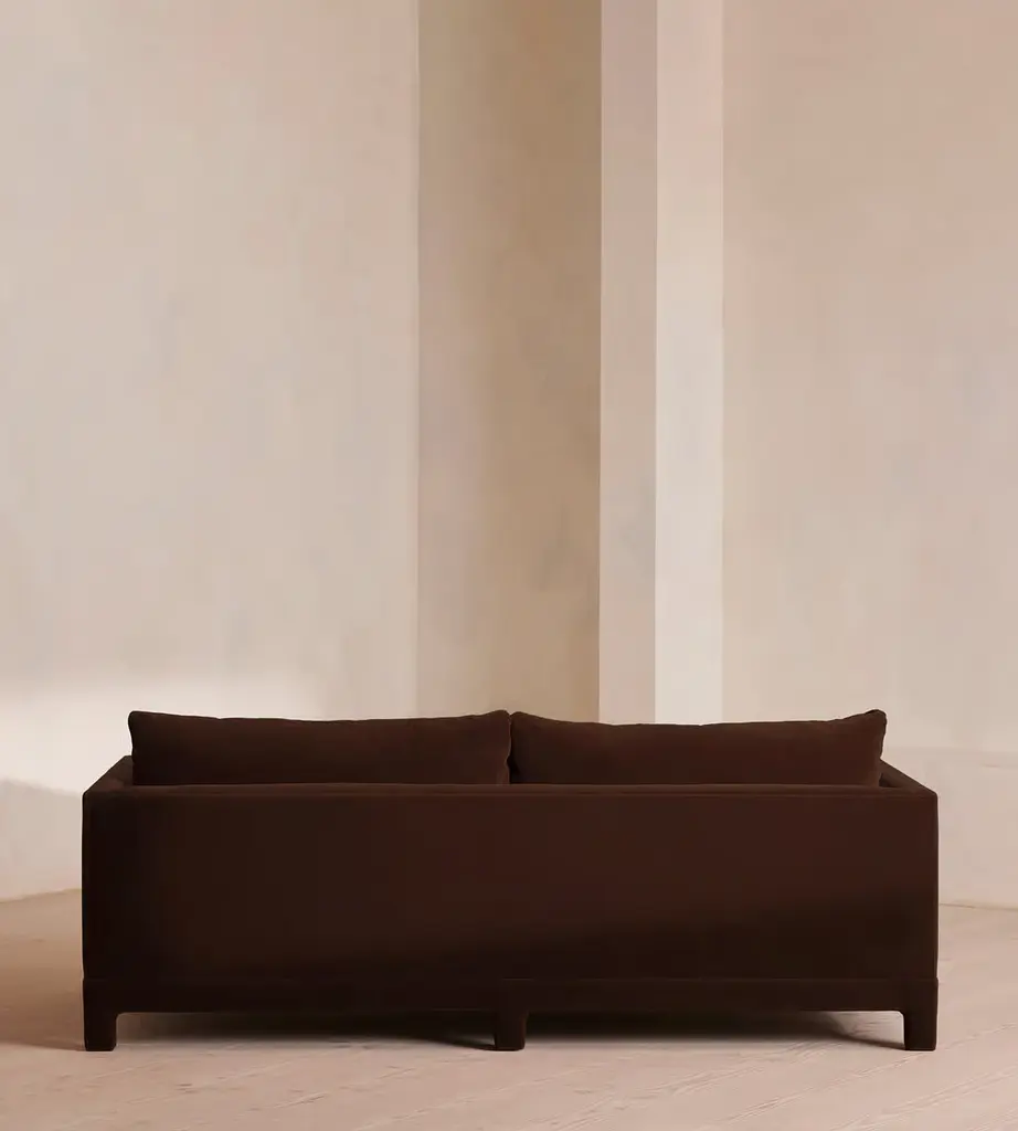 A structured silhouette defined by angular arms is softened by feather-wrapped velvet cushions. Referencing the seating areas of Brooklyn's DUMBO House, the three-seater Ashford sofa's structured silhouette is contrasted against velvet upholstery that comes in our full range of made-to-order colors. Trimmed with angular arms, its wide, deep seats are fitted with feather-wrapped cushions.