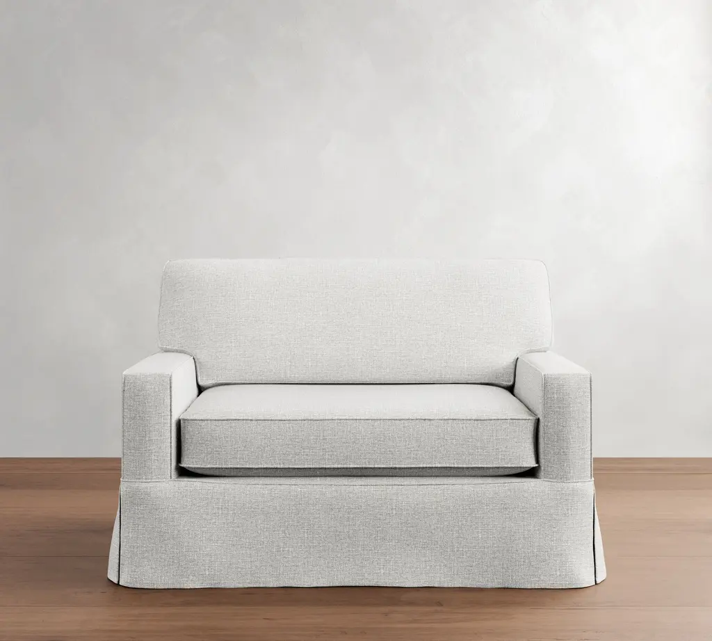 The Ashton Fog Grey Fabric 77" Skirted Sofa combines traditional elegance with a touch of farmhouse charm. Upholstered in a high-performance fabric, this sofa features a soft and relaxed designer style, perfect for any living space. The firm comfort level ensures lasting support, while the piping detail and flirty kick pleat skirt add a sophisticated touch.
