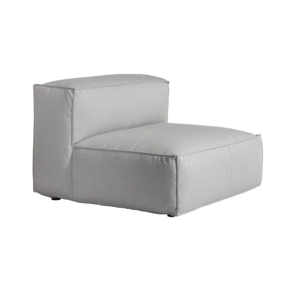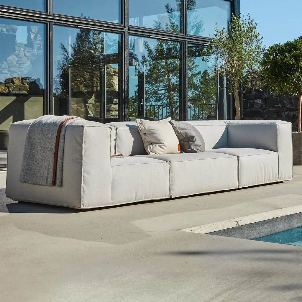 A boxy sofa range, for those who enjoy relaxing more than maintenance. The latter isn’t an issue, since it has an aluminum frame, hidden under generous cushions in QuickDry foam, covered in Sunbrella fabrics. Features