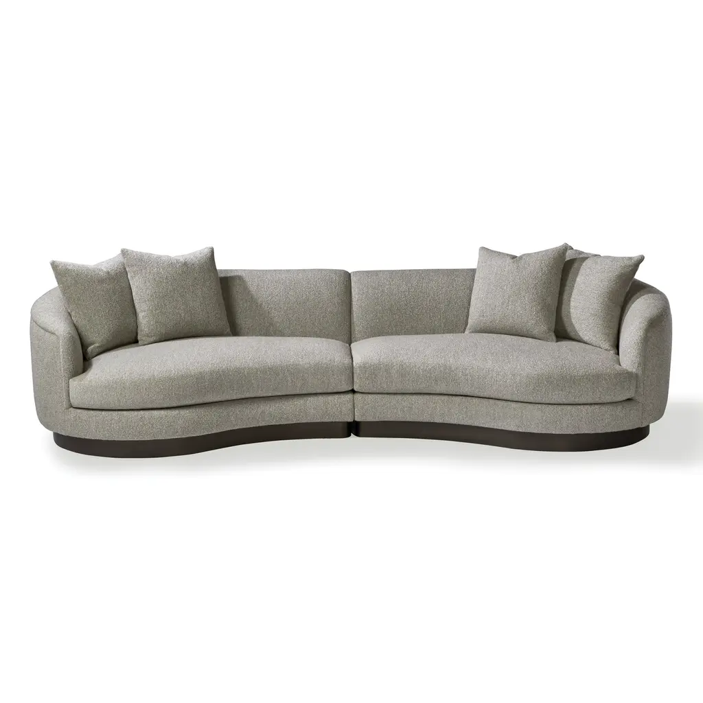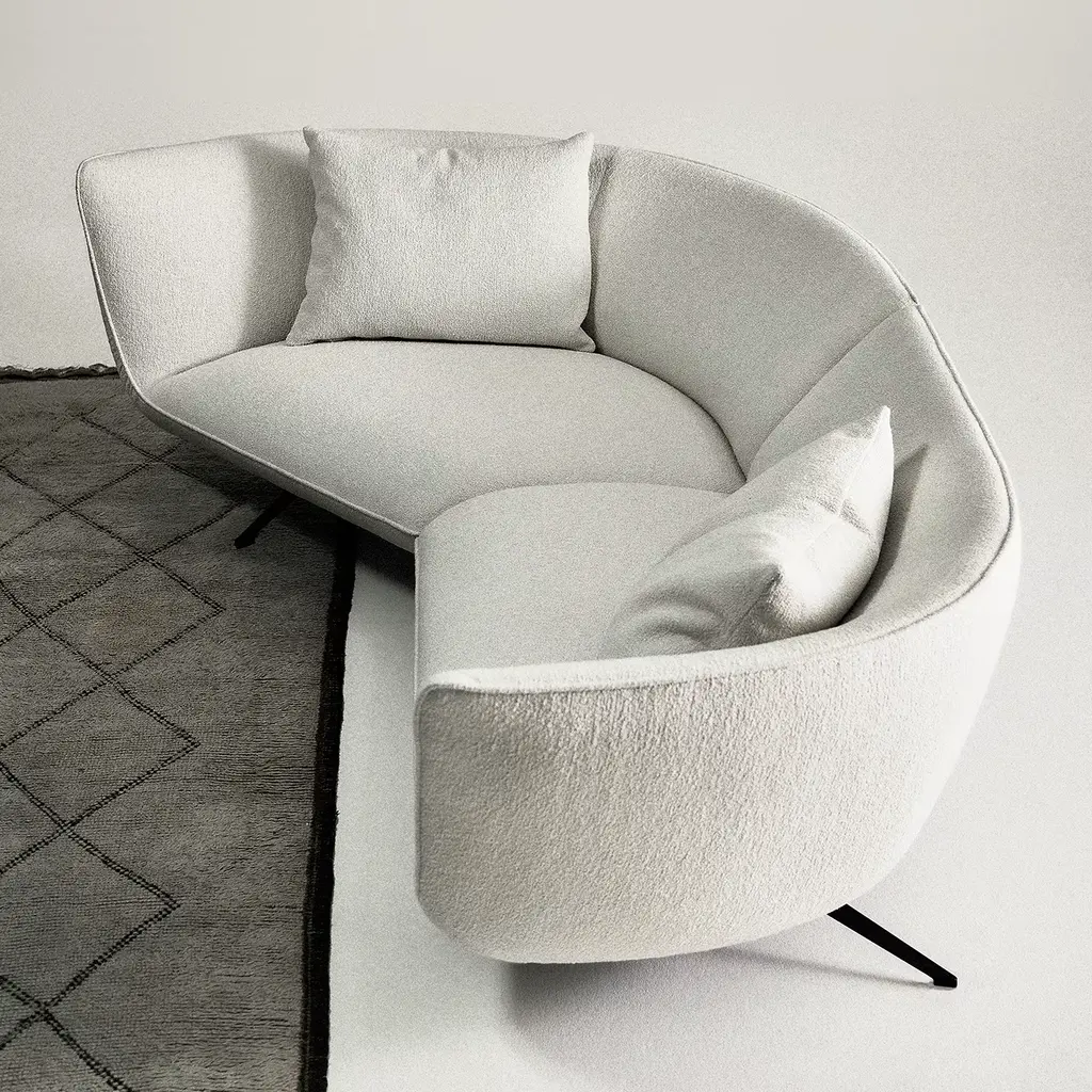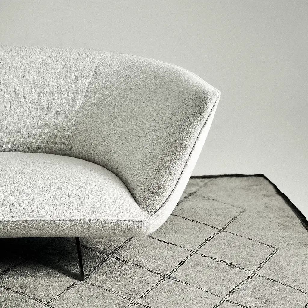 Enveloping and luminous, this sofa was designed to transform rooms' corners into islands of pure comfort. The lightweight metal base creates with the structure a dialogue of solids and voids where two symmetrical modules have their welcoming feel enhanced by the backrest's flared cut. Covered in off-white Barnum boucle fabric for an intriguing tactile feel. Decorative cushions are included.