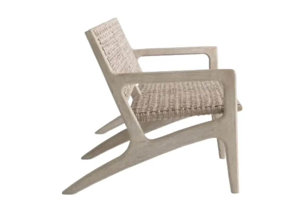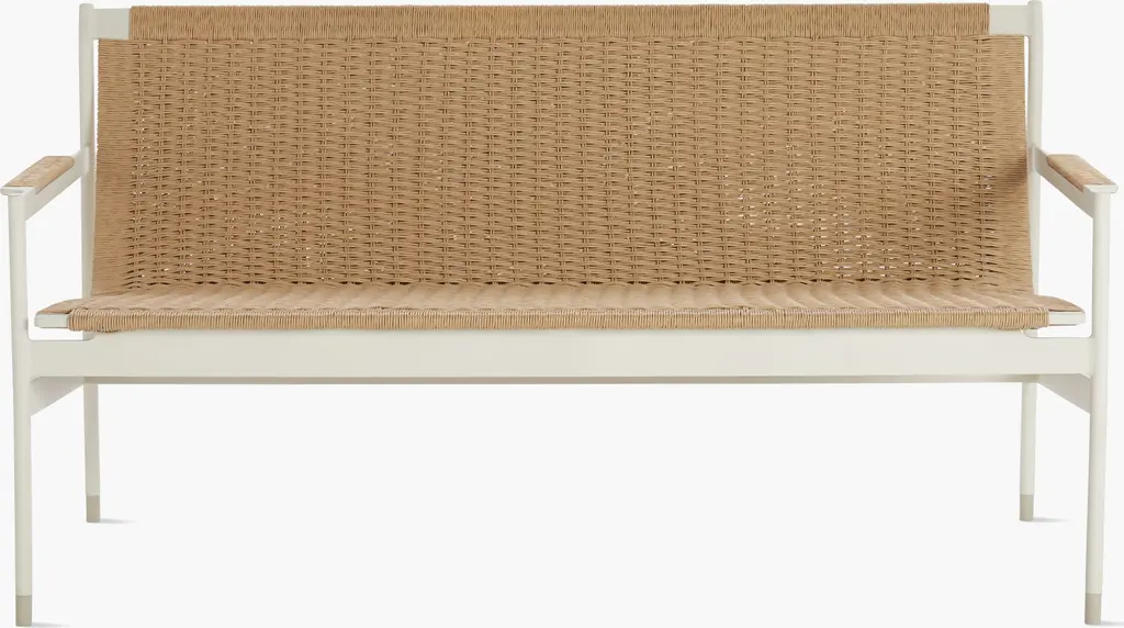 This textured outdoor sofa features an open weave wicker design on a teak wood frame for an all-weather addition. Its casual look is complemented by its bench seat and back with a mix of sled-shaped and straight legs. Style on the patio or deck with the matching chairs for a collected feel.