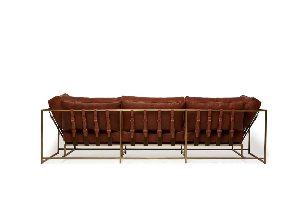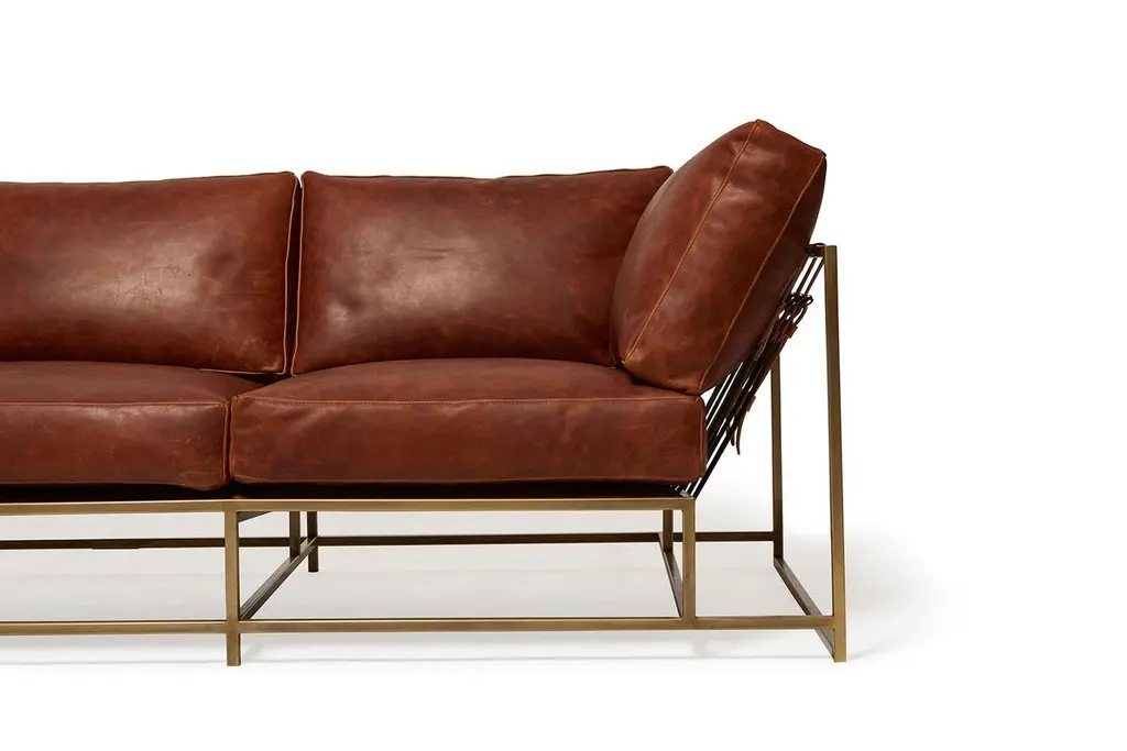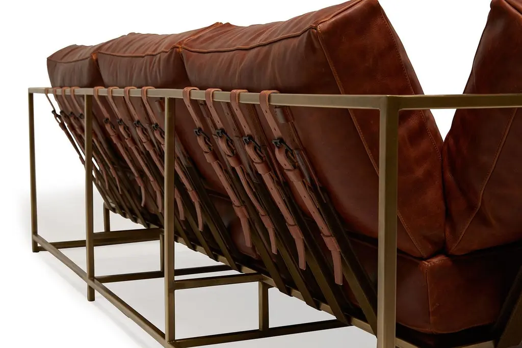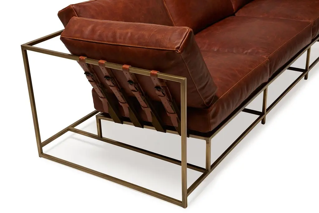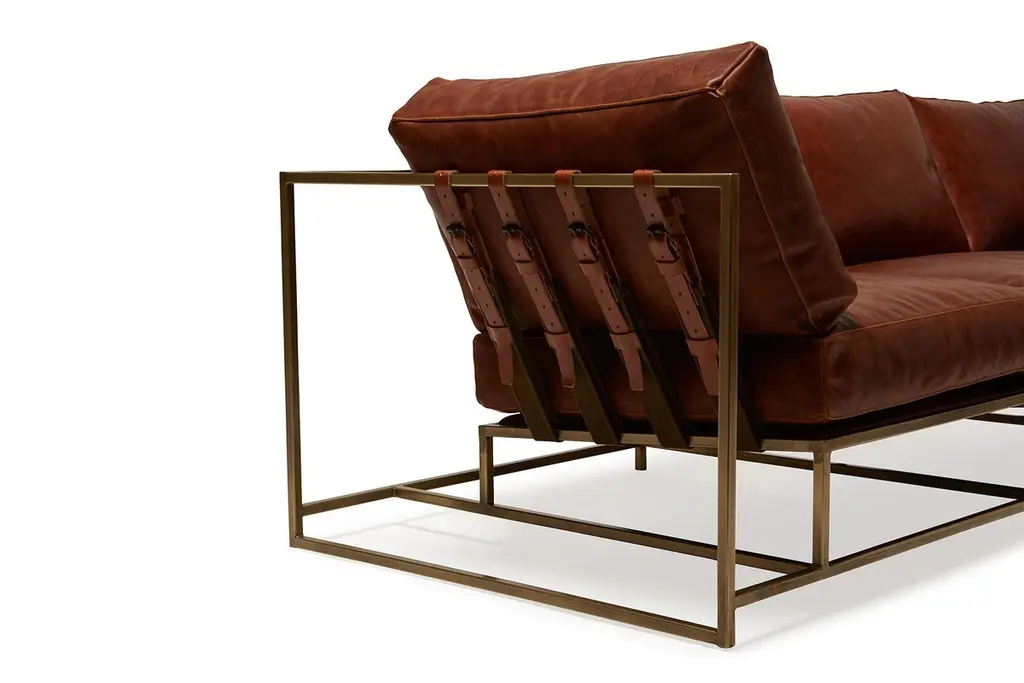 Conceived in 2011, this sofa design was the first piece in The Inheritance Collection by Stephen Kenn. Beginning from a place of curiosity about how furniture was constructed, the collection is a result of reimagining typical upholstered seating.This variation is upholstered in a deep auburn leather with a unique wax-textured finish. The foam seat cushions have been wrapped in down, allowing for a soft and comfortable lounge experience. Sitting atop an antique brass plated steel frame, the piece has support belts featuring olive cotton webbing, cognac leather, and blackened steel buckles.Every Stephen Kenn piece is made to order through our Los Angeles studio. We create these pieces utilizing a number of small businesses and fabricators in the LA area. We welcome inquiries about custom dimensions or custom material combinations to best fit your space and personal aesthetic.