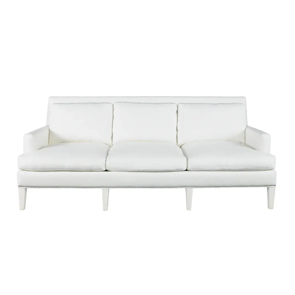This elegant Audrey Sofa features a boxy silhouette with nail trim detailing, adding a touch of sophistication to any living space. The comfortable seat is perfect for lounging or entertaining guests, with wood tapered legs providing both stability and style. Choose from a variety of fabric options to customize the Audrey Sofa to suit your personal taste and decor. The Audrey collection also includes a loveseat and a chair (sold separately). Ships In 8-10 Weeks Three loose back pillows Three seat cushions As Shown Fabric: Affinity White As Shown Finish: Washed Linen If you choose to purchase COM, once you have placed your order a customer service rep will contact you regarding where to send your fabric. Please note that current lead time is 17-19 weeks once your fabric arrives at the factory, and if unused fabric is under 1.5 yards, it cannot be sent back to you.This product can be special ordered in additional fabrics, leathers, finishes, and cushion fillings. Click here to email us for for additional information about special ordering.This image is for illustrative purposes only. The colors shown are accurate within the constraints of lighting, photography, and the color accuracy of your screen.
