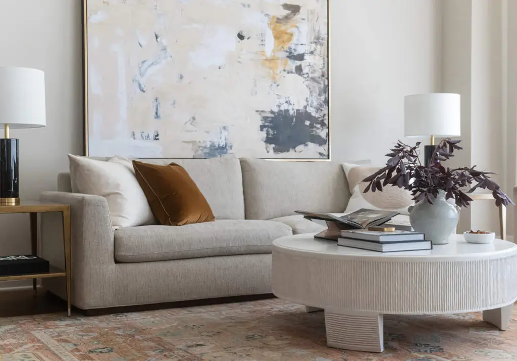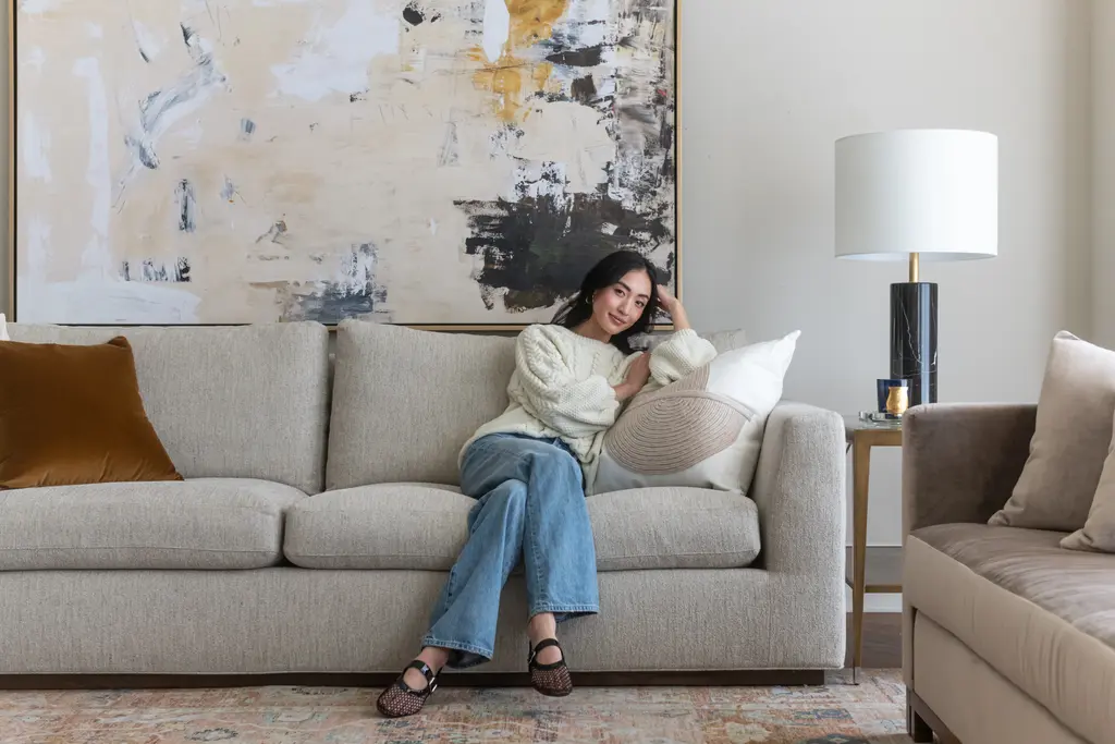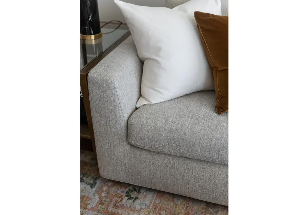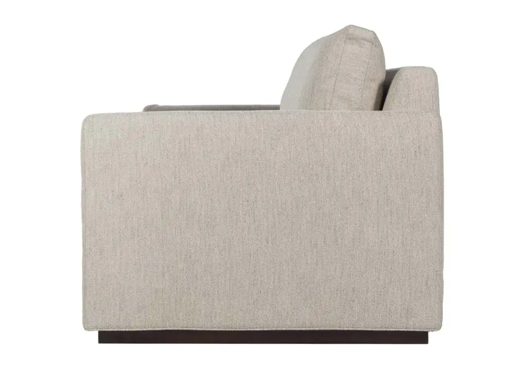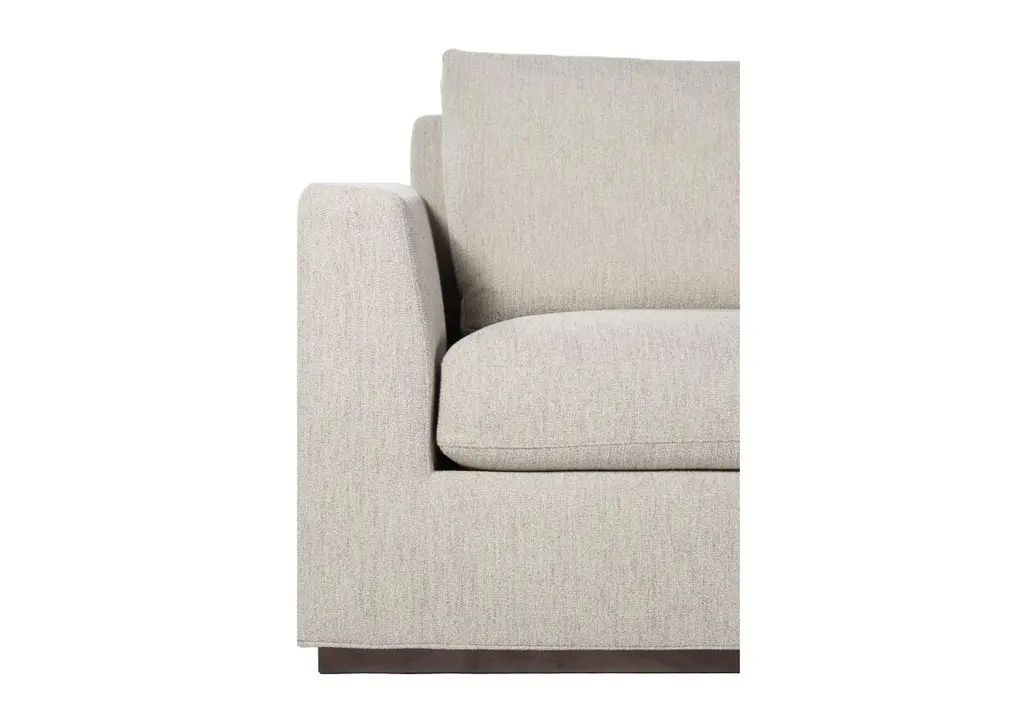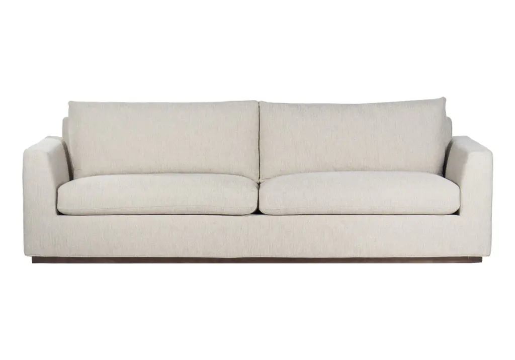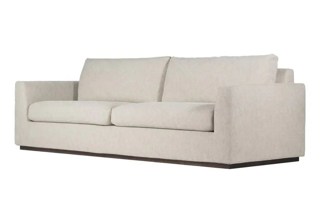 Final Sale The August Sofa is designed with generous proportions. The angled arms and walnut-stained plinth base add dimension and interest making this piece beautifully suited for spacious living or family rooms. Its neutral woven fabric is subtly accented with a blue loop undertone for added depth. The August Sofa is the perfect blend of sophistication and comfort for every space.