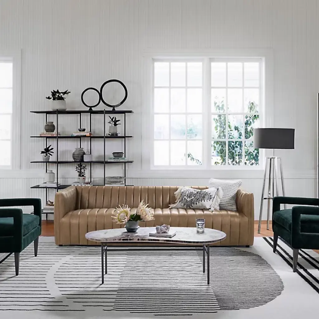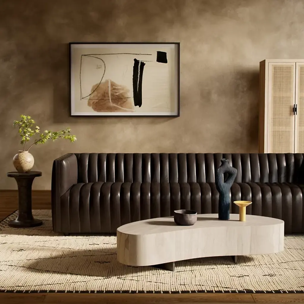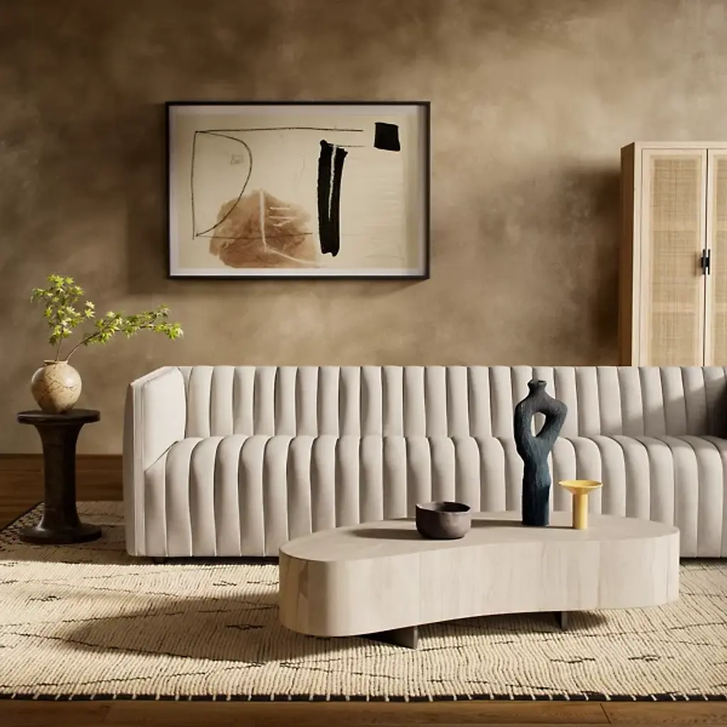 The Augustine Sofa from Four Hands redefines comfort with its dramatically channeled design. Upholstered in a luxurious dover crescent linen blend, this sofa offers a crisp, clean aesthetic while providing an incredibly sumptuous seating experience. The fabric's viscose, polyester, and flax composition creates a durable yet soft texture. Beneath its stylish exterior, this piece of furniture features a sturdy poplar plywood frame and high-density foam cushioning, ensuring long-lasting support.