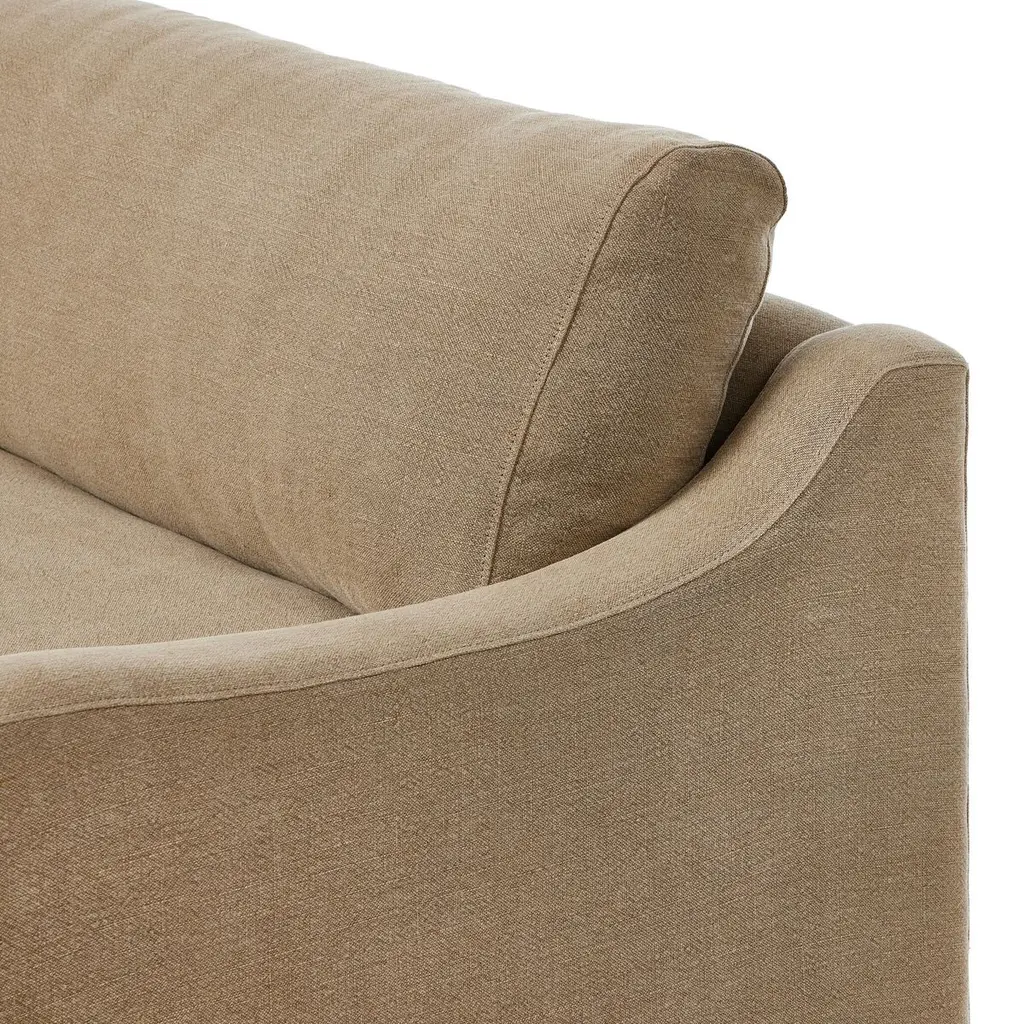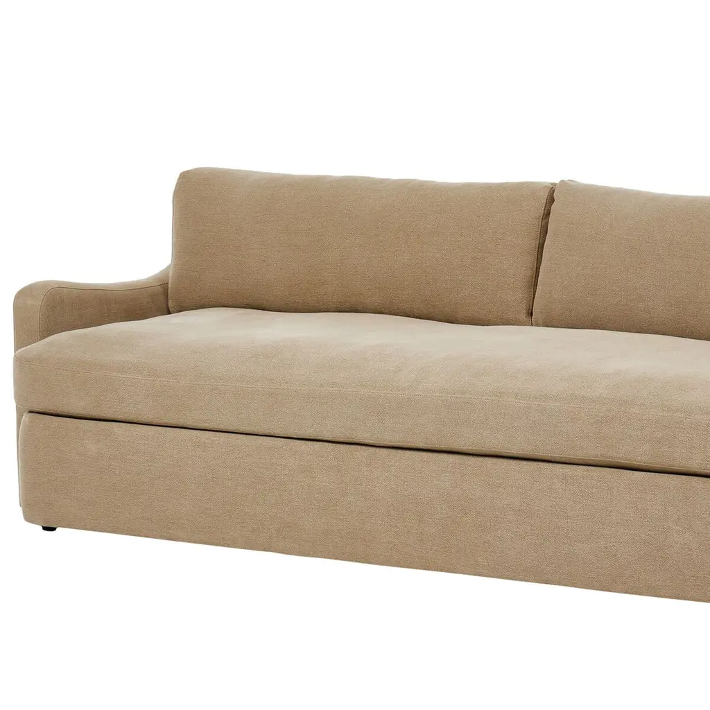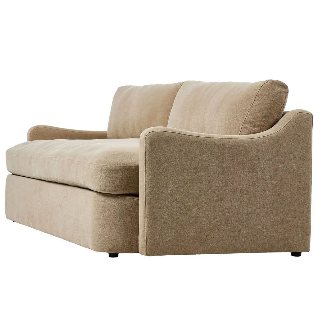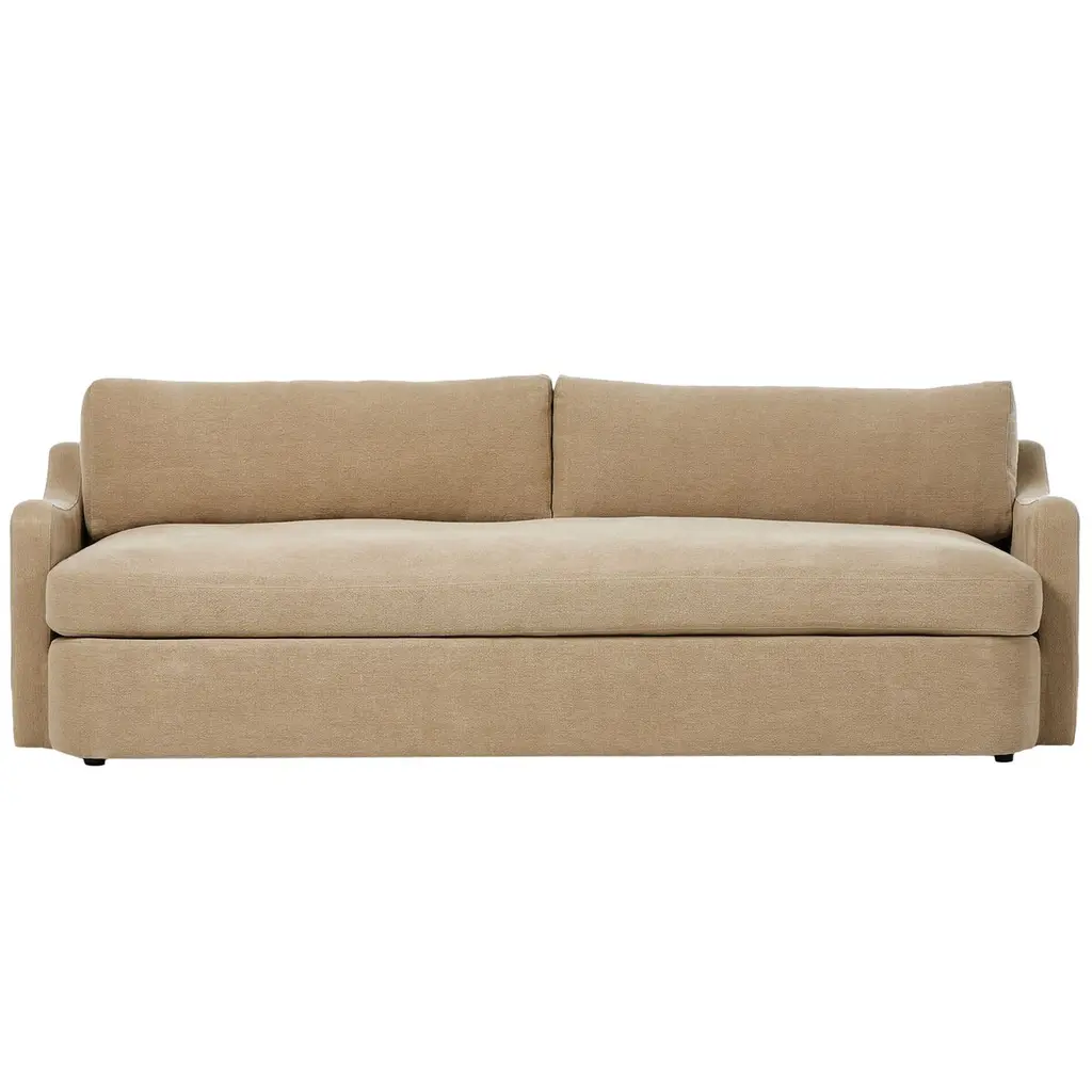 Heritage-inspired comfort. Sloping track arms and a protruding front decking are a study in playful forms, while subtle boxing along the front perimeter maintains a simple, polished look. The two-over-one boxed cushions incorporate a feather/fiber blend and S-spring suspension for the ultimate sink-in sit. Covered in 100% linen.