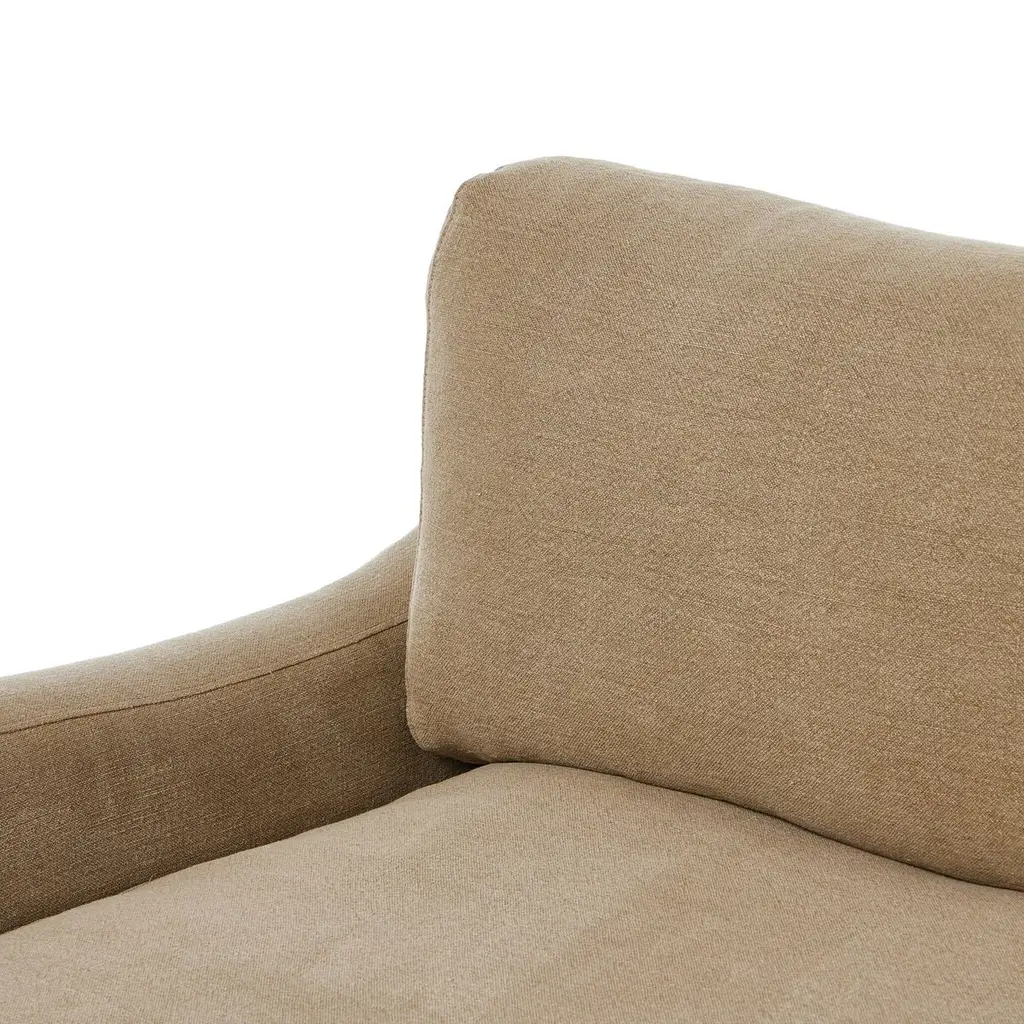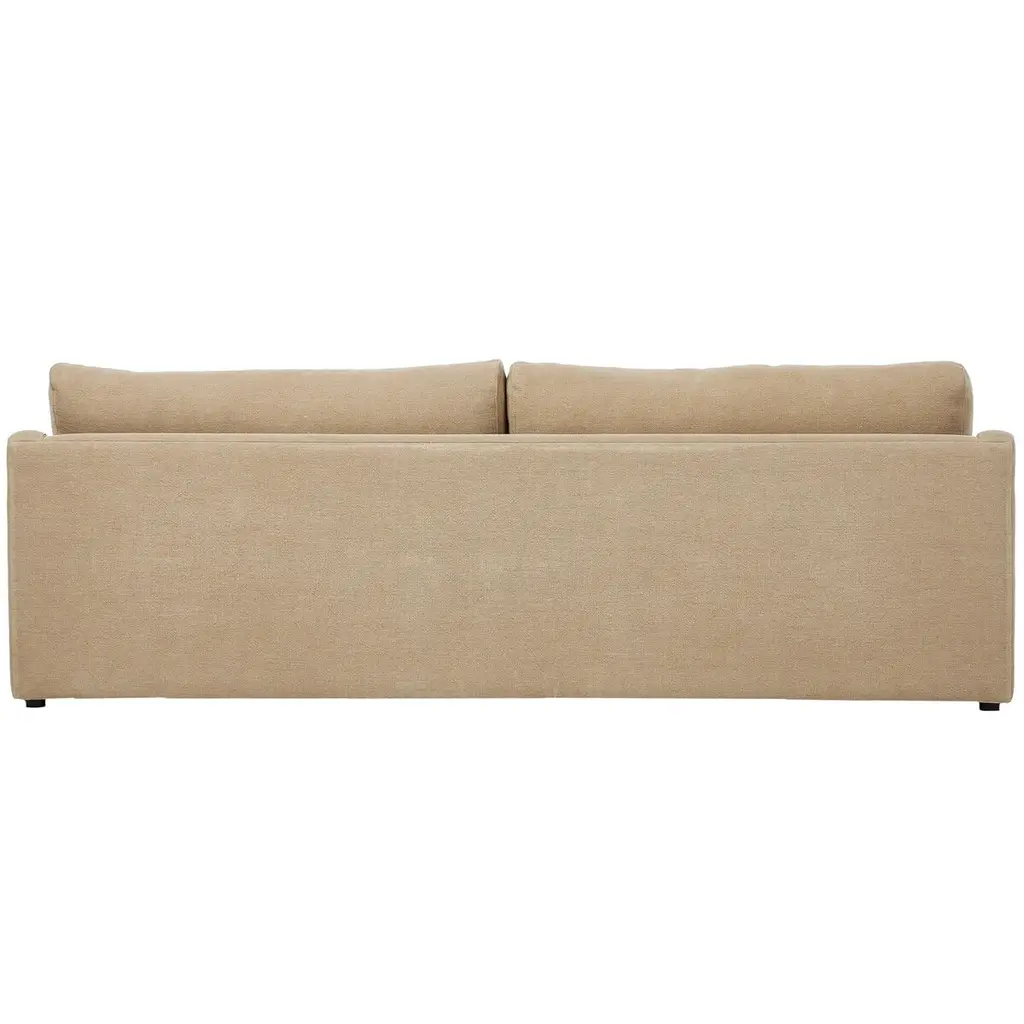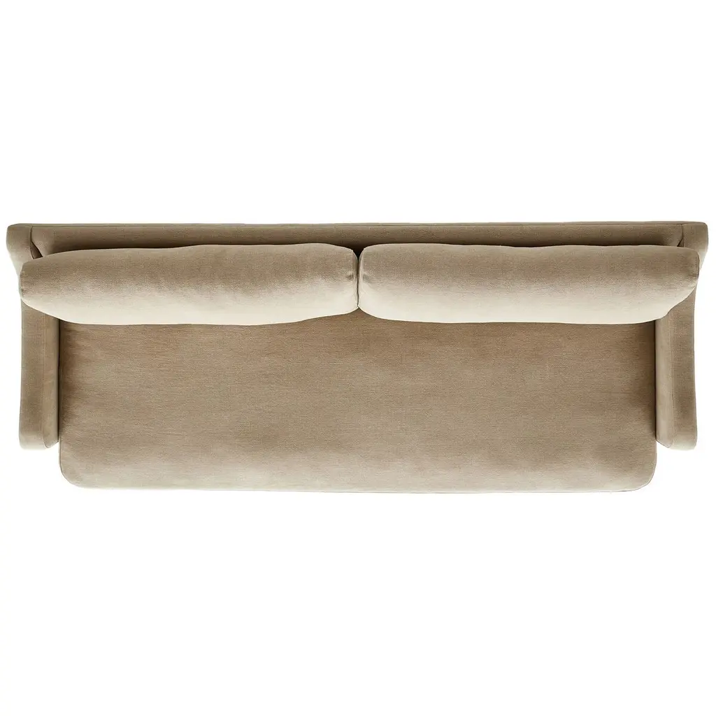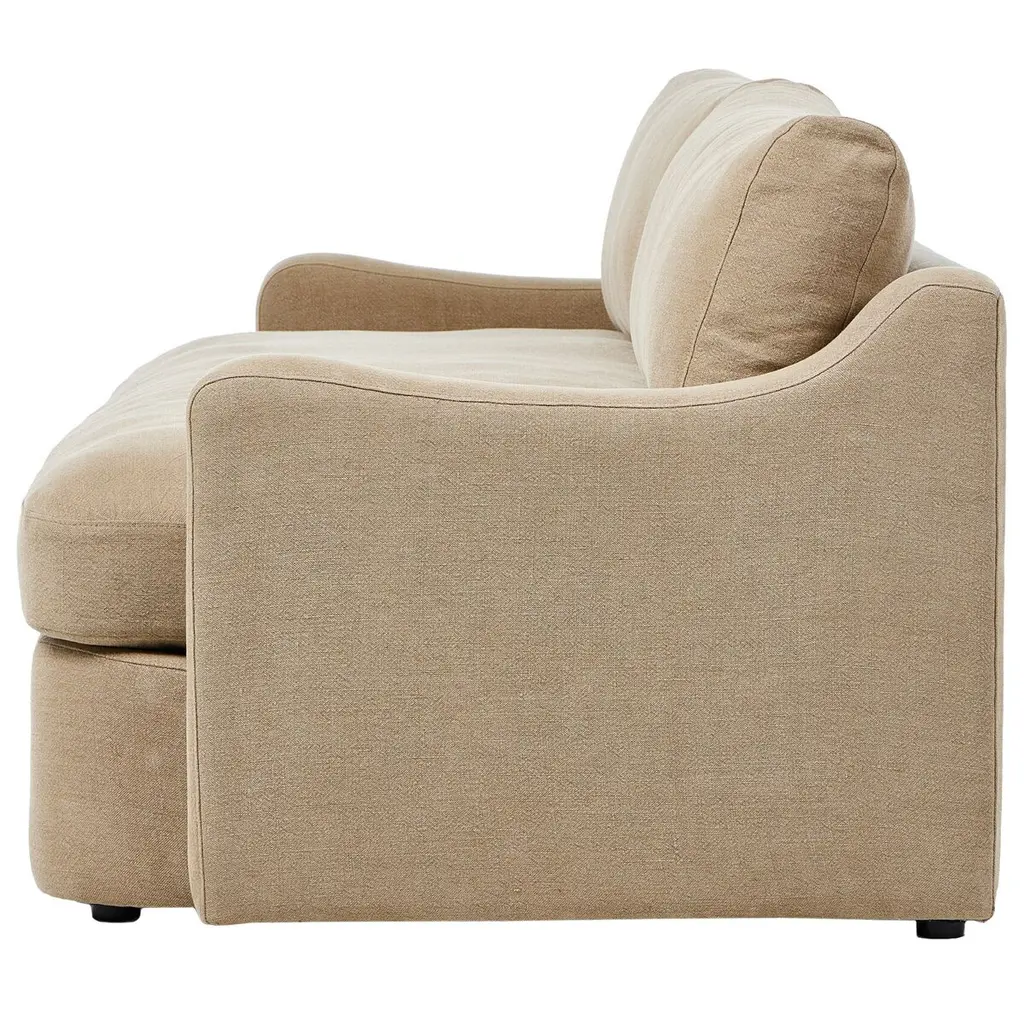 Heritage-inspired comfort. Sloping track arms and a protruding front decking are a study in playful forms, while subtle boxing along the front perimeter maintains a simple, polished look. The two-over-one boxed cushions incorporate a feather/fiber blend and S-spring suspension for the ultimate sink-in sit. Covered in 100% linen.