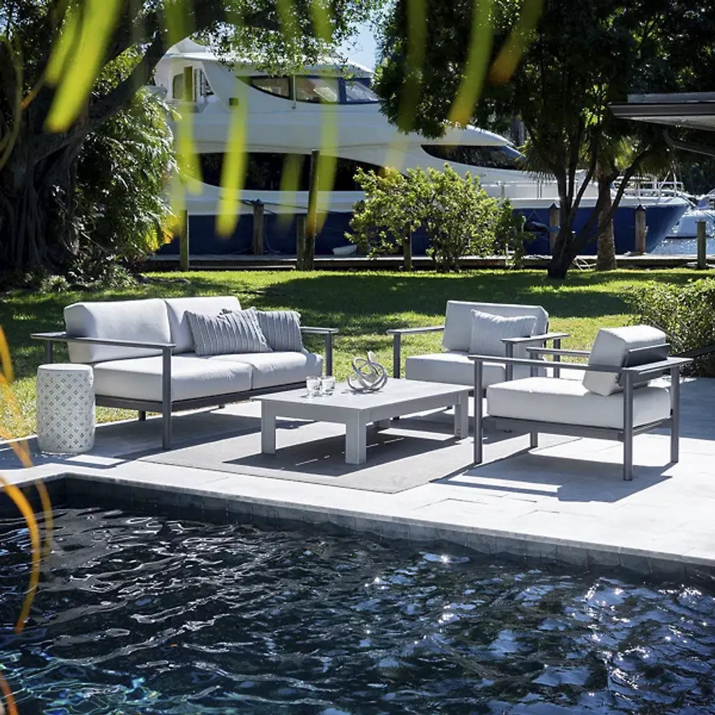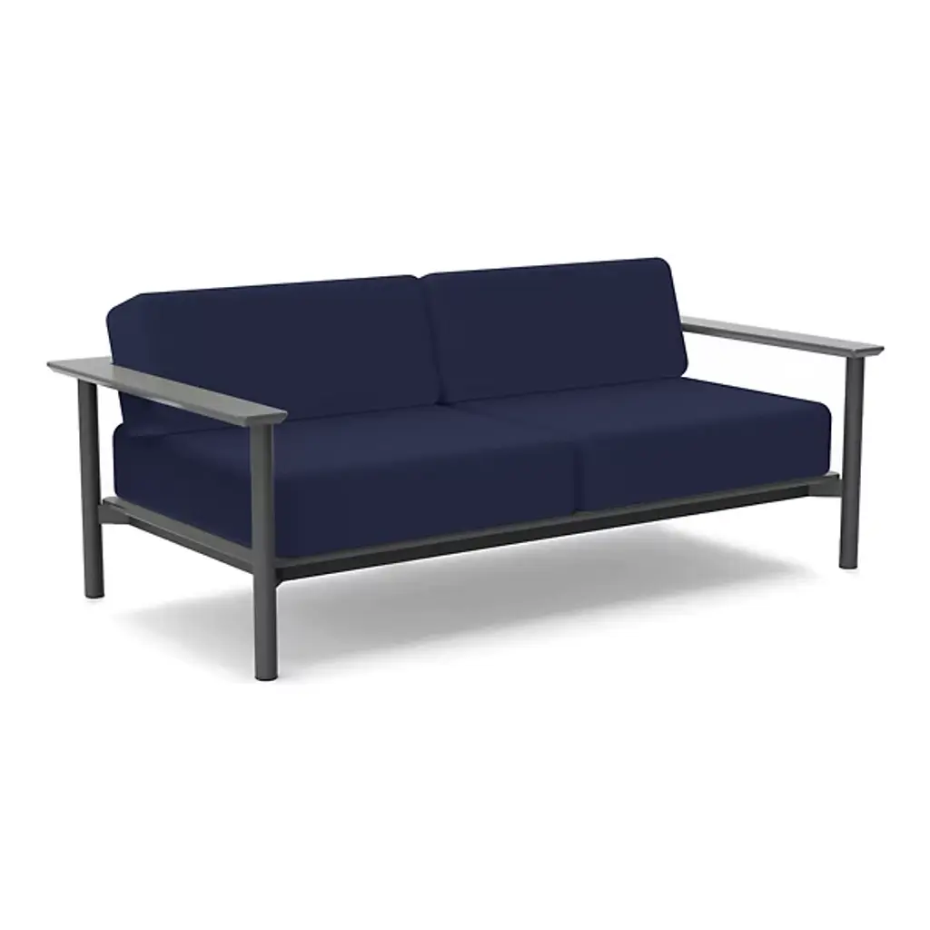 The Aurora Outdoor Sofa from Loll Designs provides classic two-person seating with armrests on both sides for maximum support. Its stainless steel construction features a rust-proof powder coating that maintains appearance through years of outdoor use. The design features a taller seat height, making entry and exit effortless while still providing comfortable seating. Water-resistant Sunbrella cushioning includes integrated vapor barriers that protect against moisture penetration, and protective foot glides prevent surface damage, while snap attachments secure cushions in place.