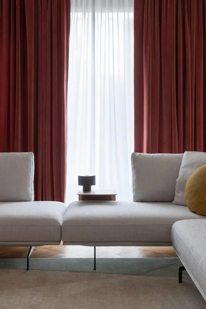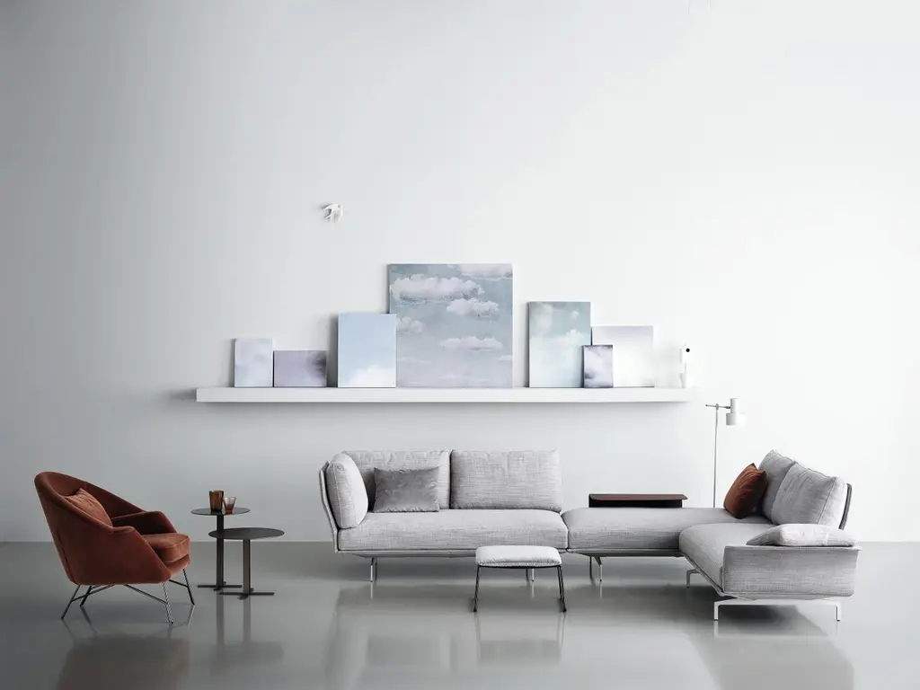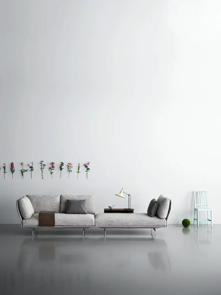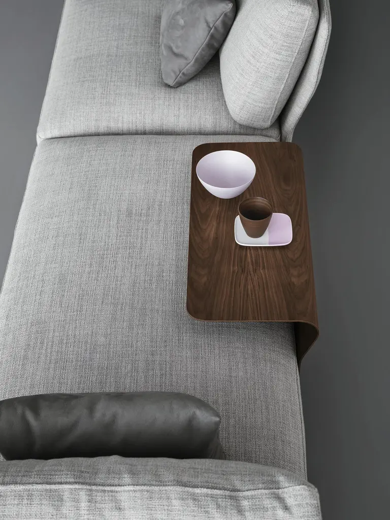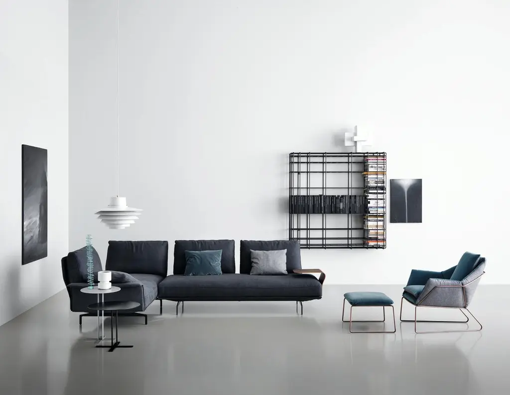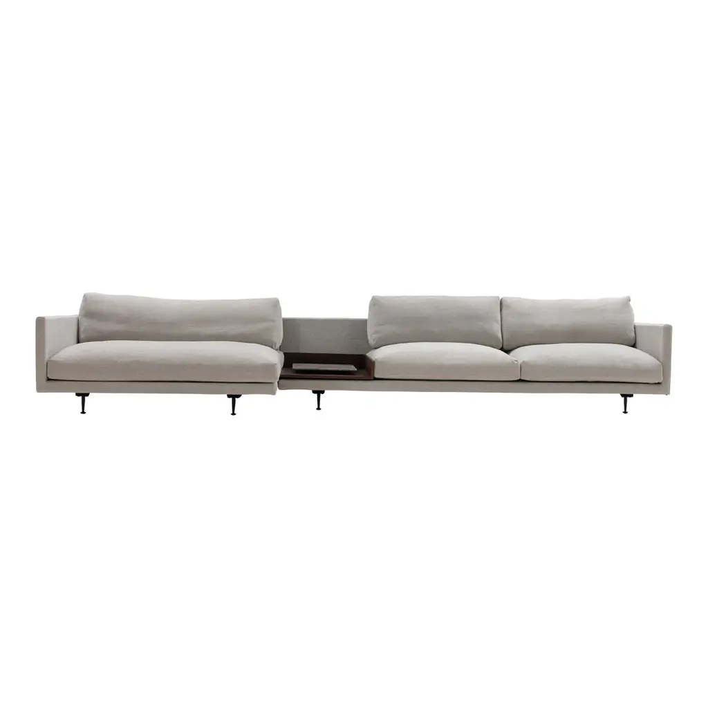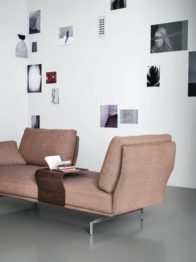 Flow, adapt, create void, rearrange space, receive and renew indefinitely. The new Avant-Après seating is able to do it all. Rigid yet lightweight, the sofa comes in fascinating configurations thanks to the special and unique armrest/backrest system that detaches with a simple movement and may be positioned all along the base. A pre-and-post dance that can be staged every day, created by the desire to try something new. Avant-Après has a sober allure and an elegant appearance. The seating is placed on a metal base upholstered in fabric or leather, resting on metal feet. Refined accessories complete the system: the side tables are walnut wood and come in two different sizes, with the warm notes of the wood. Fully removable covers.Born in 1953 he left formal education and began, almost by chance, his experience in the field of the padded furniture. Fascinated by the world that surrounded him, he eagerly devoted himself to researching building forms and techniques which have borne fruit for the companies in which he worked. In 1991 he opened his studio as an independent designer and in 1993 he came across Saba Italia. New challenges and new incentives lead to the creation of the “nomad sofa”: Taos, Ananta, Limes, Nesting, Pixel. Creations that were born from reflection of new desires that encourage us to live in a less formal way, equipped with systems that enable change with simple gestures, by playing with shapes.Structure: Base in painted metal with seating plane in plywood covered with velfodera on pressed 300gr/sqm. Back and armrest cushions’ panels are in plywood covered with velfodera on pressed 300gr/sqm. Their anchorage with base is guaranteed through painted metal plate equipped with brackets.Feet: In metal grey RAL 7021 or glazed chrome painted finishPadding: The back and roll cushions are padded with washed and sterilized goose down and 100% polyester fiber divided into sections. The armrest cushion is padded with washed and sterilized goose down divided into sections.Foam version: The seat cushions are padded with variable-density polyurethane foam (40IP – DYNAMIC ELAST Foam High Resilience – 25IM), covered with fine velvet coupled with dacron 280 gr/sqm. Coffee Table: In veneered plywood in walnut and inclined cutting edges. Their anchorage with base is guaranteed through painted metal plate equipped with brackets.Additional Information:Material: Metal, plywood, polyester fiber, polyurethane foam, velvet, walnut, upholsteryUpholstery: Vip, A3 - Avant Après col.16Frame finish: Metal grey RAL 7021Dimensions: 346 W x 93 D x 84 H cmSeat height: 42 cmAvailable in other upholstery options: C, E, extra, lusso, special, top, elite, royal, pelle club, pelle florida, pelle masterAvailable in other size options: Medium, largeAvailable in other frame option: Glazed chromeAvailable in other structural options