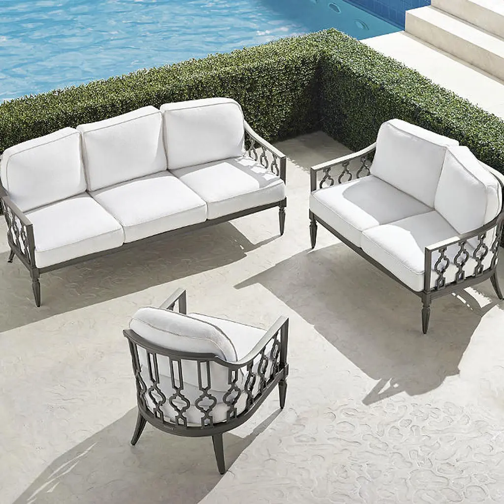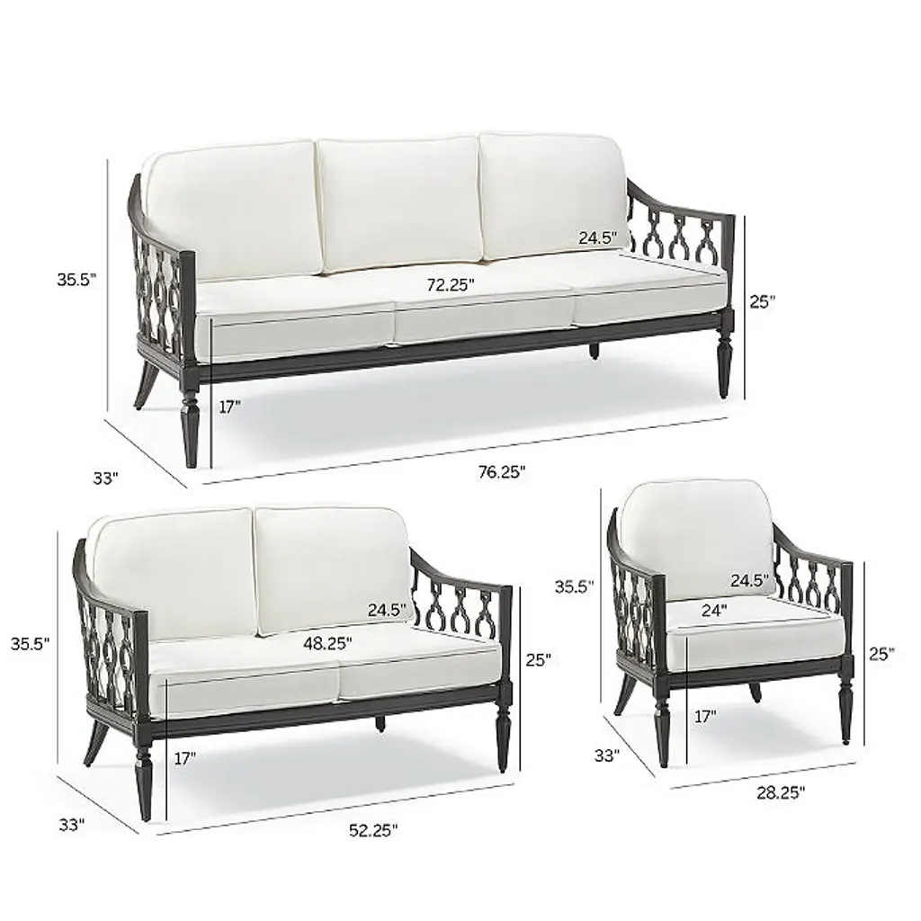 The quatrefoil motif recurring throughout our Avery Sofa Set puts a contemporary twist on the age-old iron gates of Europe. Expertly crafted of cast aluminum with hand-filed welds, powdercoated finish and weather-defying solution-dyed acrylic cushions, this exclusive set is built to stand the test of time. An eclectic design to mix with pieces from our other collections. Set includes sofa, loveseat and lounge chair. Part of the Avery Collection Avery 3-piece Sofa Set in Slate Finish (154592): Includes sofa, loveseat and lounge chair with cushions. Note: Set only available as listed. Premium-quality cast aluminum frames, with hand-filed welds and durable powdercoated finish All-weather cushions are constructed of a high-resiliency foam core with soft polyester wrap and covered with weather-defying solution-dyed acrylic fabric to resist mold, mildew and fading Included cushions are 5 inches thick Piping color on cushion matches the stripe color Imported A Frongate Exclusive Please note: Digital renderings of custom upholstery may differ in pattern placement from the actual item. Because colors can vary from screen to screen, we recommend ordering a swatch before completing your order. We offer free swatches of all our outdoor fabrics. 10-swatch maximum. Solid and stripe swatches measure 4"x4" and pattern swatches measure 8"x8". View and order swatches here. At Frontgate, our primary focus is quality. We guarantee that every product we sell will stand up to the supreme test – our customers' satisfaction. To learn more about our policies, visit our Shipping & Processing, Returns & Exchanges and Warranty & Price Guarantee pages.