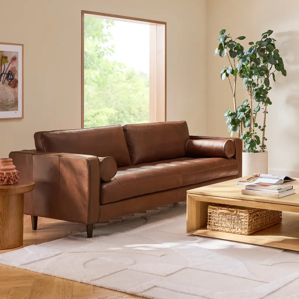 Destined to become a family heirloom, this luxurious sofa will only get better with time. With its distinctive angled back that lets it float beautifully in the room, Aviator is inspired by classic 1970s European designs for a look that's lived-in and relaxed. And the comfort level is off the charts, with sumptuous cushions made for sinking into and staying awhile. Our Satchel premium leather in your choice of four colors is crafted to age beautifully and develop a rich patina think classic vintage flight jacket.