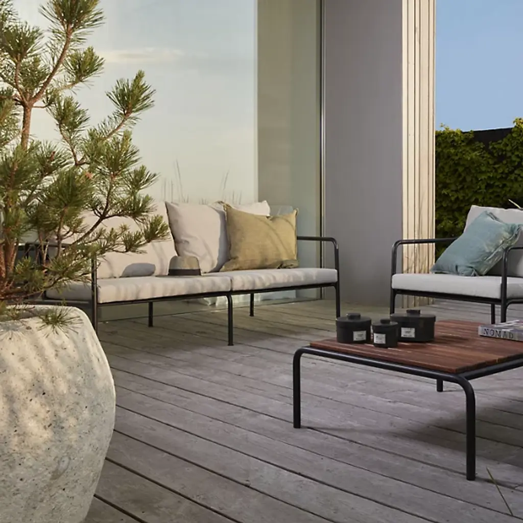 Stay relaxed while outside with the Avon Lounge 2 Seater Sofa by Houe. Strong steel has been finely worked into the shape of a slender frame. The legs at each end of your sofa seamlessly blend into the armrests to bring you support while seated. This sofa boasts enough room for two people so that you can spend quality time with your loved one. This outdoor seating fixture is lined with comfortable Sunbrella cushions for your comfort.