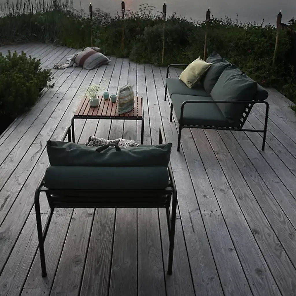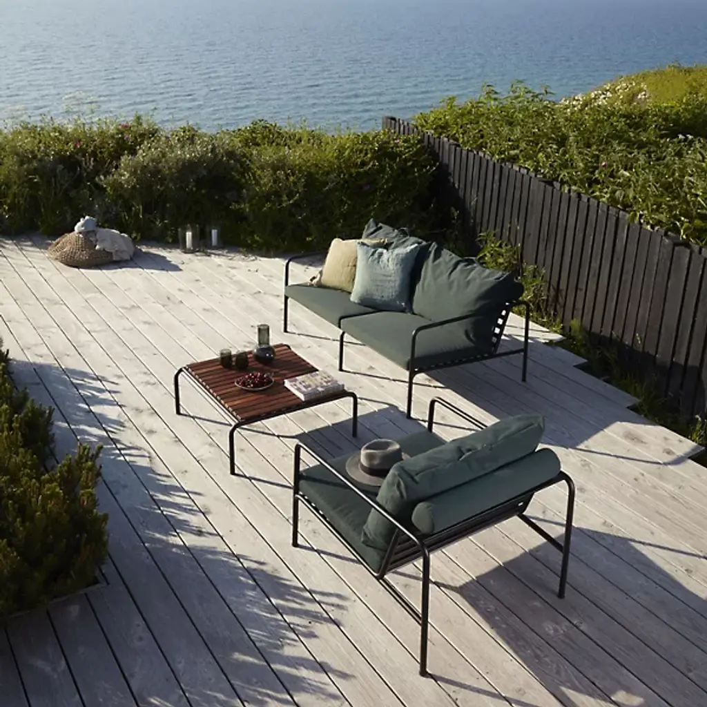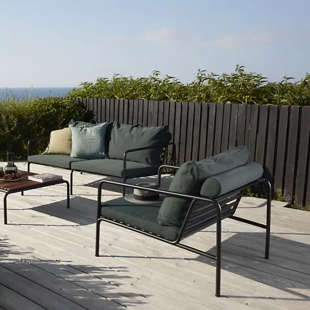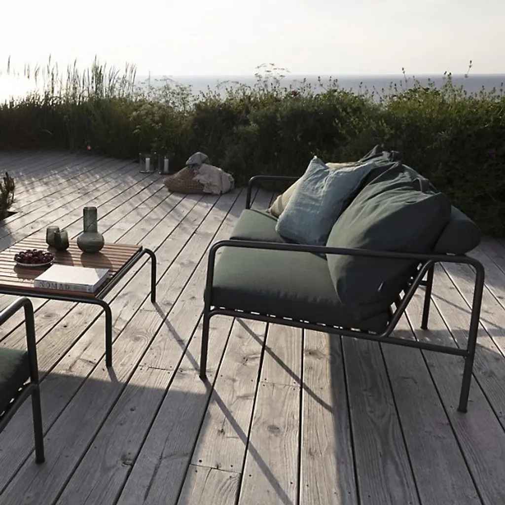 Stay relaxed while outside with the Avon Lounge 2 Seater Sofa by Houe. Strong steel has been finely worked into the shape of a slender frame. The legs at each end of your sofa seamlessly blend into the armrests to bring you support while seated. This sofa boasts enough room for two people so that you can spend quality time with your loved one. This outdoor seating fixture is lined with comfortable Sunbrella cushions for your comfort.