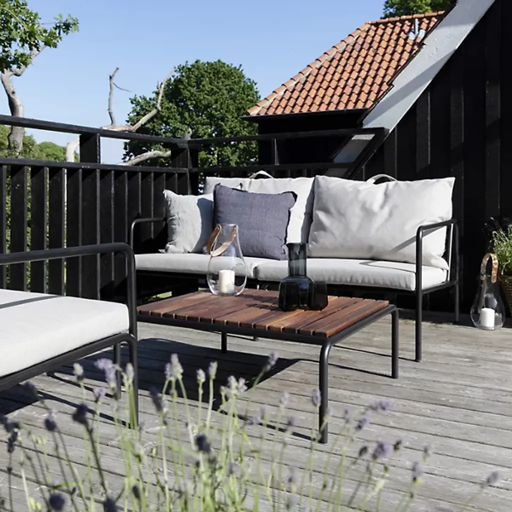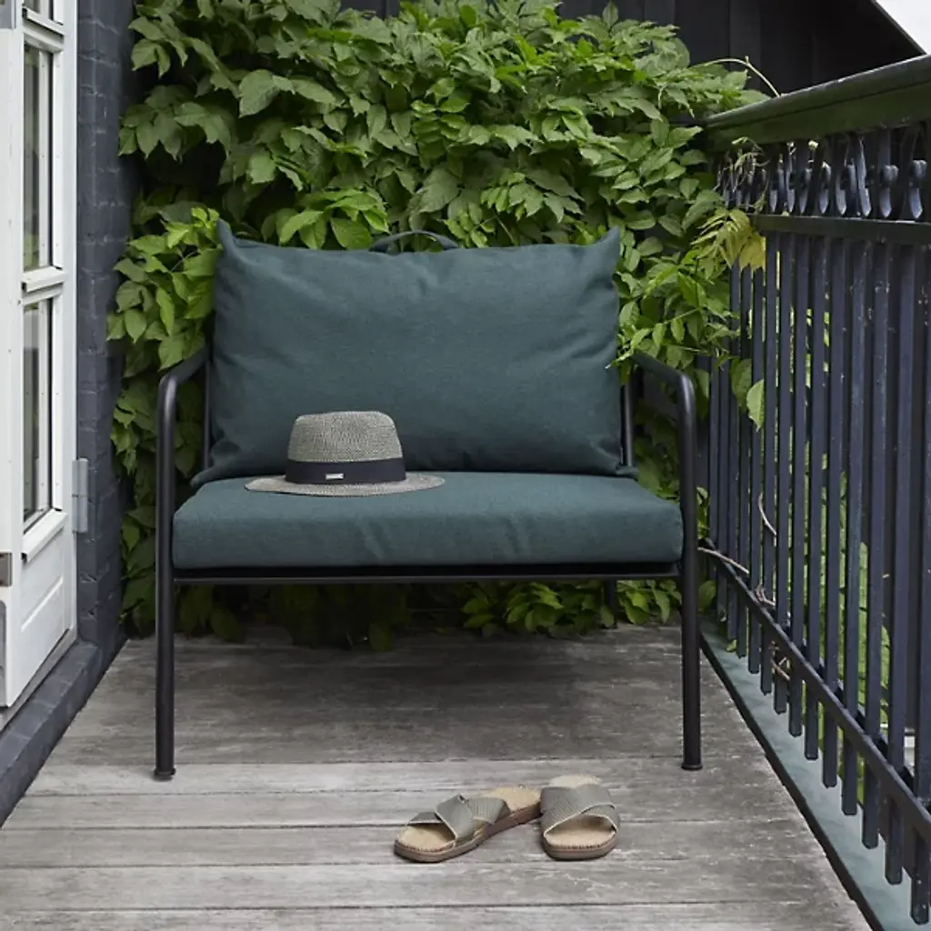 Stay relaxed while outside with the Avon Lounge 2 Seater Sofa by Houe. Strong steel has been finely worked into the shape of a slender frame. The legs at each end of your sofa seamlessly blend into the armrests to bring you support while seated. This sofa boasts enough room for two people so that you can spend quality time with your loved one. This outdoor seating fixture is lined with comfortable Sunbrella cushions for your comfort.