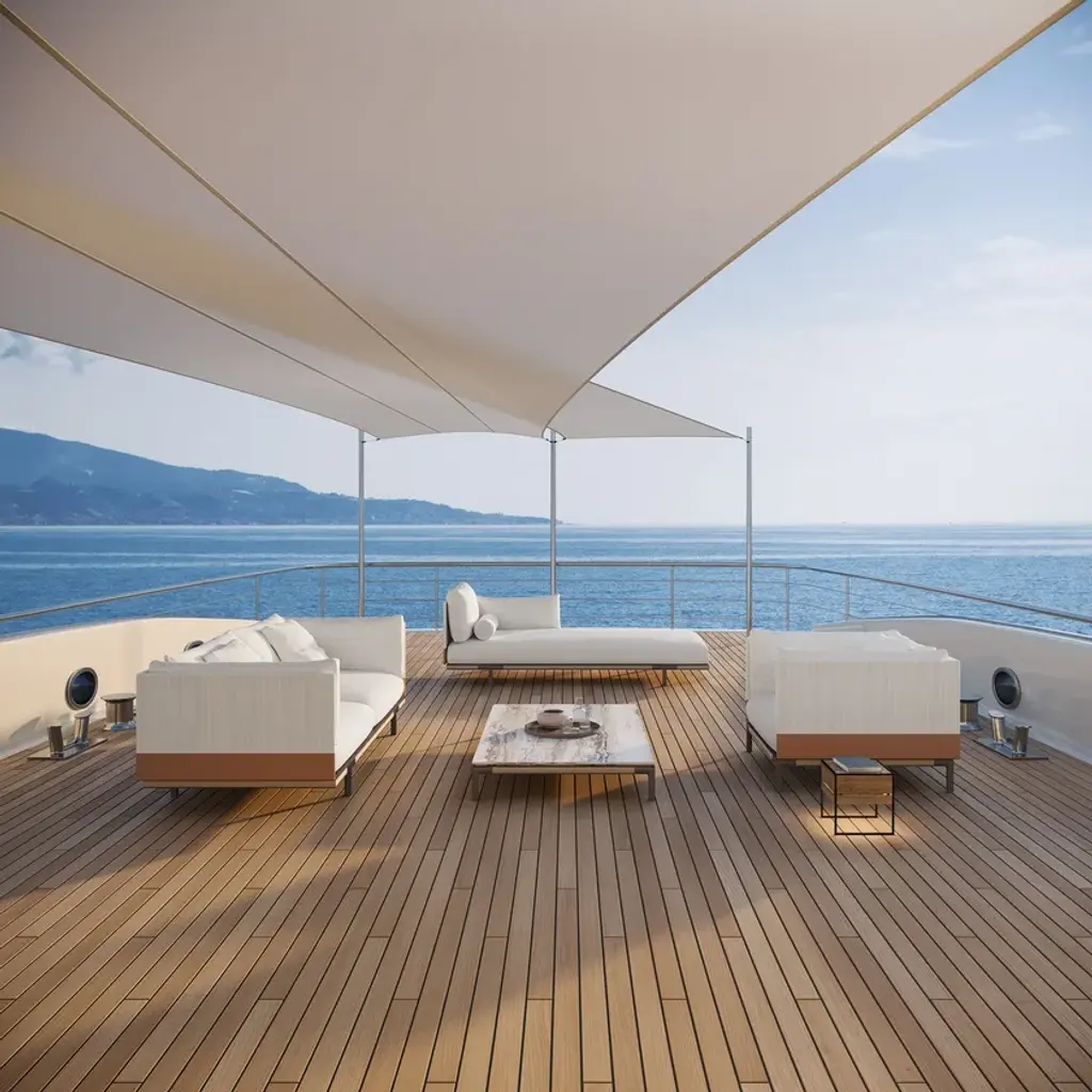 Baia is an outdoor sofa upholstered with neutral colors fabrics, matched with nautical leather details, all materials selected for their stylistic and aesthetic qualities, that ensure their performance in any outdoor context or situation and ensure that the furnishings preserve all their original beauty and function over time. The padding is water-repellent and ‘sealed’ with a special technique that means water runs off and is prevented from penetrating them, All the cushions and armrests have easy to remove loose covers and the leather is eco-friendly and specific for outdoor useCostiera+Baia collections are the exciting nautical challenge by Ethimo and Christophe Pillet, a collection of lounge elements born out of an encounter between technical knowhow and aesthetic sensibility, designed to bring the moods, unique style and quality that has always distinguished Ethimo outdoor collection onto yachts and large boats and into yachting clubs. This new range for the nautical work comprises two collections, Costiera and Baia, each with its own characteristics yet sharing the same mood, making them perfect together. Through two seating solution versions, these collections evoke fascinating seascapes and describe the world of sailing in an ideal union of contemporary design and performance.