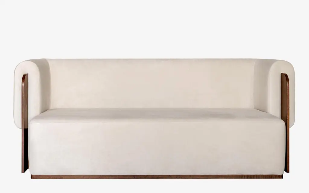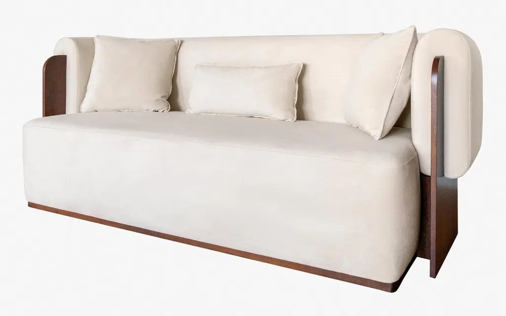 Baika Beige Velvet Three Seater Sofa With Wooden Detail