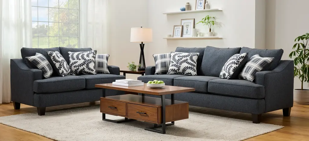 Farmhouse-style-inspired, the Bailey Sofa combines comfort and casual appeal for your living room. Soft Revolution performance fabric offers durability for active, busy households, while the navy color palette and coordinating accent pillows level up the look.