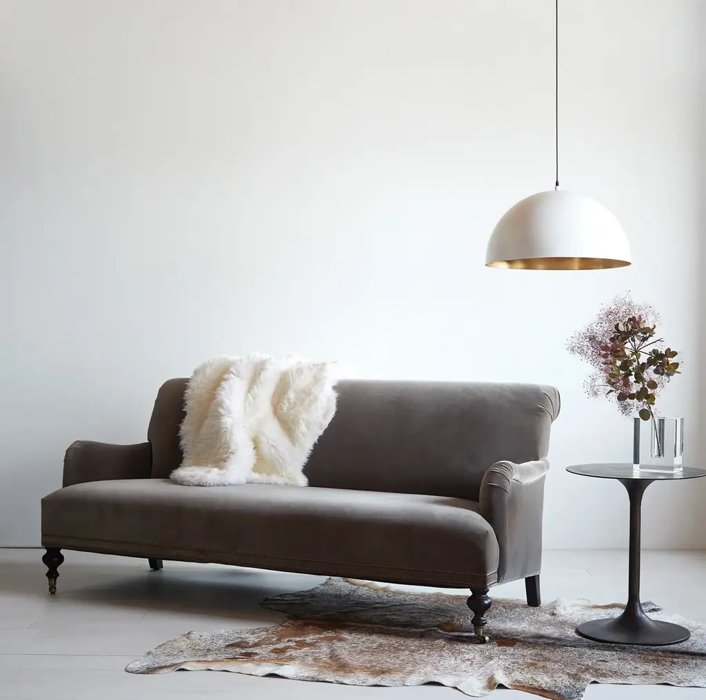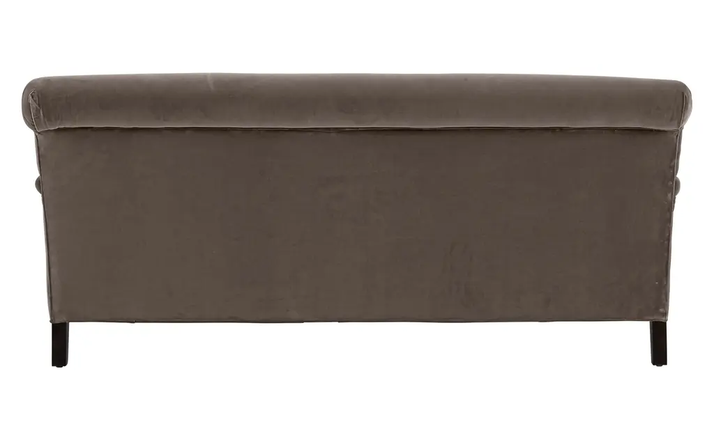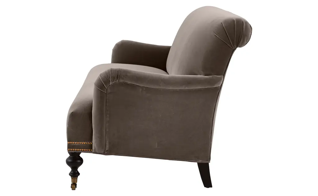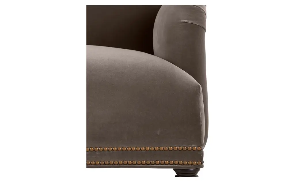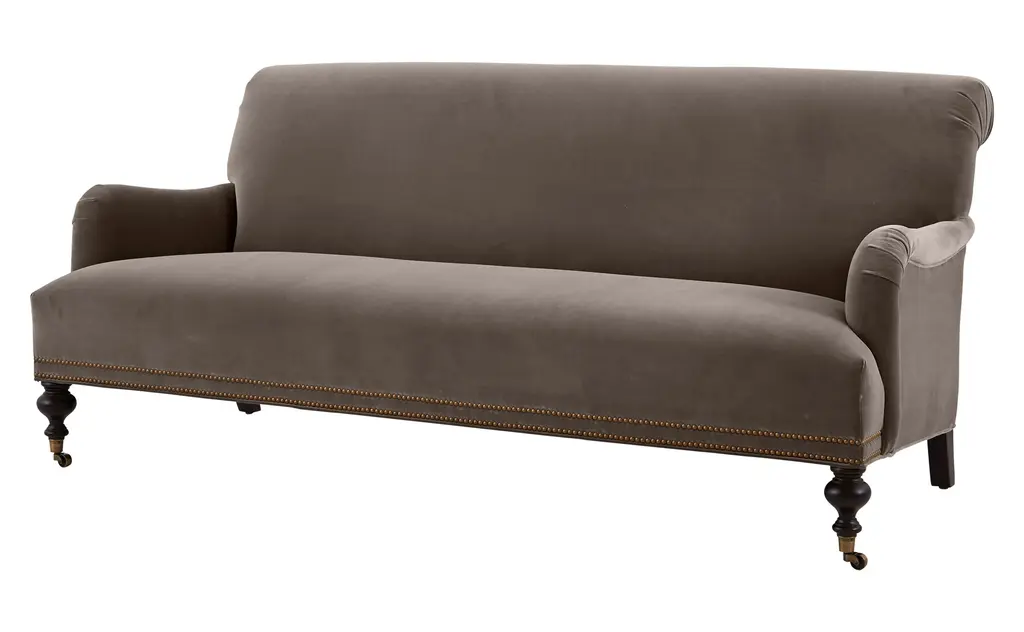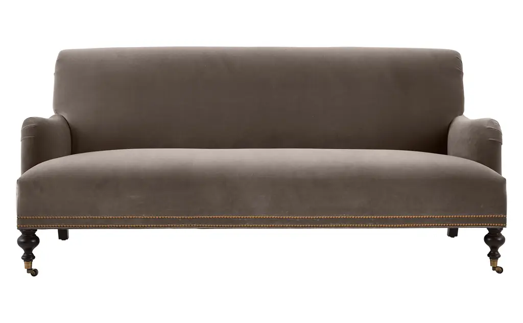 Our timeless Balmoral Sofa is lounge-friendly and oh-so-inviting. With a low profile, perfectly pitched back and a firm bench seat that's neither too shallow nor too deep, this sofa really is as comfy as it looks. We've paired its relaxed and rounded silhouette with English rolled arms, turned walnut legs and antique brass casters and nailhead trim for a traditional touch. Casual enough for everyday use in the family room, dress up our transitional Balmoral Sofa with luxe pillows and a striking cocktail table for use in a more sophisticated setting. As Shown •upholstered in marco-stone velvet•ships in 6-10 weeks•fabric content: 100% cotton•black walnut wood finish•antique brass nailheads•antique brass casters•sustainable construction•made in the USA•JH web exclusive Dimensions •overall: 81"W x 38"D x 36"H•seat width: 69"•seat depth: 21"•seat height: 17"•arm height: 24" COM yardage needed is 11 yards. If using a patterned fabric please contact us at info@jaysonhome.com or 1-800-472-1885 for yardage requirements.