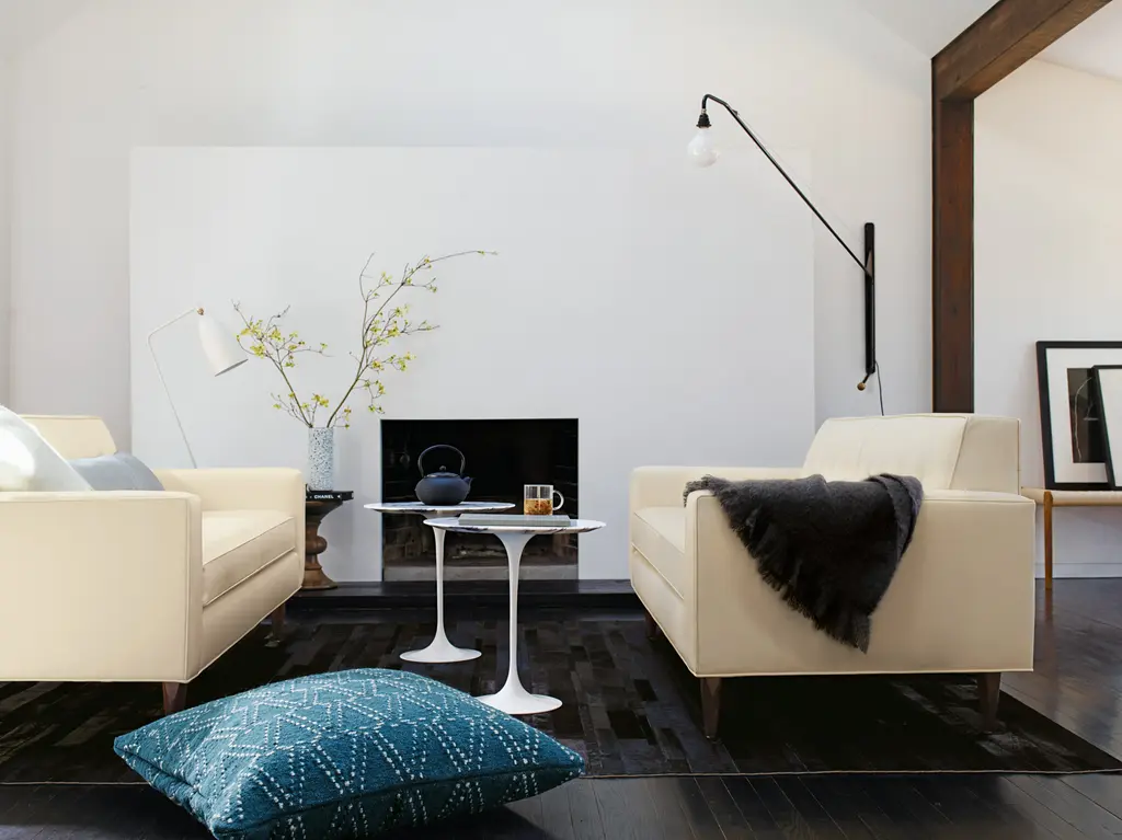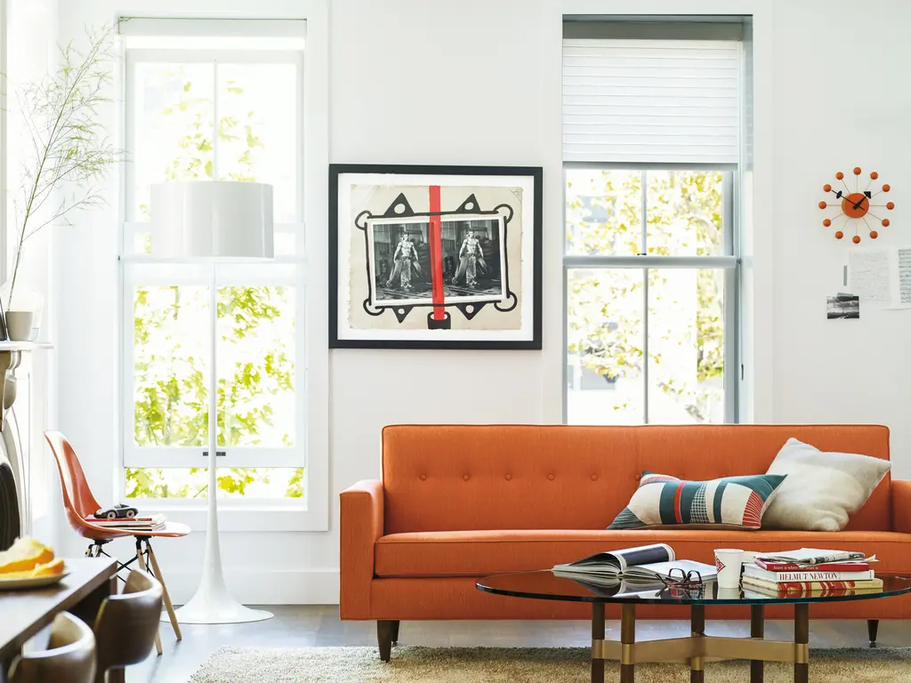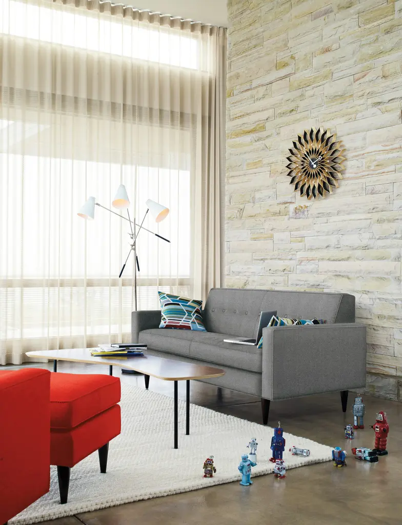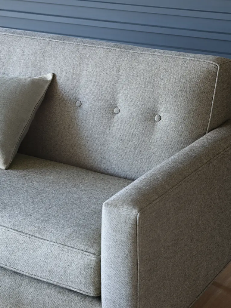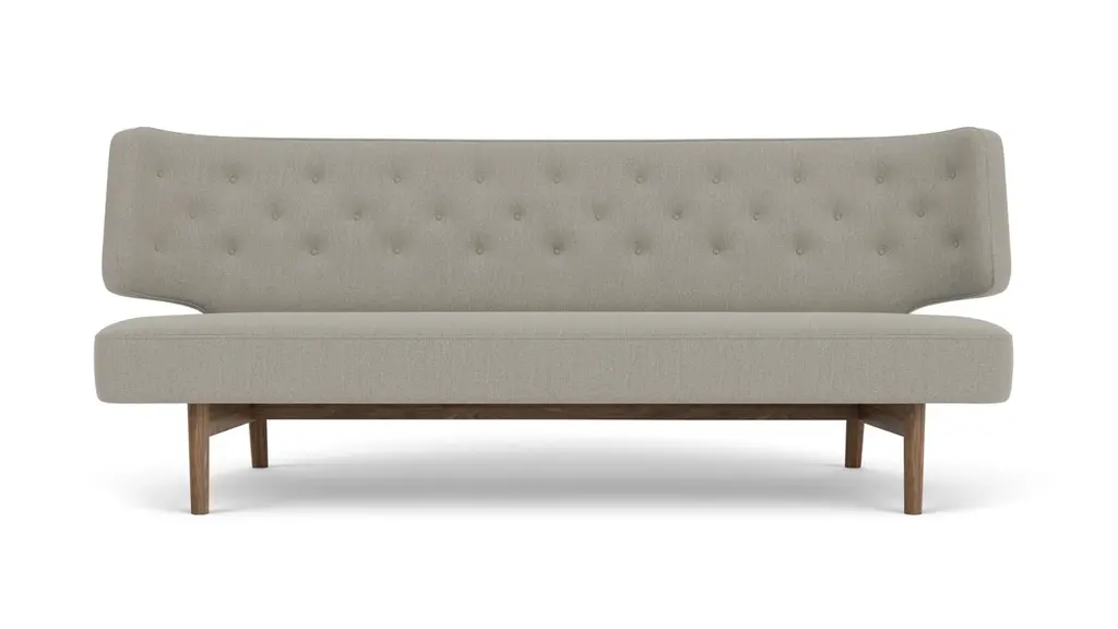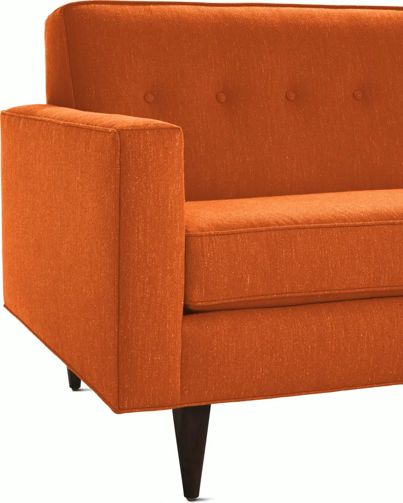 The Bantam Sofa (2004) celebrates the soft, less-machined brand of modernism that arose in the United States in the 1930s. The frame is lightly padded and finely upholstered, with a single row of button tufting on the back. Matching piping along the seams reinforces Bantam's clean lines. Tapered solid wood legs lend visual lightness. Comes with legs finished in a rich walnut stain. For legs in a honey or coffee finish, contact a DWR Studio or call us at 1.800.944.2233.