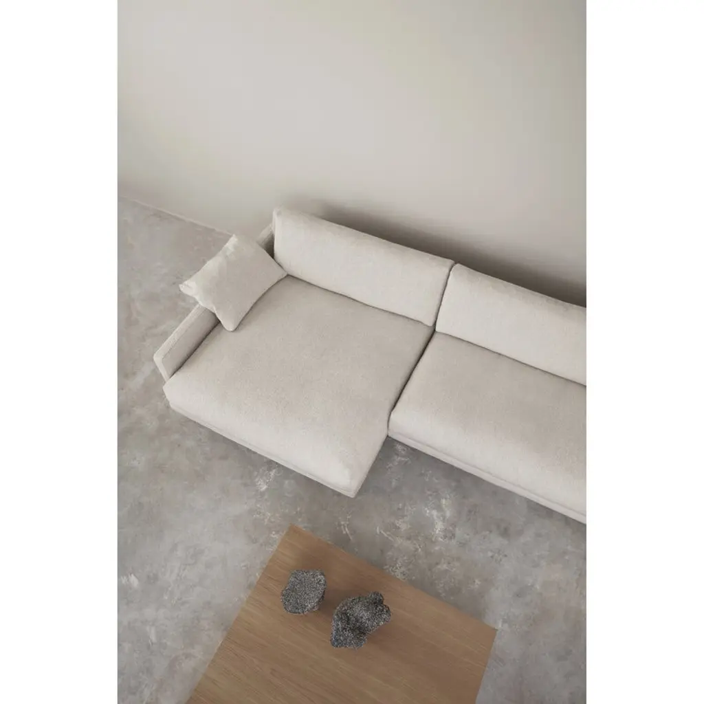 Interface’s Bebé sofa featuring a chaise longue invites instant relaxation. Designed by Aino Michelsen, the soft lines, slender features and deep seats of the Bebé sofa provide a pleasant setting for both relaxed sitting and socializing. Thin legs support the frame and the soft, cloud-like seat cushions filled with feathers, giving the Bebé sofa a light and airy look. The relaxed decorative pillows balanced on the armrests complete the sympathetic mood. The Bebé sofa, made in Finland, is a timelessly beautiful addition for both private living rooms and public spaces alike. In this model, the chaise longue is on the left when viewed from the front.