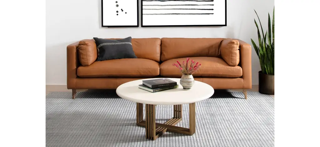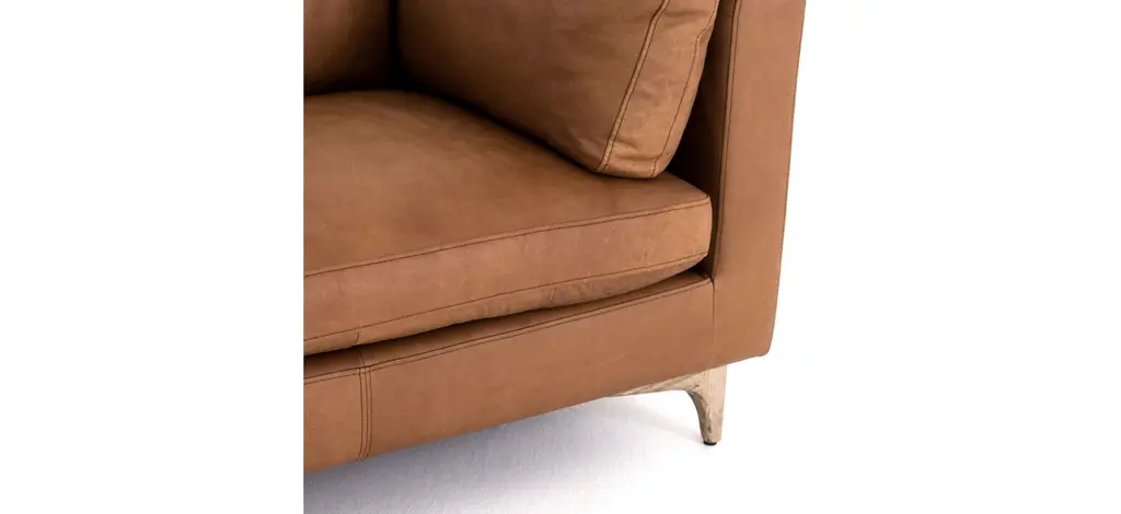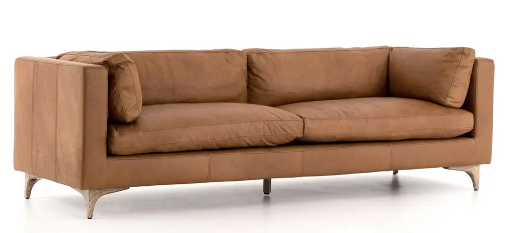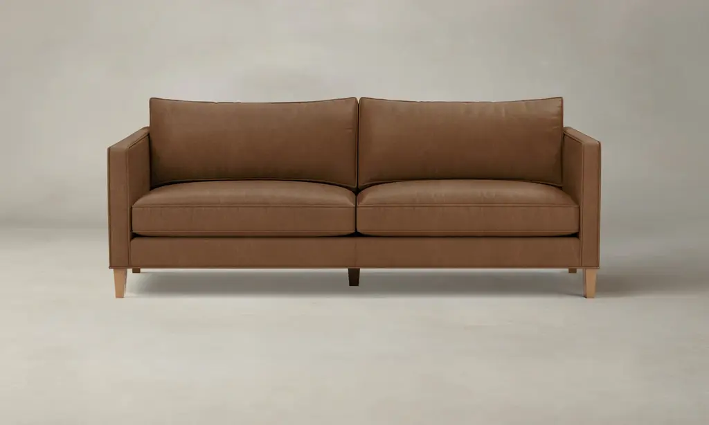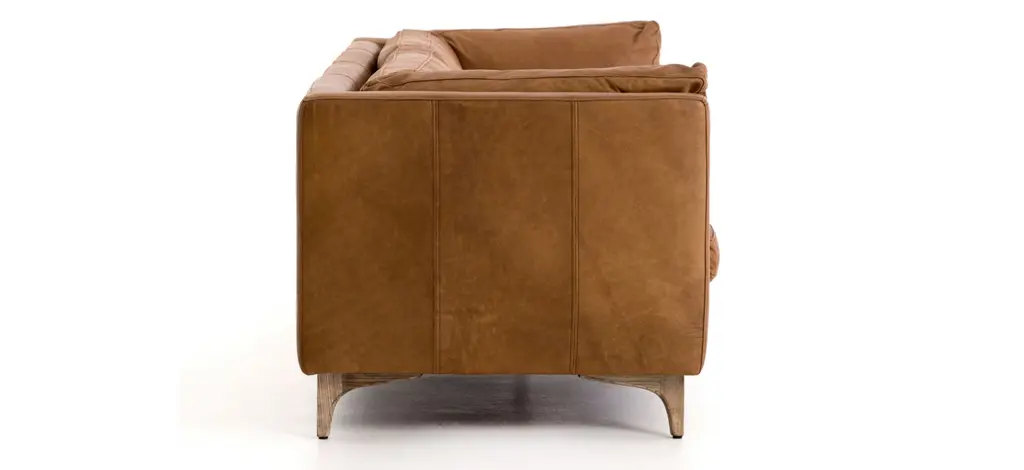 The Beckwith sofa is mid-century modern that has undergone a trend-forward refresh. Top-grain leather takes on a camel hue for a soft, buttery sit. Legs of weathered oak stay stout, allowing leather to stand front-and-center.
