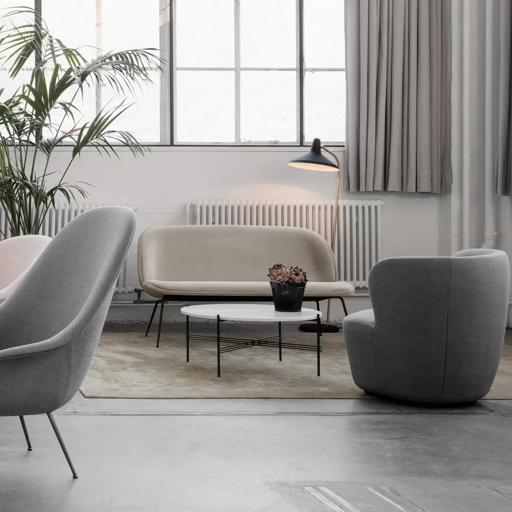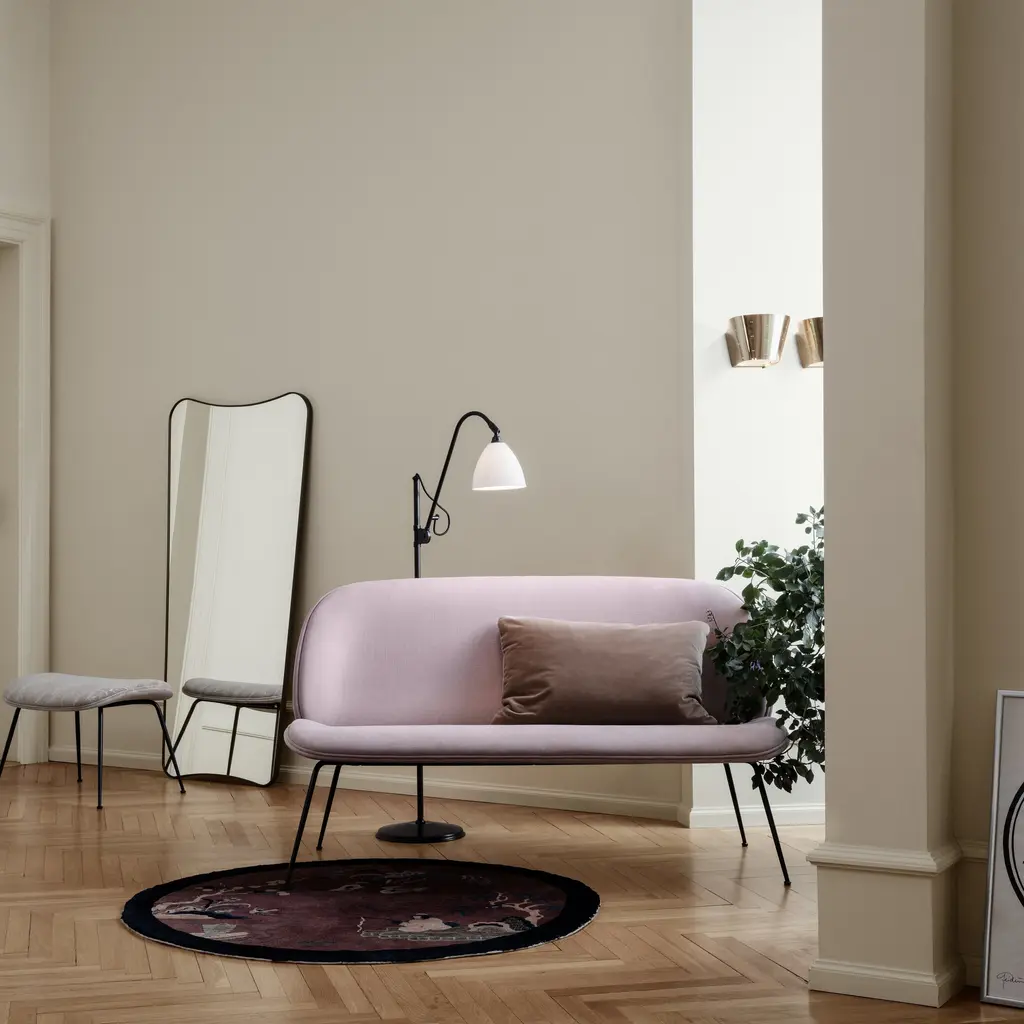GamFratesi plays a long game with the Beetle Sofa for Gubi, extending the chair design inspired by its namesake insect. The 2-seater's molded round shell with well-cushioned interior is enhanced by slender conical legs for a lightly scaled look. With a wide selection of upholstery options and 3 metal finishes for the base, this imaginative seating can be customized to suit the personality of nearly any interior.