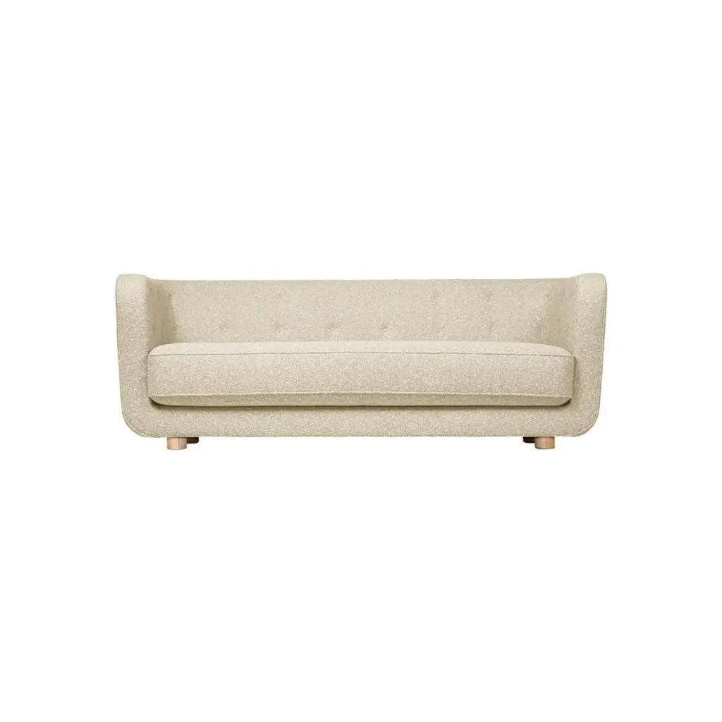 Beige and natural oak Sahco Zero Vilhelm sofa by Lassen.Dimensions: W 217 x D 88 x H 80 cm. Materials: Textile, Oak.Vilhelm is a beautiful padded three-seater sofa designed by Flemming Lassen in 1935. A sofa must be able to function in several ways. It should invite calm and contemplation. Create a private space you can hide in and at the same time invite to life and play. It must be able to withstand sitting on the backrest or on the armrests and then it must be able to stand in the middle of the room if you want to.In addition to being aesthetically beautiful and harmonious, the design makes absolute sense in relation to these parameters.By Lassen is a Danish design brand focused on iconic designs created by Mogens and Flemming Lassen, founded by Lassens’ relatives in 2008. Brothers Mogens (1901-1987) and Flemming (1902-1984) Lassen are known as two of Denmark’s greatest architects and designers. Both were renowned pioneers of Danish functionalism and modernist architecture, honoured with numerous prestigious medals and awards. Headed by Mogens Lassen’s grandson Søren Lassen, By Lassen carries on the brothers’ design philosophy by manufacturing their iconic designs as well as products by other designers that complement the Lassen’s functionalist style. The company’s mission is to continue the tradition of timelessness, functionality and quality, and to introduce the Lassen’s design heritage to new generations.