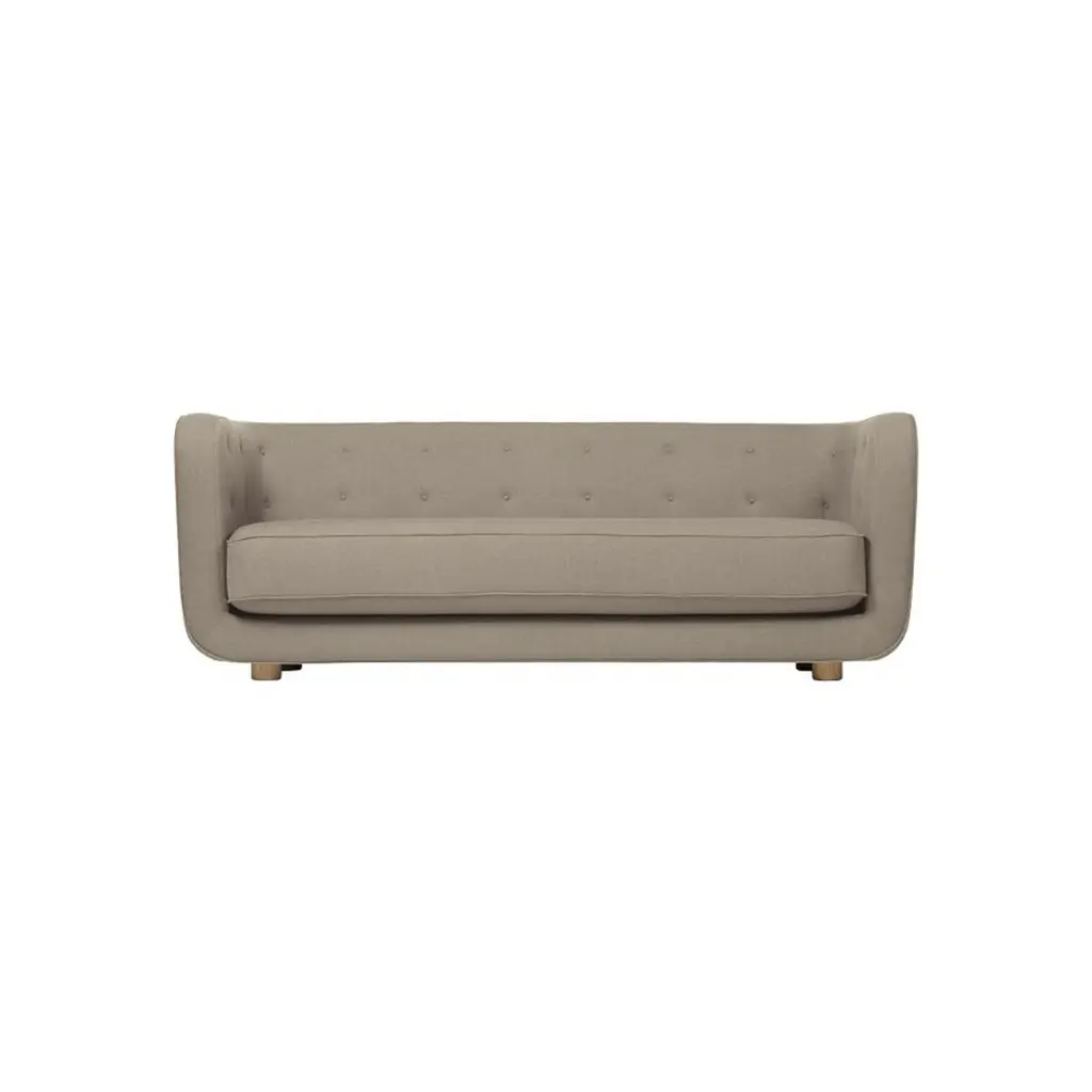 Beige and smoked oak Raf Simons Vidar 3 Vilhelm sofa by Lassen.Dimensions: W 217 x D 88 x H 80 cm. Materials: Textile, oak.Vilhelm is a beautiful padded three-seater sofa designed by Flemming Lassen in 1935. A sofa must be able to function in several ways. It should invite calm and contemplation. Create a private space you can hide in and at the same time invite to life and play. It must be able to withstand sitting on the backrest or on the armrests and then it must be able to stand in the middle of the room if you want to.In addition to being aesthetically beautiful and harmonious, the design makes absolute sense in relation to these parameters.By Lassen is a Danish design brand focused on iconic designs created by Mogens and Flemming Lassen, founded by Lassens’ relatives in 2008. Brothers Mogens (1901-1987) and Flemming (1902-1984) Lassen are known as two of Denmark’s greatest architects and designers. Both were renowned pioneers of Danish functionalism and modernist architecture, honoured with numerous prestigious medals and awards. Headed by Mogens Lassen’s grandson Søren Lassen, By Lassen carries on the brothers’ design philosophy by manufacturing their iconic designs as well as products by other designers that complement the Lassen’s functionalist style. The company’s mission is to continue the tradition of timelessness, functionality and quality, and to introduce the Lassen’s design heritage to new generations.