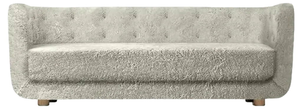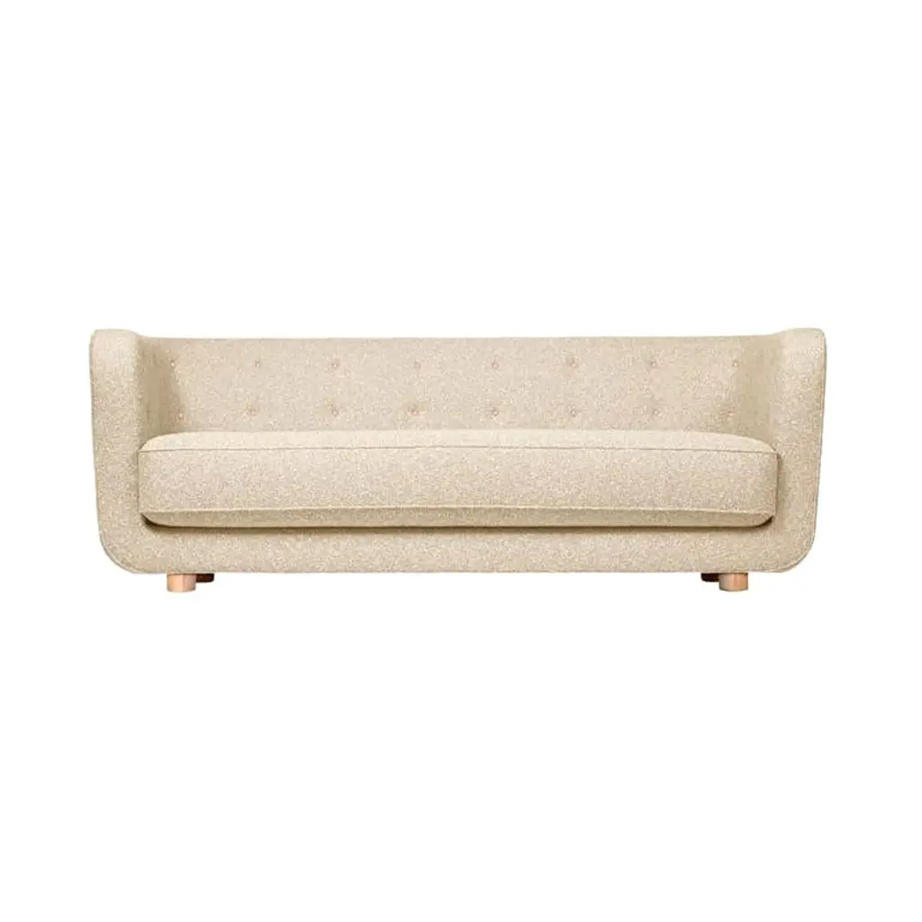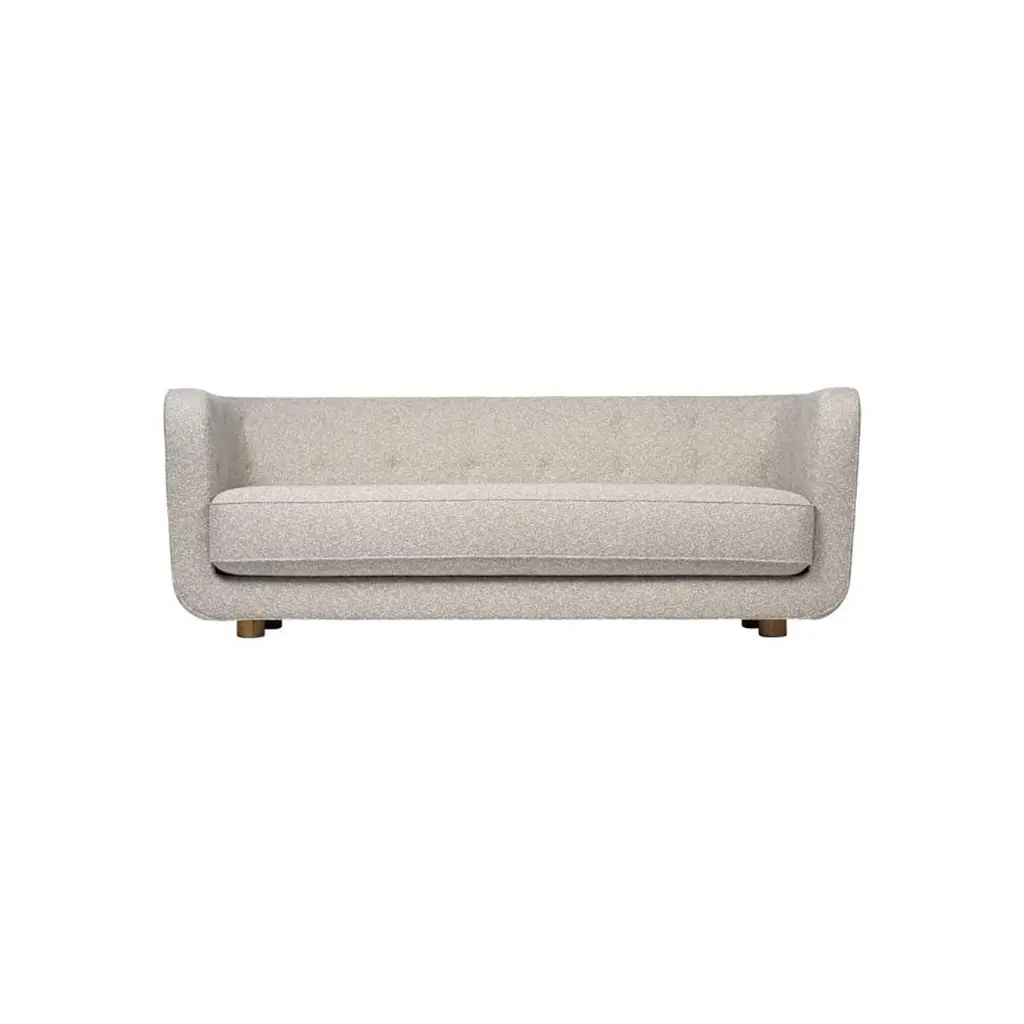 Beige and smoked oak sahco nara vilhelm sofa by Lassen.Dimensions: W 217 x D 88 x H 80 cm Materials: Textile, oak.Vilhelm is a beautiful padded three-seater sofa designed by Flemming Lassen in 1935. A sofa must be able to function in several ways. It should invite calm and contemplation. Create a private space you can hide in and at the same time invite to life and play. It must be able to withstand sitting on the backrest or on the armrests and then it must be able to stand in the middle of the room if you want to.In addition to being aesthetically beautiful and harmonious, the design makes absolute sense in relation to these parameters.By Lassen is a Danish design brand focused on iconic designs created by Mogens and Flemming Lassen, founded by Lassens’ relatives in 2008. Brothers Mogens (1901-1987) and Flemming (1902-1984) Lassen are known as two of Denmark’s greatest architects and designers. Both were renowned pioneers of Danish functionalism and modernist architecture, honoured with numerous prestigious medals and awards. Headed by Mogens Lassen’s grandson Søren Lassen, By Lassen carries on the brothers’ design philosophy by manufacturing their iconic designs as well as products by other designers that complement the Lassen’s functionalist style. The company’s mission is to continue the tradition of timelessness, functionality and quality, and to introduce the Lassen’s design heritage to new generations.