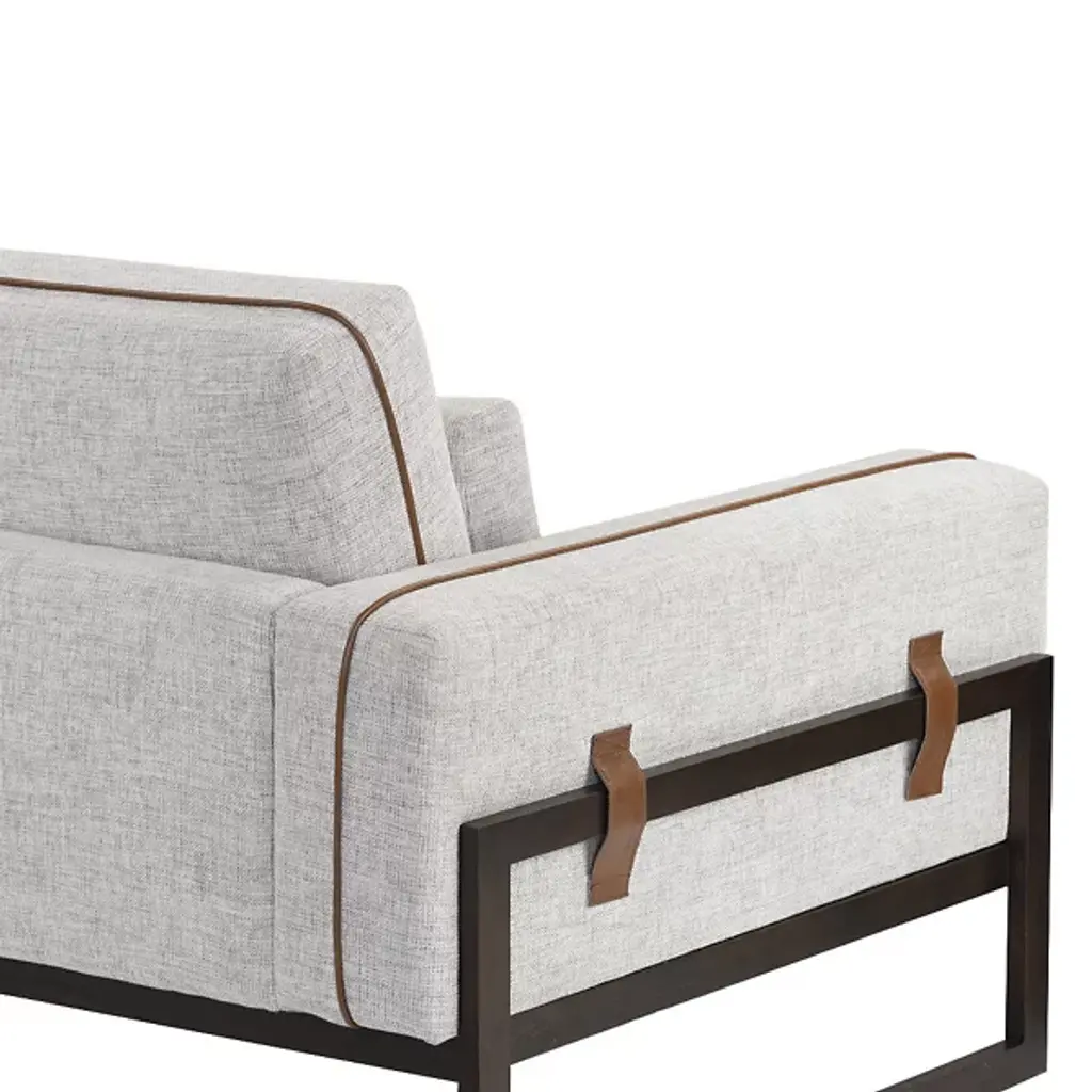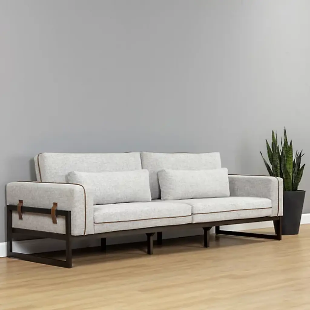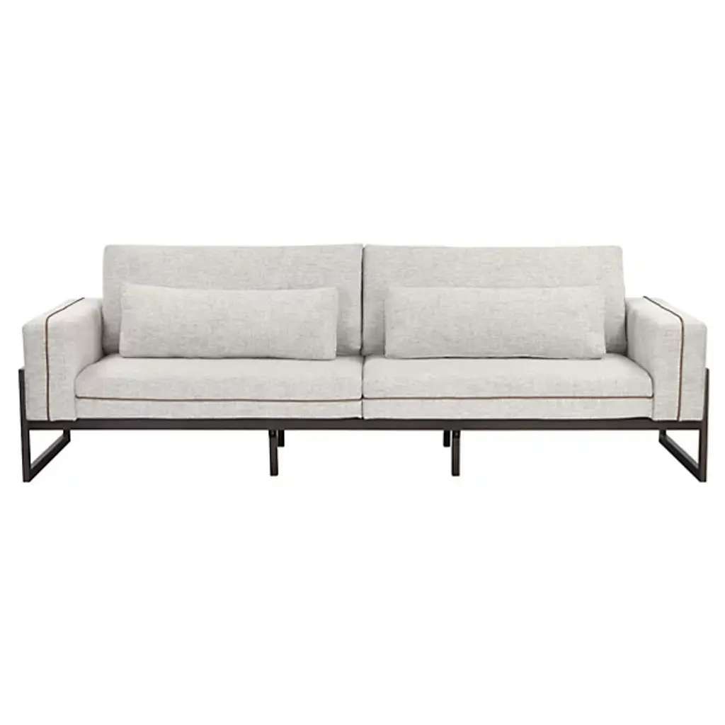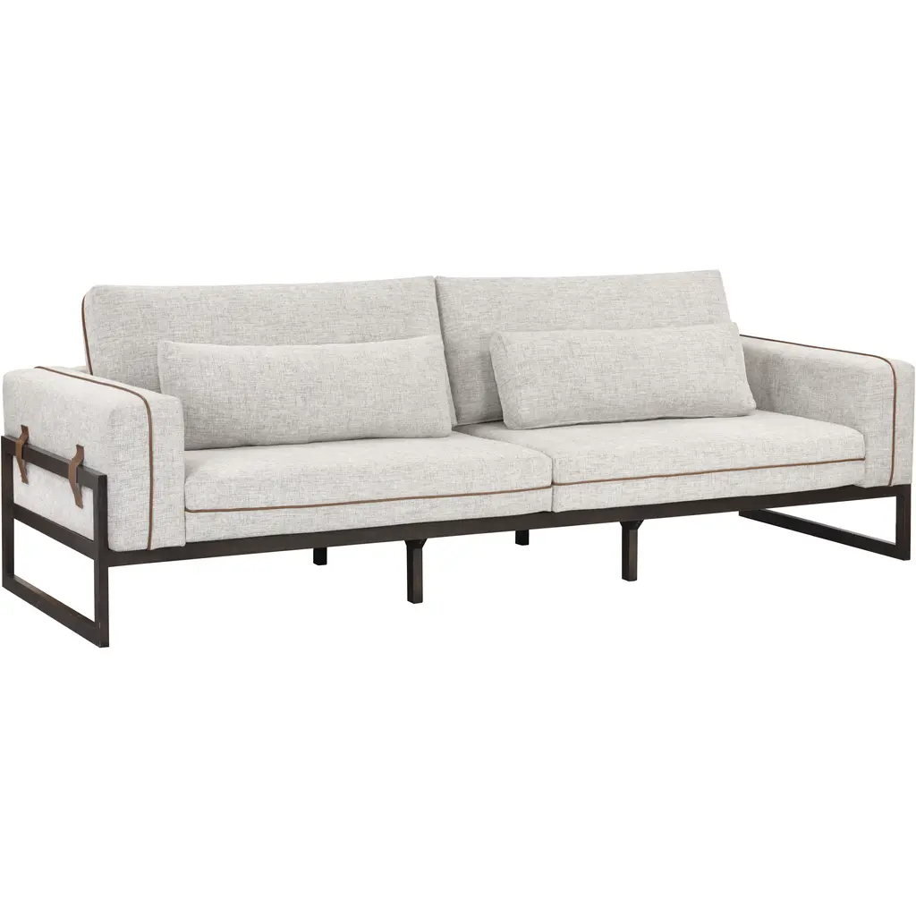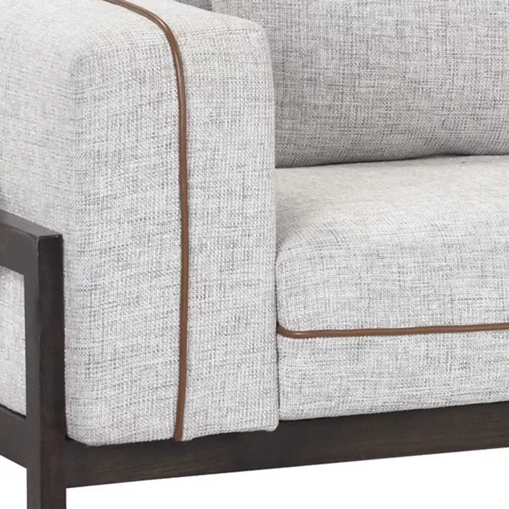 The Belinda Sofa from Sunpan reveals its wooden frame structure along the sides and back, creating an open framework that supports the upholstered seating areas. This exposed construction method highlights the joinery details while maintaining clean geometric lines. The cushioned sections sit within the wooden framework rather than covering it entirely, creating distinct zones for comfort and structure. Leather piping traces the seating edges, providing material contrast against the textile upholstery. The leg construction uses solid wood throughout the visible frame elements.