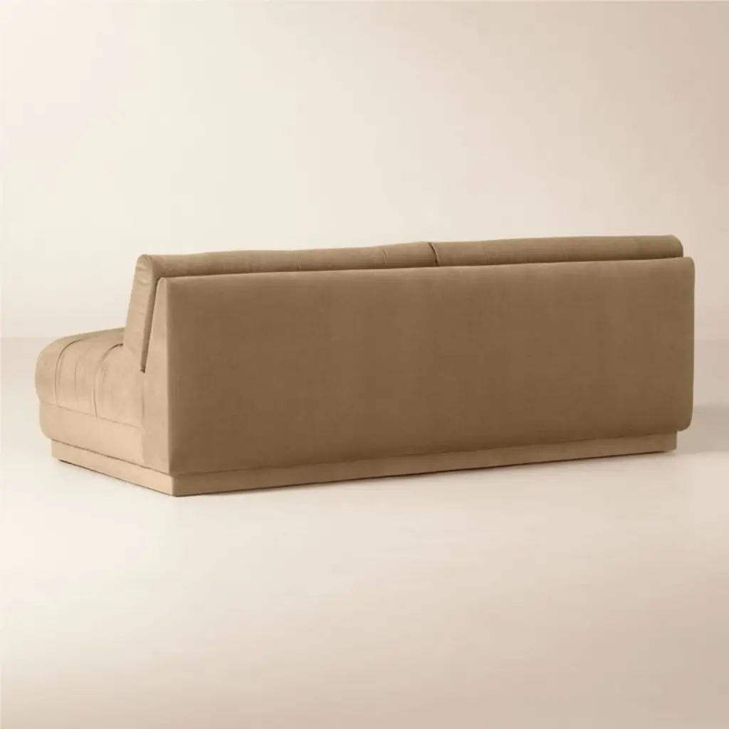 Hand-assembled by skilled artisans in North Carolina, tufted sofa by Melbourne-based design studio VUUE is scaled deep for lounging. A CB2 favorite, the design is a modern take on low-slung midcentury silhouettes with exaggerated tufting and soft latte brown velvet upholstery. A slim plinth base supports the expansive frame constructed with hardwood certified sustainable by the Forest Stewardship Council (FSC). CB2 exclusive.