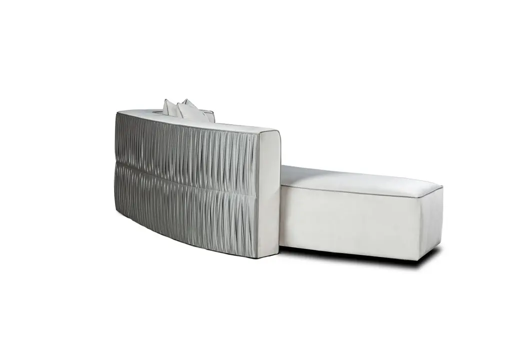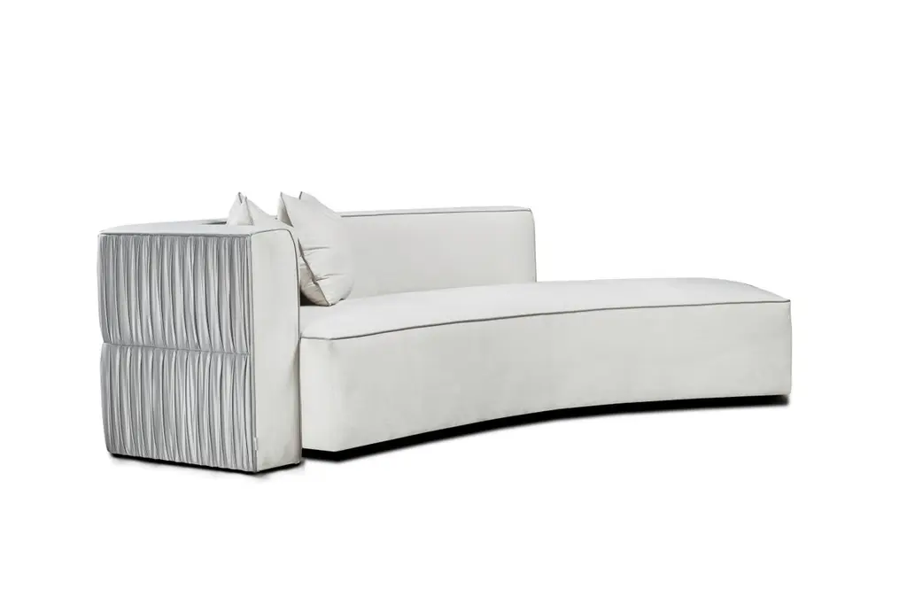 Belong Curve Sofa by Memoir EssenceDimensions: D 130 x W 270 x H 75 cm.Materials: Velvet SCSS, satin AB and lacquer.Also available in client's fabric. Please contact us.Belong sofa is an opulent and strong round shaped sofa. Combining pleated back and sides to give your projects a detail in every angle and make the sofa belong to the projected space.Memoir Essence Interiors has been writing its memoirs day by day, inspired in every detail lived through a feminine world, this world brings the most delicate imaginary. Jewelry, fashion, architecture, music, art and materials are Memoir’s inspirations to materialize a collection of design pieces of furniture, upholstery, lighting and accessories.The use of noble materials like marble, brass, veneers, gold and silver leaf, Swarovski crystals as other decorative and fine materials, combined with handwork techniques as casted brass, hand-whickered fabric ribbons, gold leaf appliance, marble cutted and puzzled pieces, provide the needed essence to tell memoirs through the designed pieces and the interiors they fulfill.This collection mostly handmade and focused on details and material nobility is made in Portugal, bringing handwork techniques that are part of Portuguese history, applied in a current and differentiated way, delivering timeless pieces to your special projects. Acquire Memoir is the opportunity to travel through the feminine essence over design and experience a unique “memoir” of timelessness and exclusivity.Writing is first chapter in 2016, after a journey of inspirational research, forecasting and design, Memoir made its first appearance at Maison et Objet, Paris.Since then Memoir is “writing” memories adding new materials, designs, techniques and appearances around the world, as in Paris, London or UAE.Memoir will continue this journey, always motivated by the inspiration possibilities in the many delicate details found in feminine world.Tell your memoires with this collection and be a memorialist yourself…