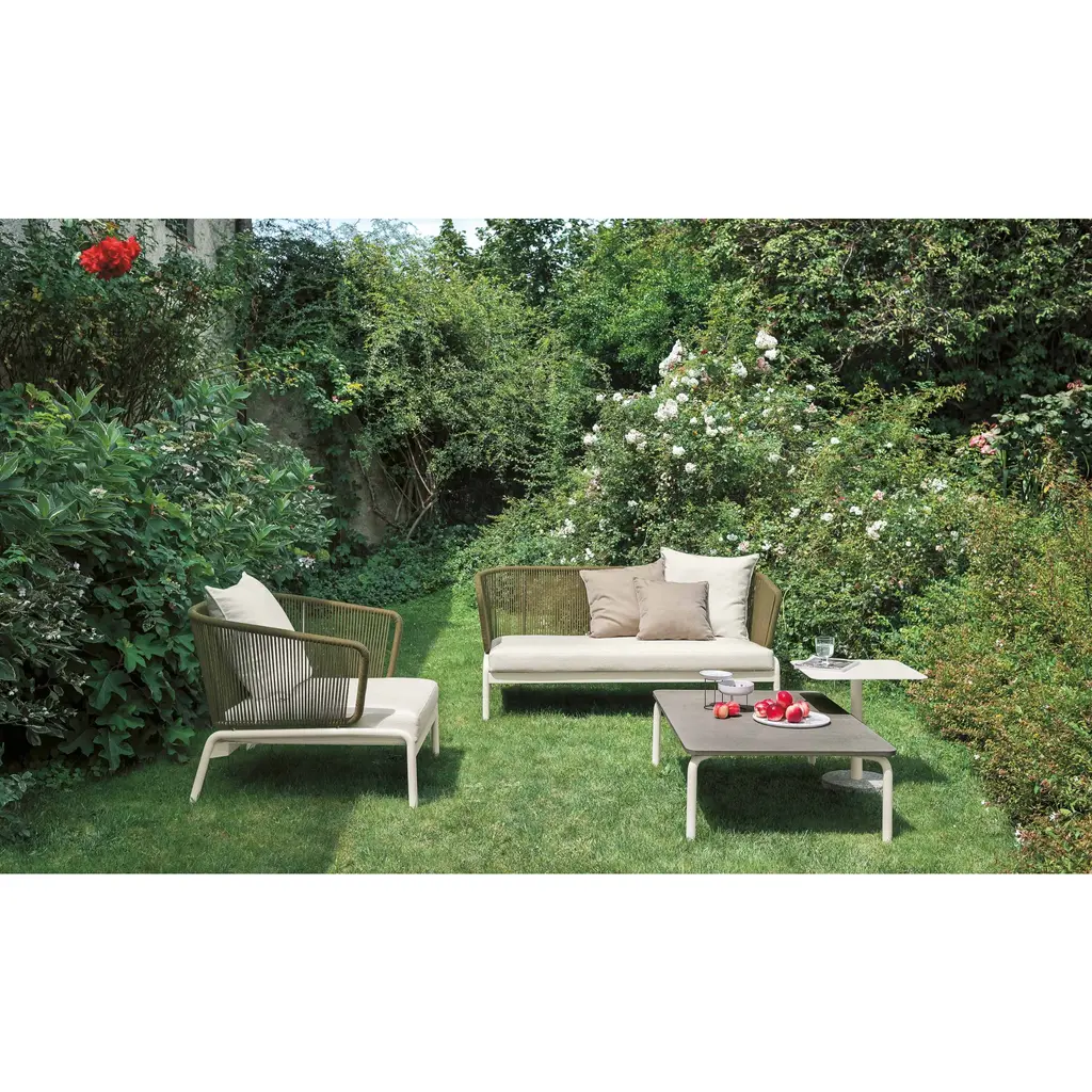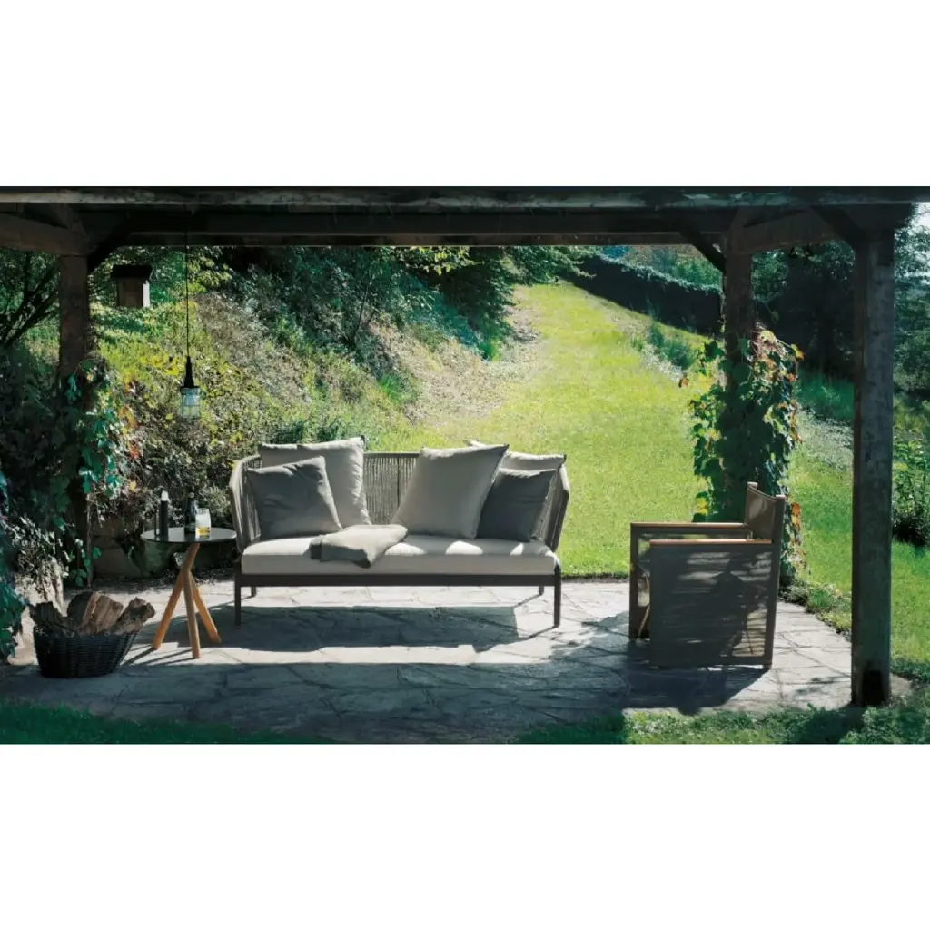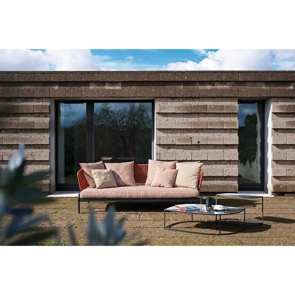 Spool gives life to a new, vibrant story composed of weaves and attractive shadow effects created by the light that filters from the sections of the backrest: the result is a collection with an explosive design, a perfect balance between strength and lightness that doesn't neglect the comfort of the seating that can accommodate a large number of soft cushions. In addition to the two variants of backrest in rope or padded tubular, there is also a version made with the elegant and soft Batyline upholstery, enveloping and sober, available in a wide palette of tones.