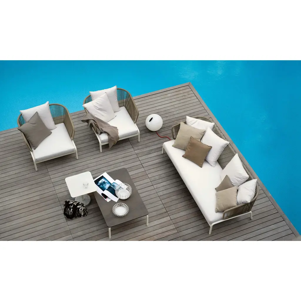 Spool gives life to a new, vibrant story composed of weaves and attractive shadow effects created by the light that filters from the sections of the backrest: the result is a collection with an explosive design, a perfect balance between strength and lightness that doesn't neglect the comfort of the seating that can accommodate a large number of soft cushions. In addition to the two variants of backrest in rope or padded tubular, there is also a version made with the elegant and soft Batyline upholstery, enveloping and sober, available in a wide palette of tones.