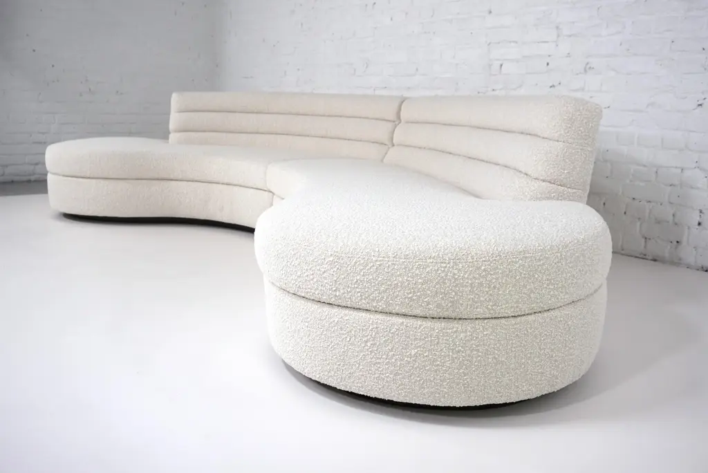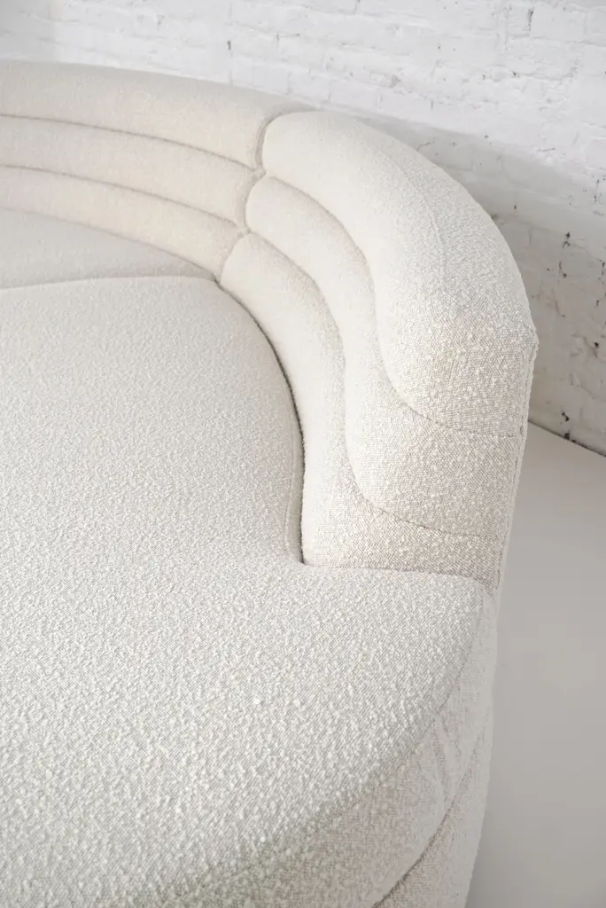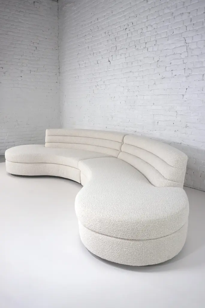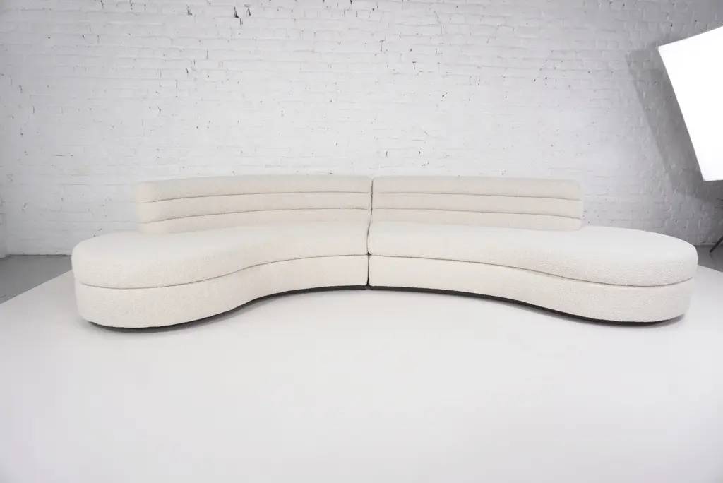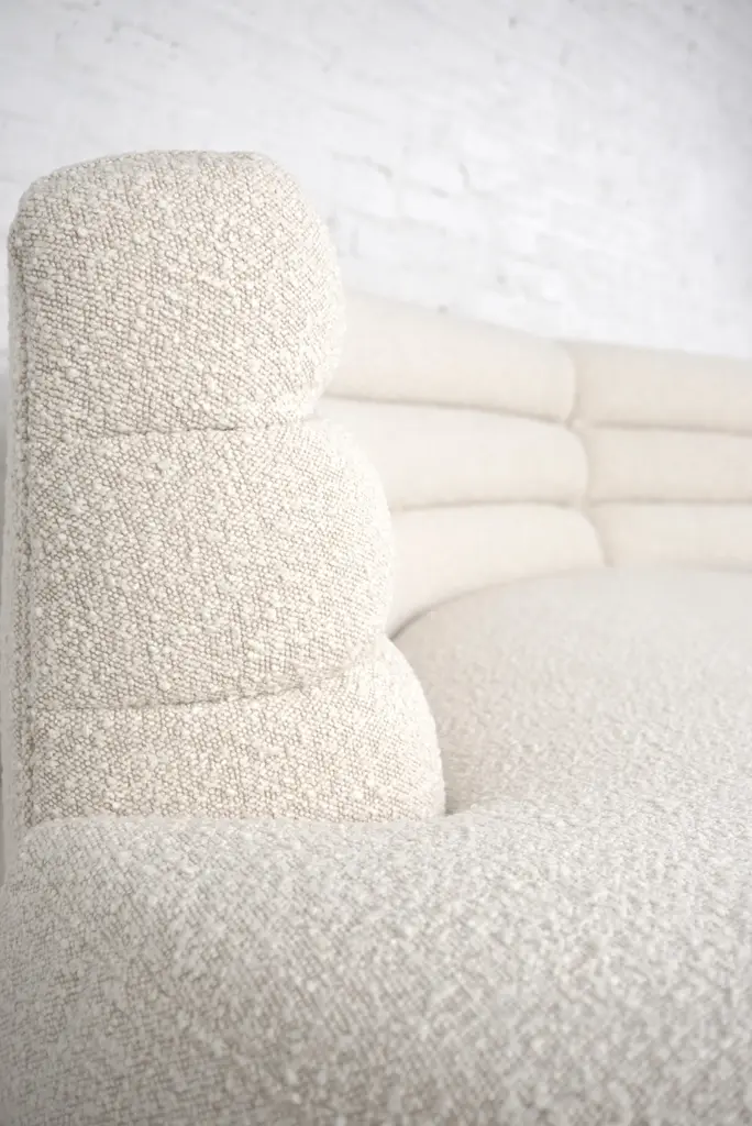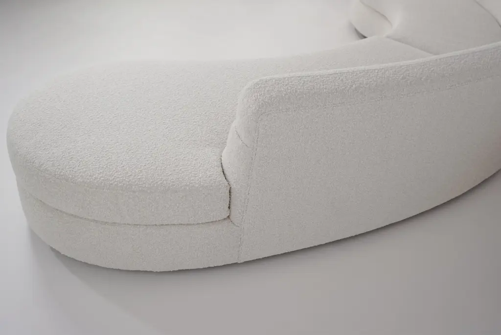 This Ben curved sofa is upholstered in a beige textured fabric. with welcoming, organic and rounded shapes, it is extremely comfortable Stamped by Maker