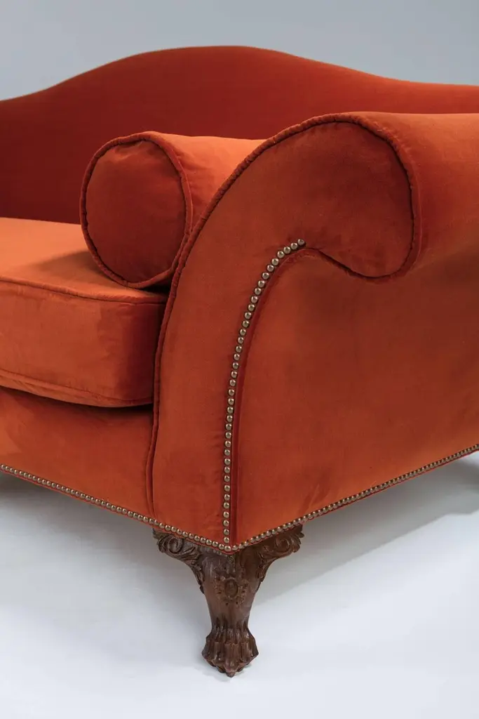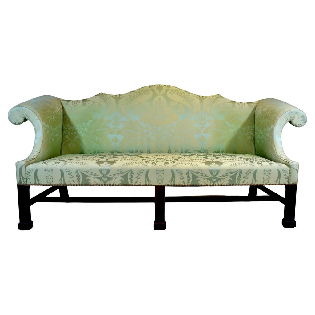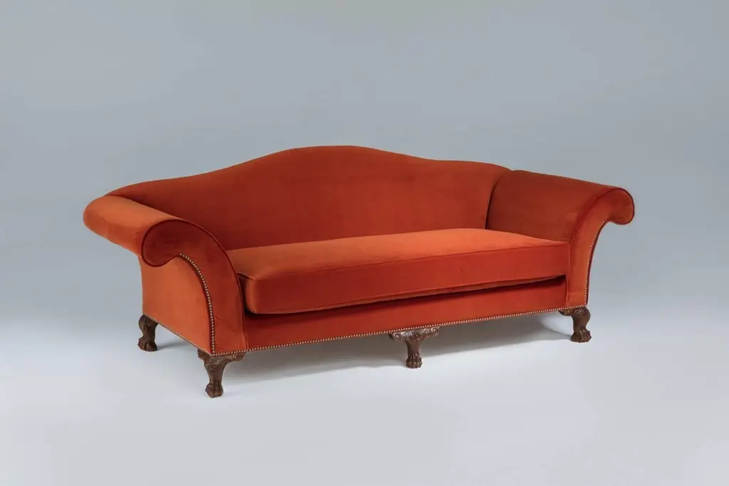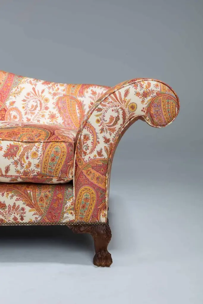 With sweeping back and everted scrolling arms, with one seat cushion or two, the oak cabriole legs carved with claw and ball. £3700 plus 13.5-15 m of fabric. Example here upholstered in Etro Tropico, £4600.