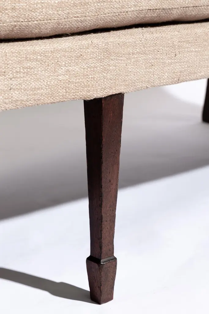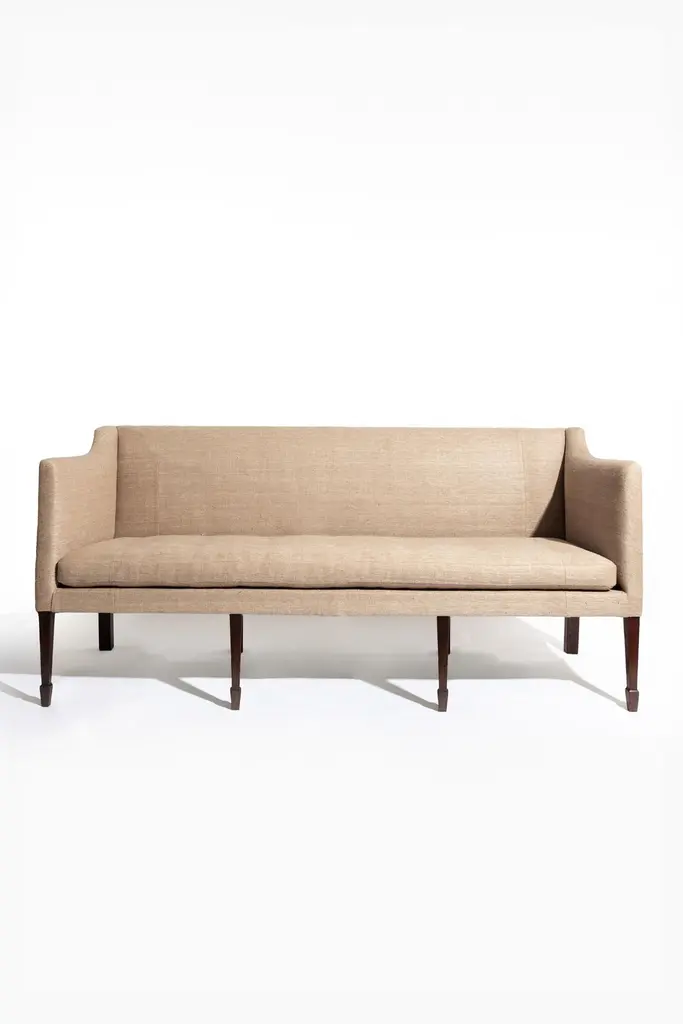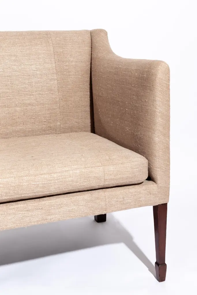 A bespoke sofa based on a George III original from our antique collection. Hand made and traditionally upholstered in England.The high-back and swept arms above a rectangular seat with squab cushion on four elegant tapering legs terminating with Chippendale style spade feet. Made with a deeper seat than the antique original for comfort.Finished in antique mahogany as standard, with custom finishes and dimensions available.